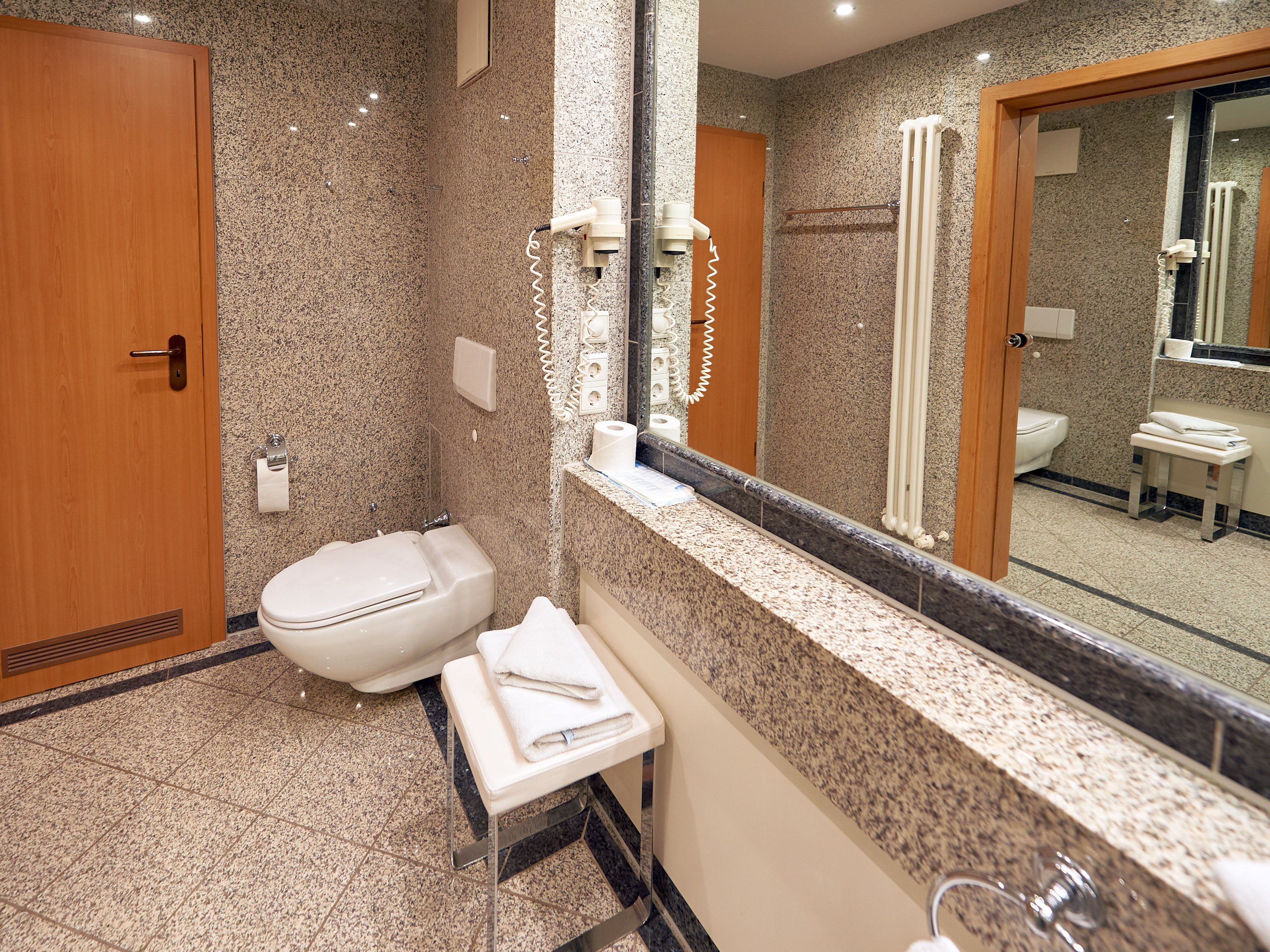 Das mit Granitfliesen, großen Spiegelflächen und viel Licht aufwändig inszenierte Badezimmer verfügt über Dusche/WC, einen beleuchteten Waschtisch inkl. Kosmetikspiegel und Fön sowie einen beheizbaren Handtuchtrockner.