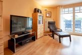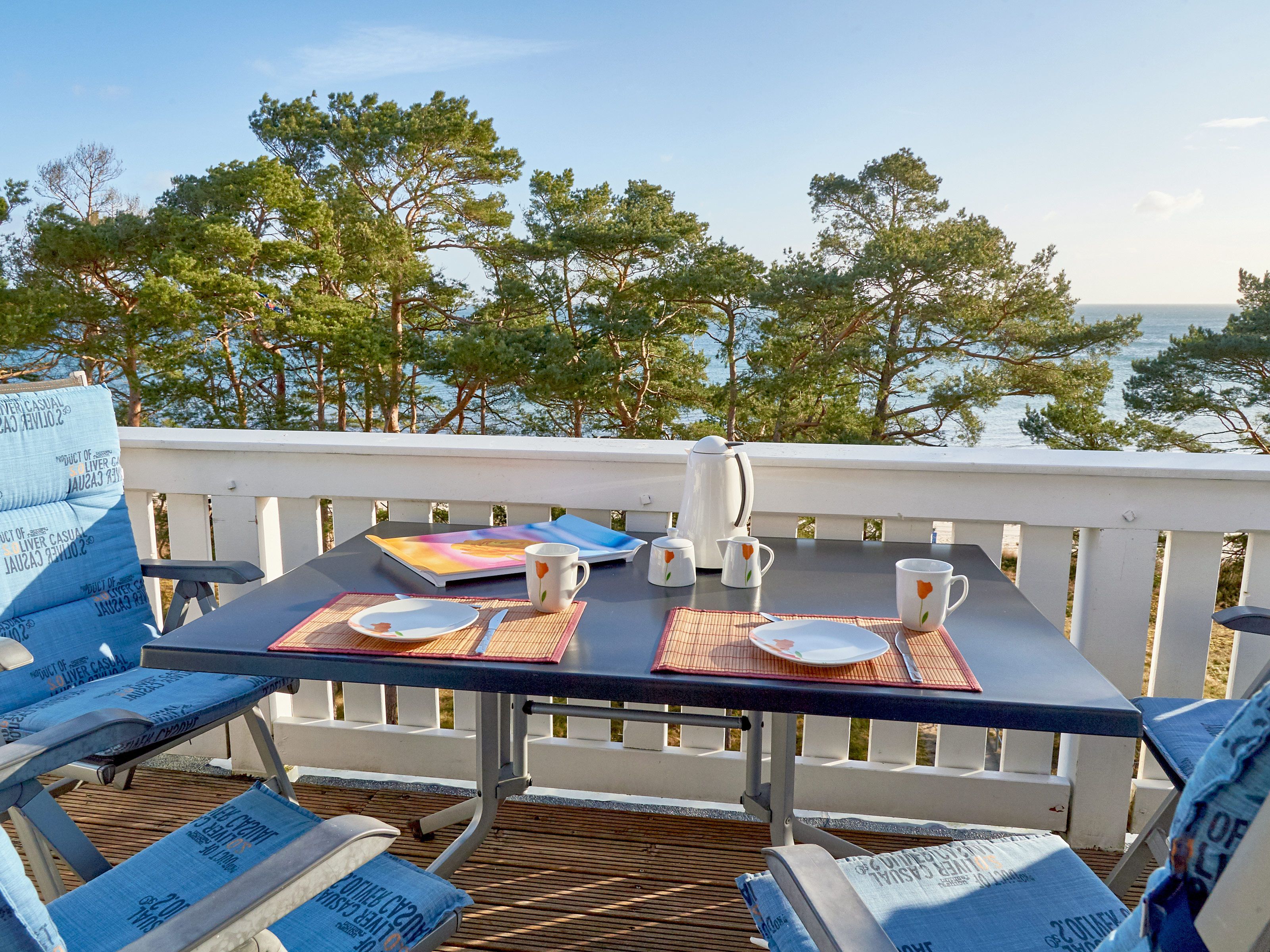 Die harmonisch in den Raum integrierte Einbauküche ist mit einem Cerankochfeld, einem Backofen, einer Mikrowelle, Dunstabzugshaube, Spülmaschine, Kaffeemaschine, Kühlschrank mit Tiefkühlfach, Toaster, Wasserkocher und diversem Kleininventar ausgestattet. Speisen können Sie ganz nach Lust und Laune entweder am Esstisch drinnen oder draußen auf dem Balkon an der frischen Ostseeluft.