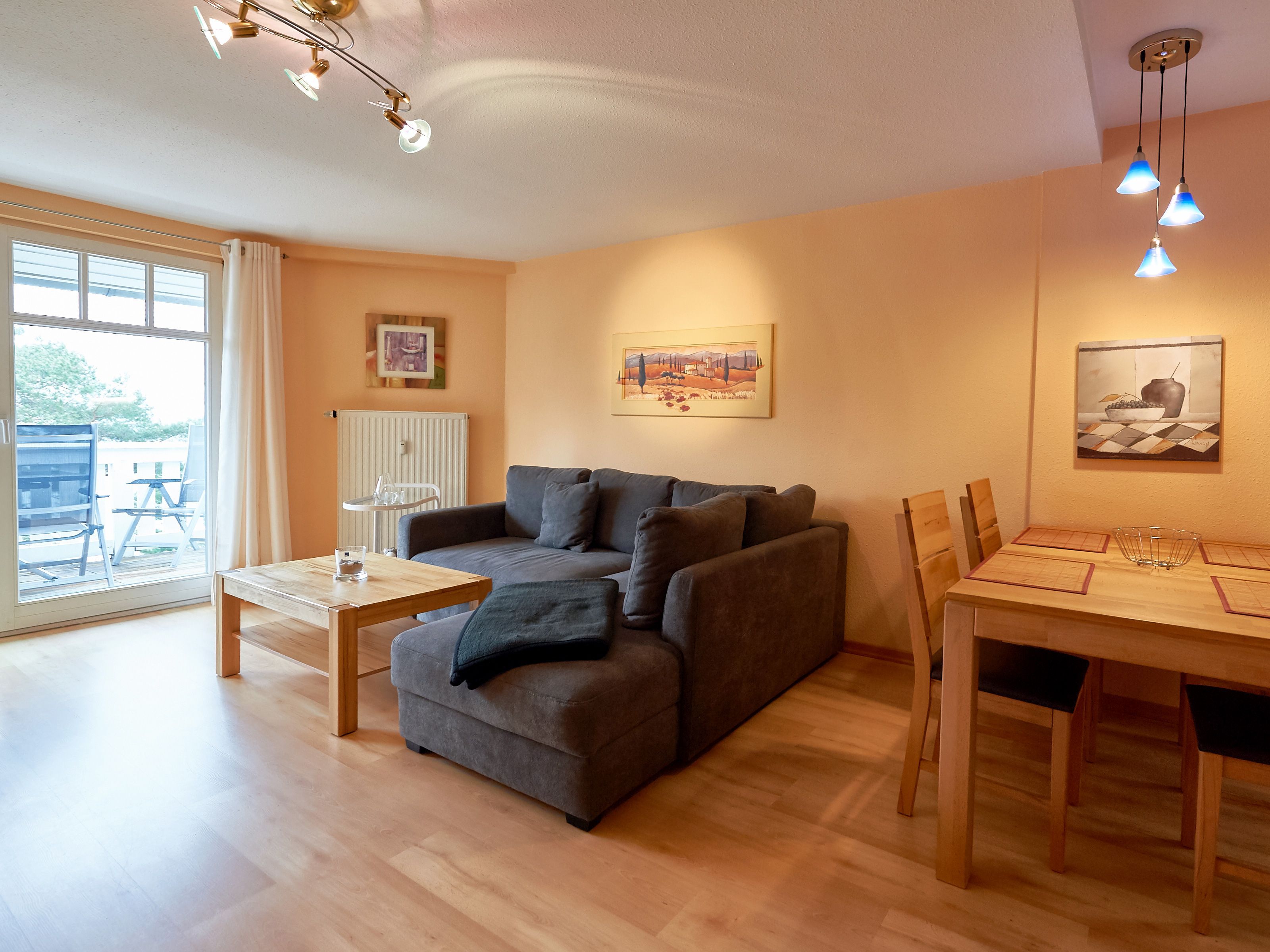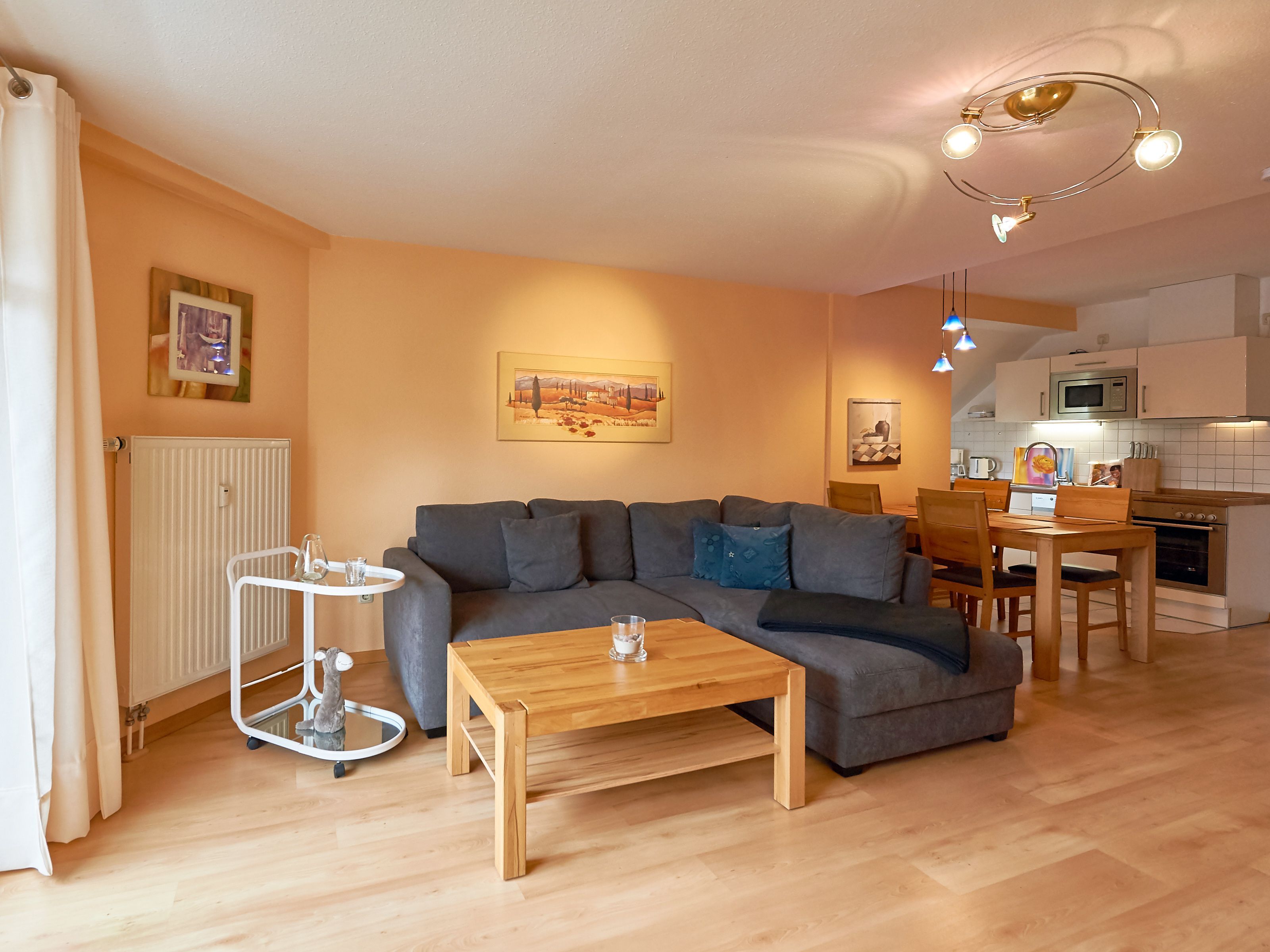 Der wundervoll geräumige Wohnraum als Herz Ihres Zuhauses auf Zeit verfügt vor der seeseitigen Fensterfront über eine bequeme Eckcouch (Aufbettungsmöglichkeit für zwei Personen), einen großen Flachbild-TV nebst Radio/CD-Player sowie eine kleine Literatur-Auswahl.