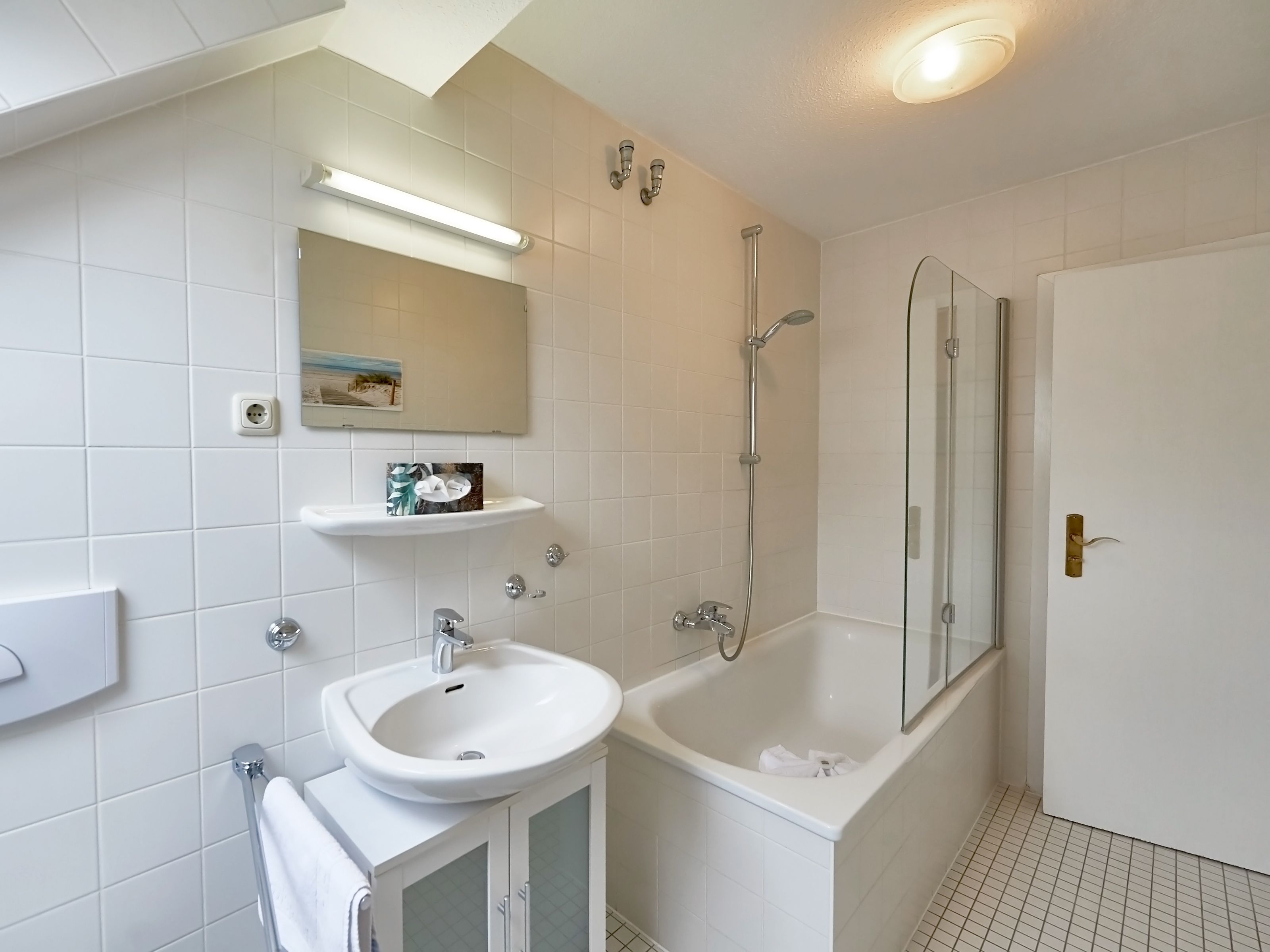 Auch das hell geflieste Tageslichtbad Ihres Appartements weiß zu überzeugen. Die Badewanne ist zum bequemen Duschen teilweise verglast. Am beleuchteten Waschtisch stehen Ihnen ein Haartrockner und genügend Ablageflächen für Ihre Utensilien zur Verfügung.
