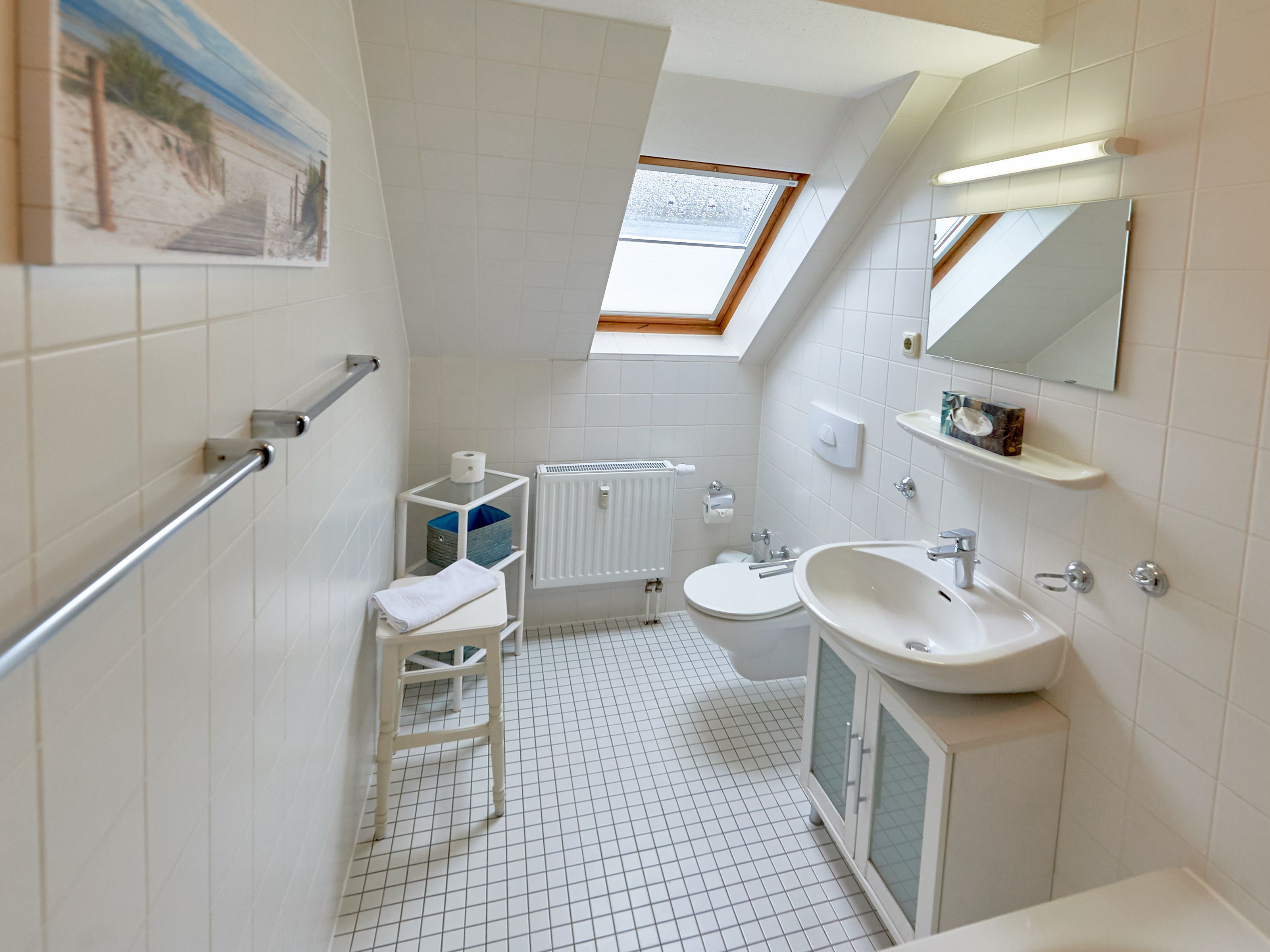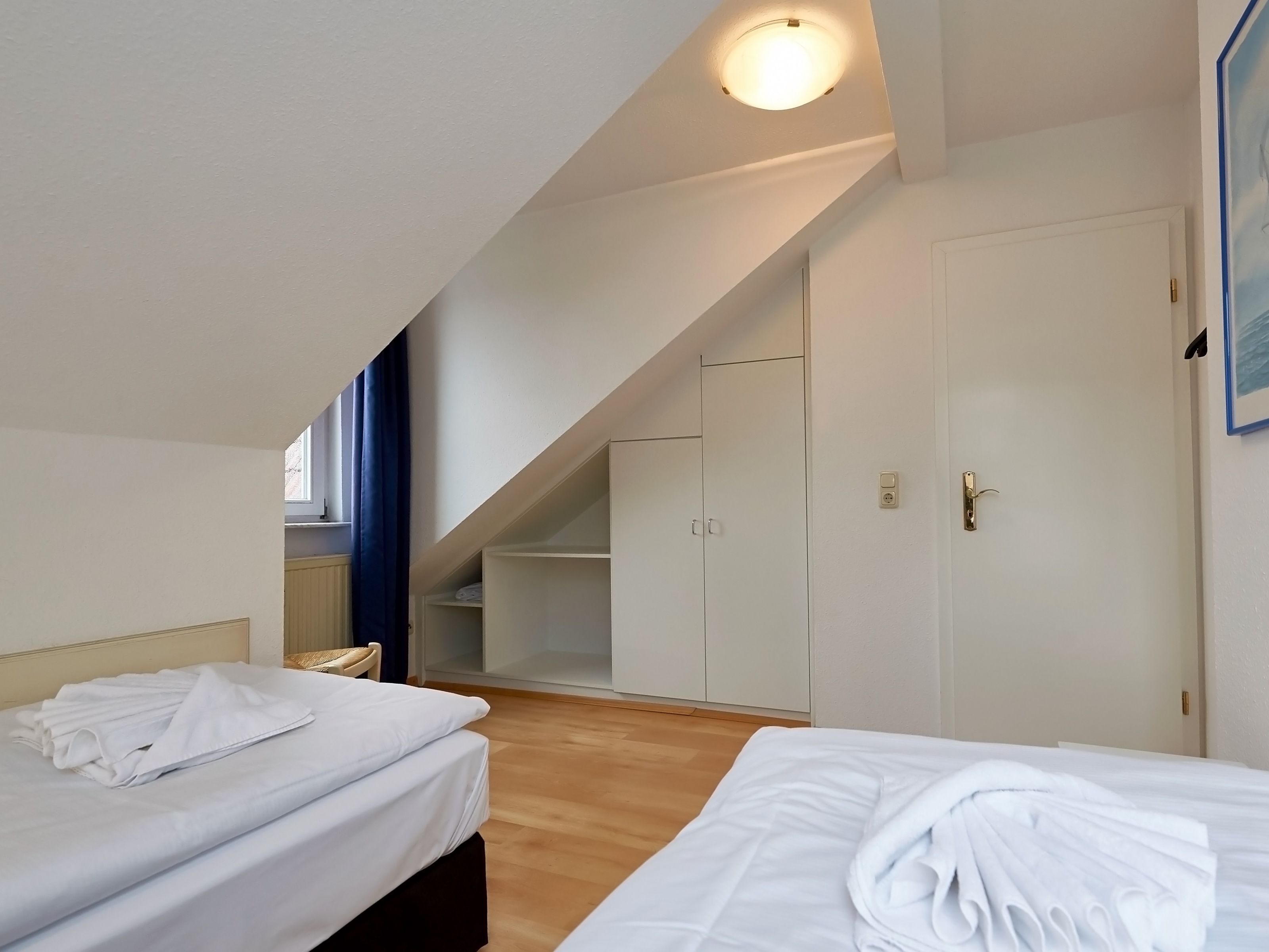 Das unter leichten Dachschrägen gelegene Schlafzimmer verfügt über zwei bequeme Einzelbetten (90 x 200 cm), die wahlweise einzeln oder als Doppelbett gestellt werden können. Beste Voraussetzungen also für süße Träume und erholsamen Schlaf nach einem erlebnisreichen Urlaubstag. Ein geräumiger Kleiderschrank bietet Platz für Ihre Urlaubsgarderobe.