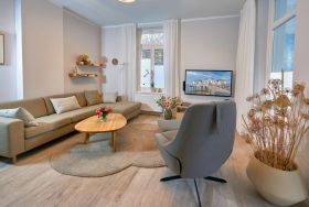 Das Appartement unterteilt sich in ein Wohnzimmer mit separater Küche, einen Wintergarten (Veranda), ein Schlafzimmer, ein Badezimmer und einen Flurbereich. Zu den besonderen Annehmlichkeiten gehören neben dem überaus hochwertigen und sorgsam ausgesuchten Mobiliar gleich zwei großformatige, smarte OLED-55“-Fernsehgeräte im Wohn- und im Schlafzimmer, ein BOSE-Soundspeaker (Radio und Streaming), sowie kostenfreies W-LAN mit schneller 50 Mbit-Leitung.