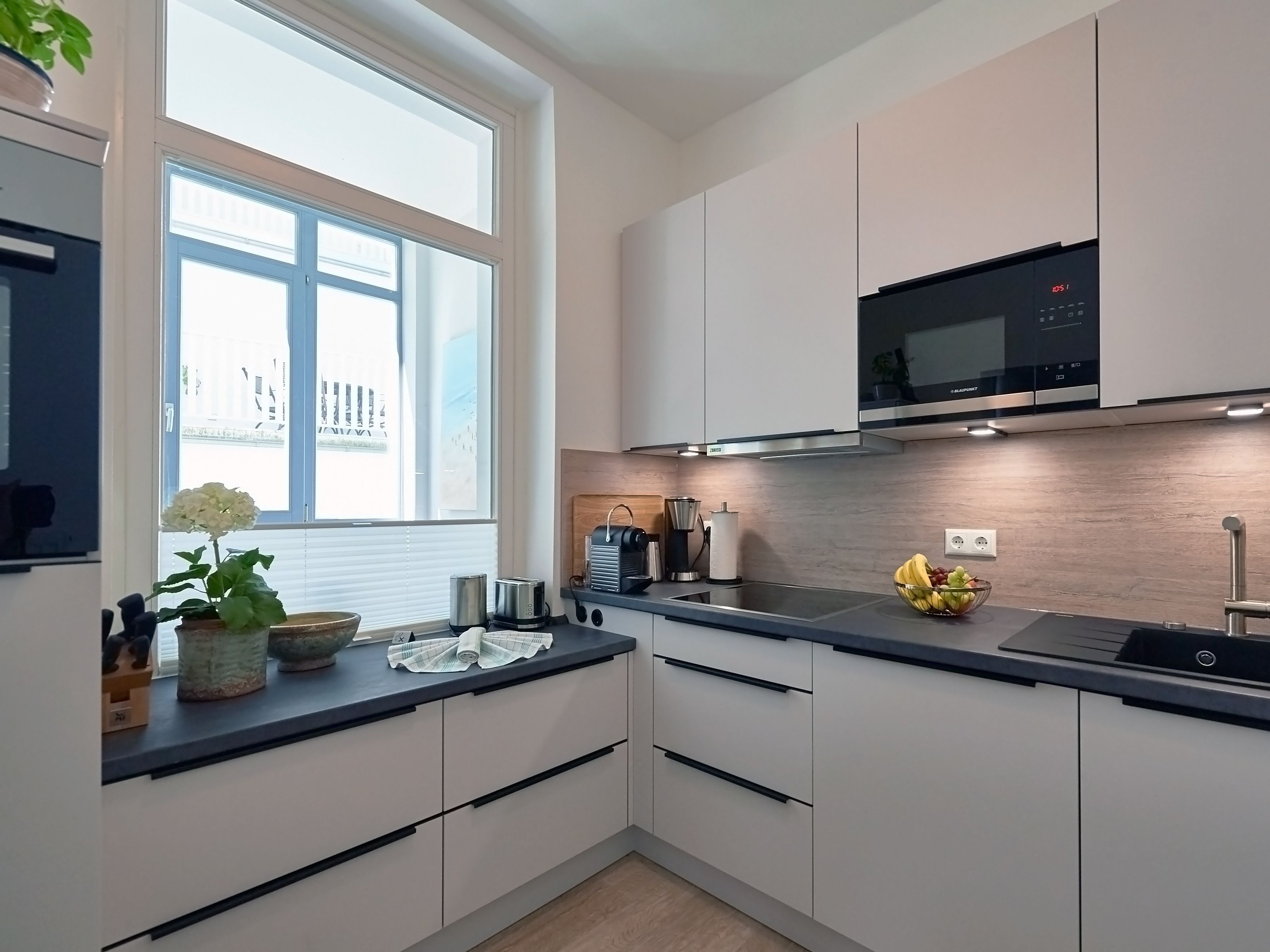 Die hochwertige Küche überzeugt mit allen Raffinessen, u.a. einem 4-Platten-Induktionherd inkl. Backofen, einem geräumigen Kühlschrank mit Gefrierfach, einer Filterkaffeemaschine sowie einem Nespresso-Kapselautomat, außerdem eine Mikrowelle, Toaster, Wasserkocher und ein geräumiger Geschirrspüler. Selbstverständlich gibt es auch genügend Geschirr, Besteck, Töpfe, Pfannen und andere Kleinteile, so dass man sich bequem selbst „bekochen“ kann, wenn man nicht gerade unterwegs auf der Insel einkehrt.
