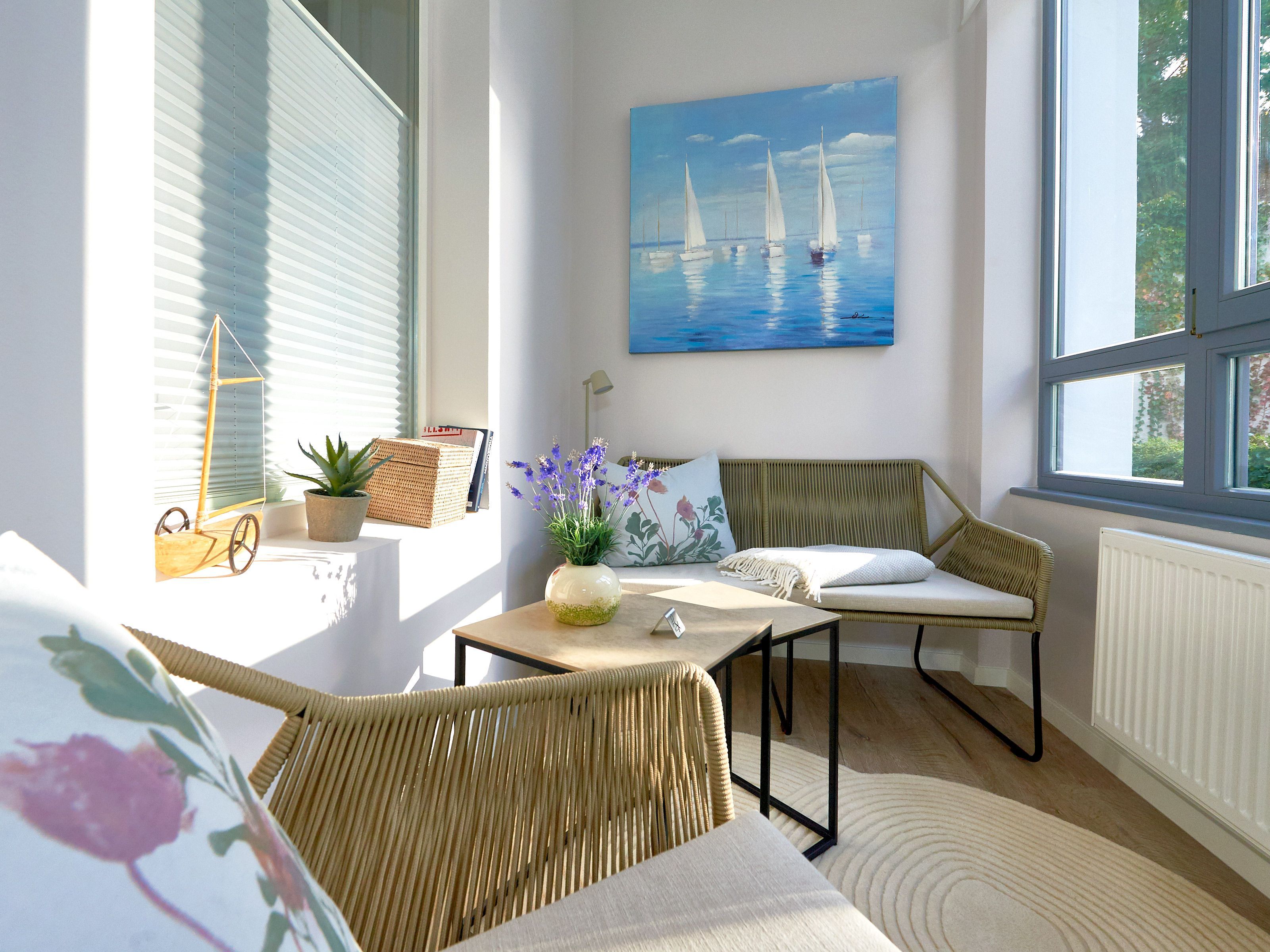 Das Appartement unterteilt sich in ein Wohnzimmer mit separater Küche, einen Wintergarten (Veranda), ein Schlafzimmer, ein Badezimmer und einen Flurbereich. Zu den besonderen Annehmlichkeiten gehören neben dem überaus hochwertigen und sorgsam ausgesuchten Mobiliar gleich zwei großformatige, smarte OLED-55-Fernsehgeräte im Wohn- und im Schlafzimmer, ein BOSE-Soundspeaker (Radio und Streaming), sowie kostenfreies W-LAN mit schneller 50 Mbit-Leitung.