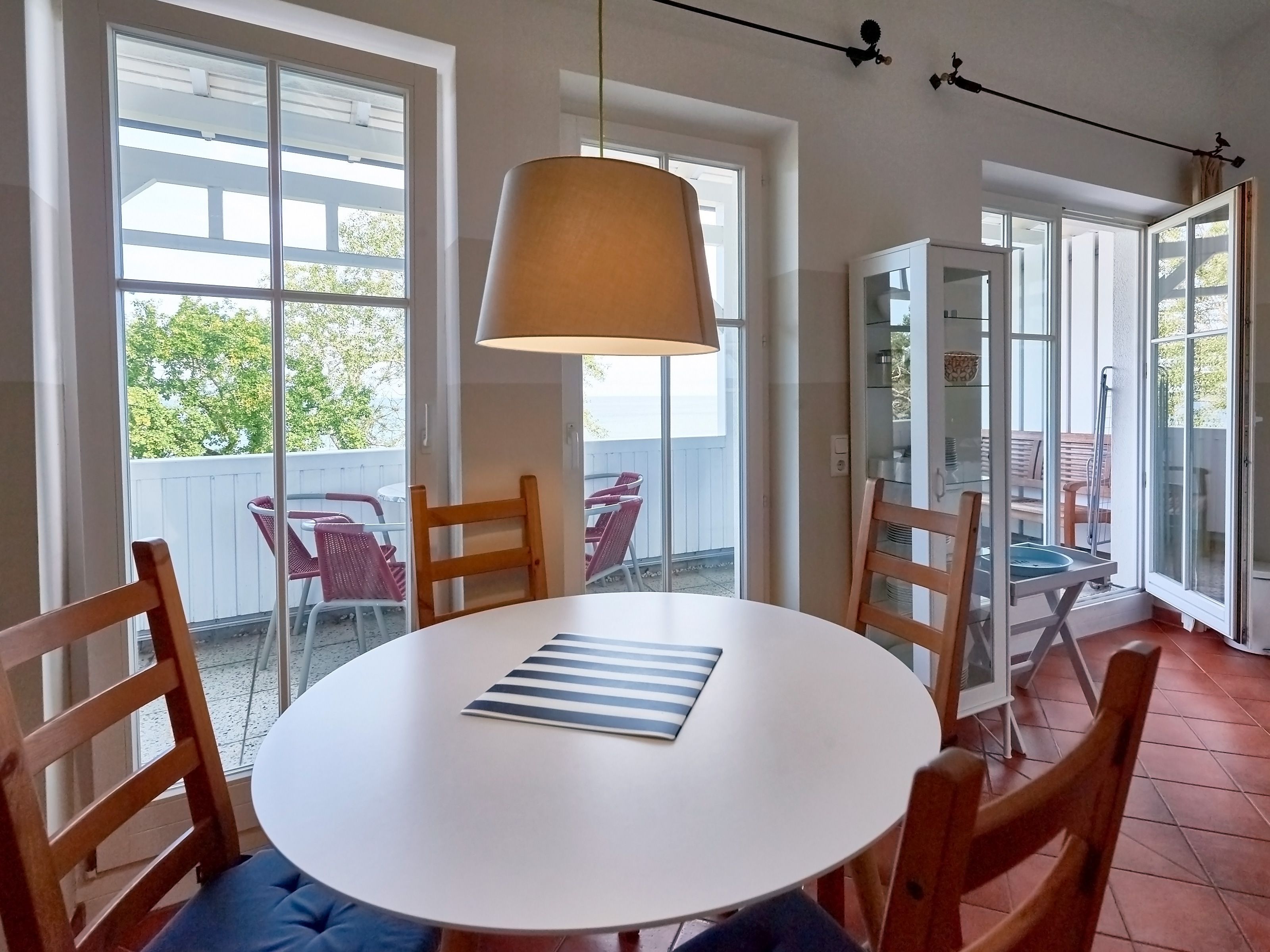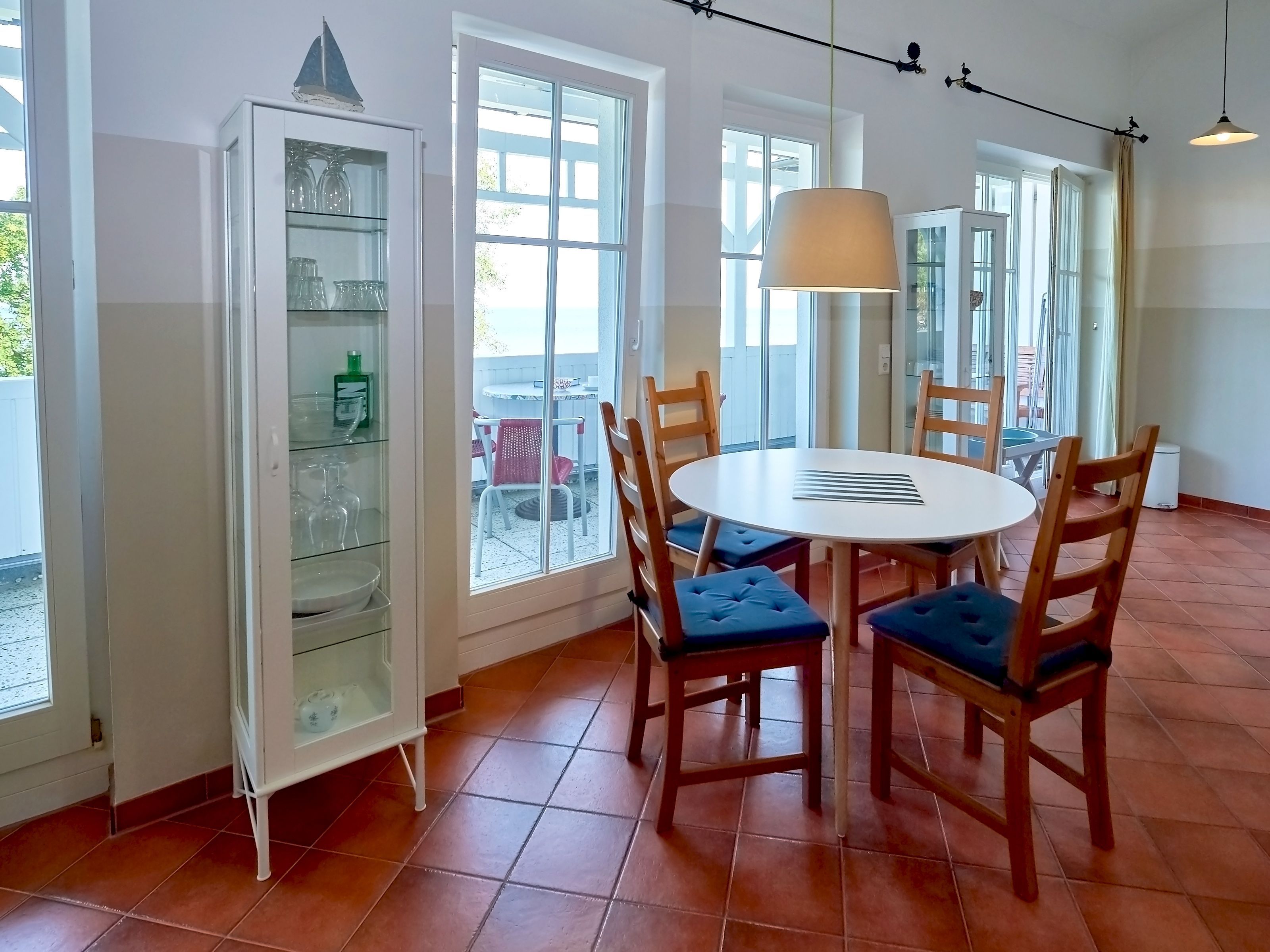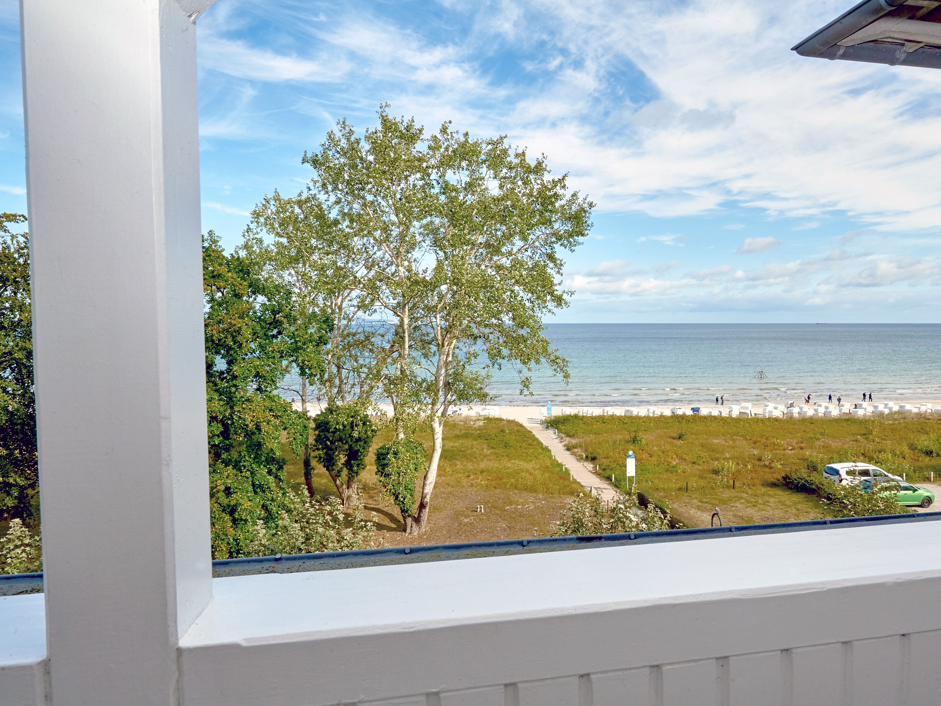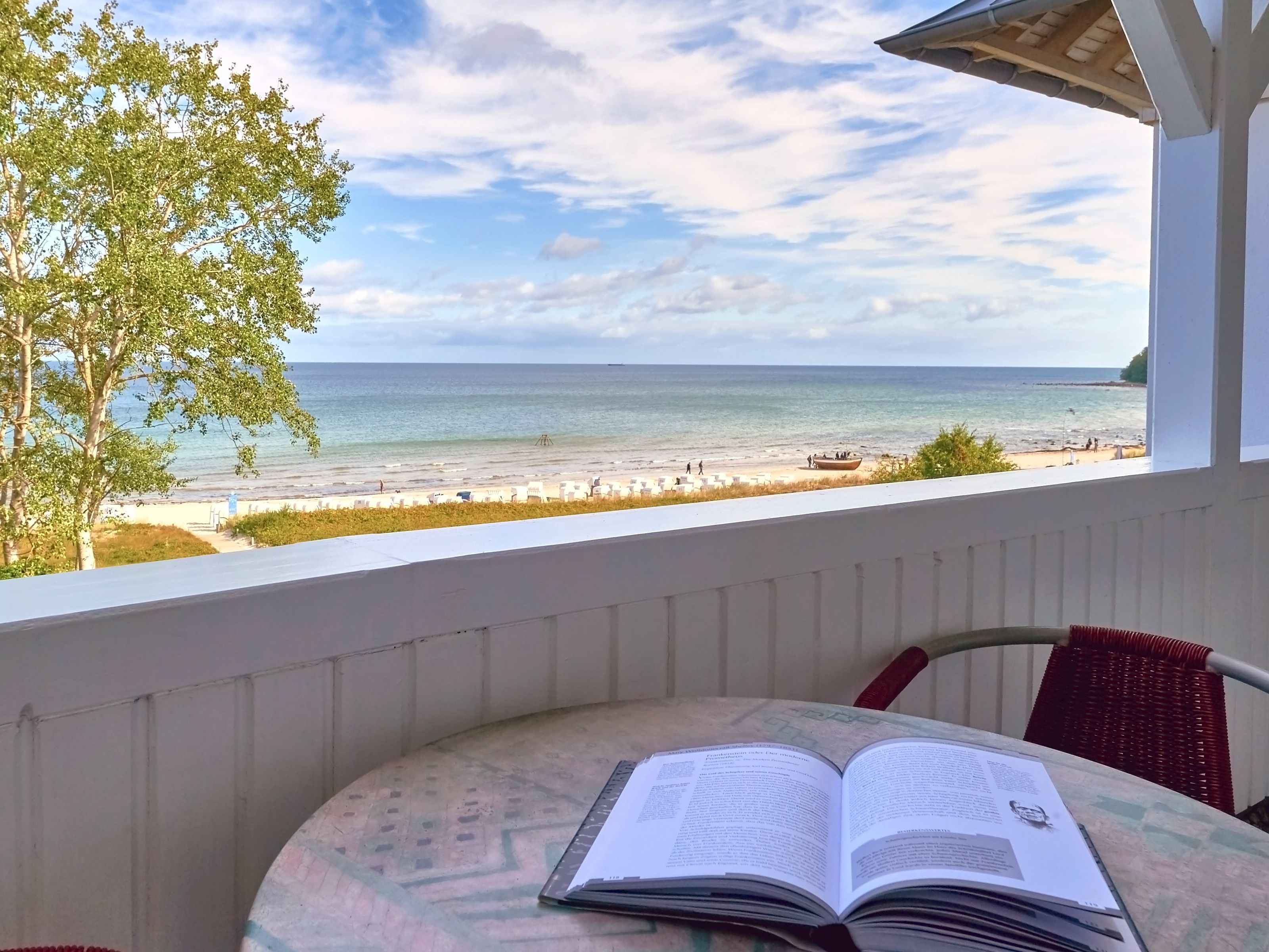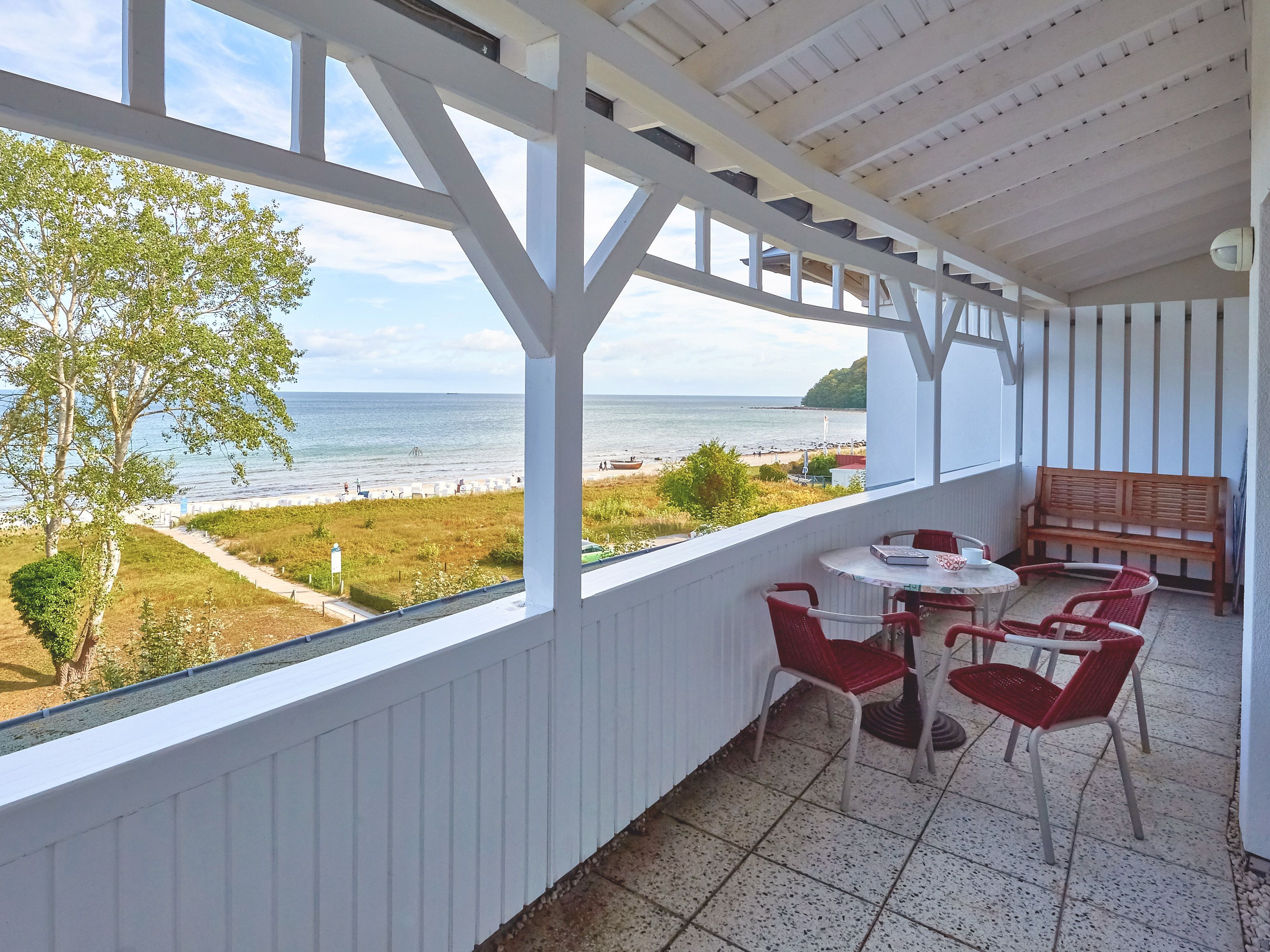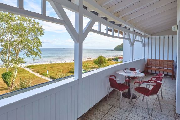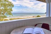 Über die gesamte Breite des kombinierten Wohn- und Essbereichs ist seeseitig ein überdachter Balkon vorgelagert, von dem aus Sie den Blick aus Meer und den Strand genießen können. Einfach traumhaft, so ein Frühstück in der Morgensonne! Geschützt vor Wind und Regentropfen lässt es sich hier zu jeder Jahreszeit wunderbar aushalten und die gesunde Seeluft genießen.