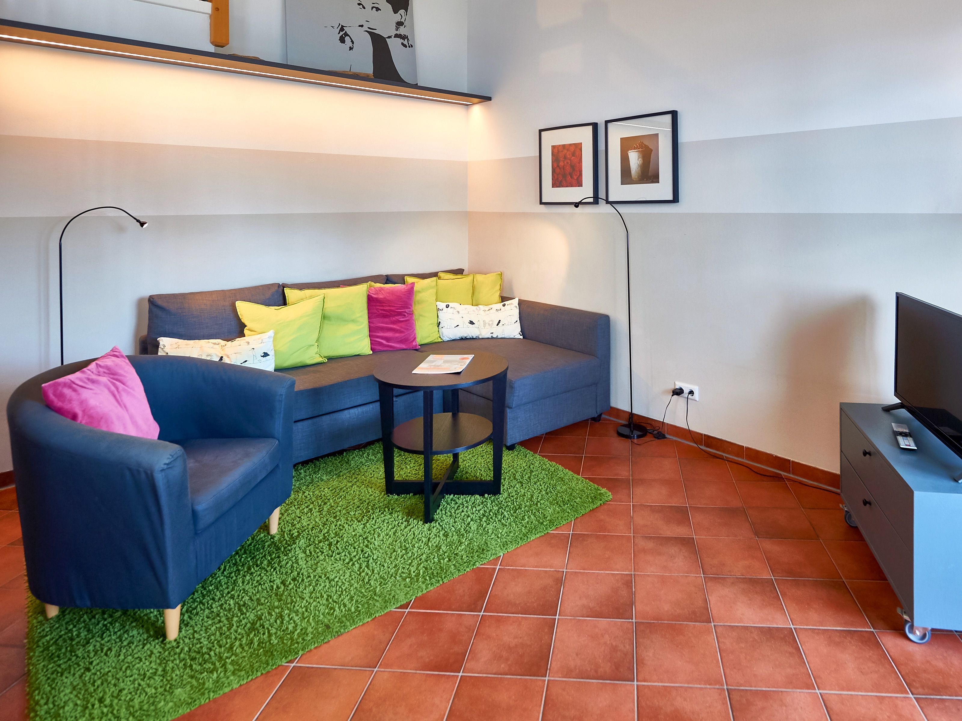Am großen runden Esstisch finden vier Personen bequem Platz. Gemütlich kann man es sich aber natürlich auch auf der Couch vor dem Fernseher machen. Diese dient bei Bedarf als Aufbettungsmöglichkeit für die dritte Person. Eine kleine Buchauswahl zum Schmökern ist in der Wohnung auch vorhanden.