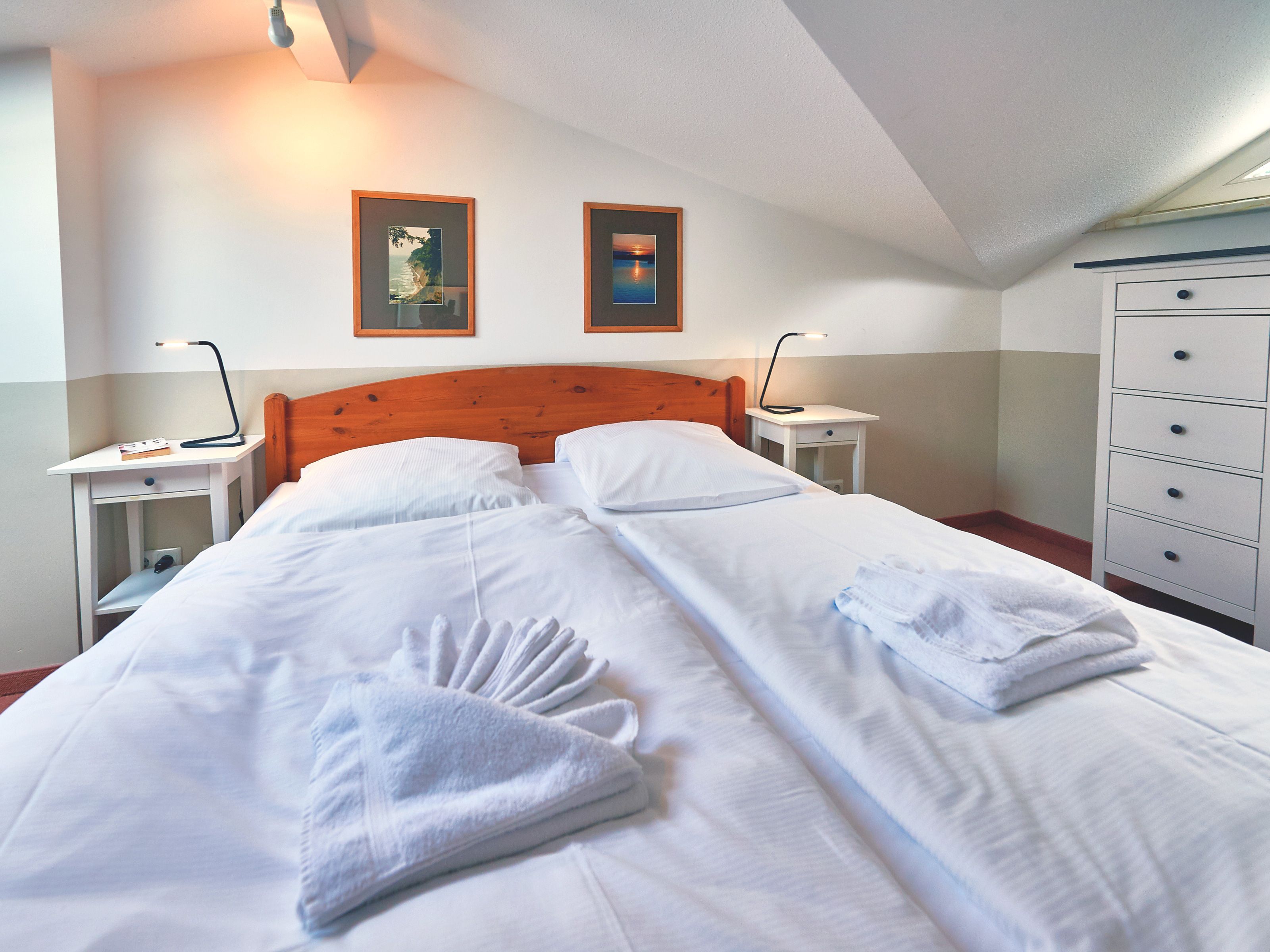 Eine hölzerne Treppe - nichts für Gäste mit körperlicher Beeinträchtigung - führt Sie hinauf in Ihr kuscheliges Schlafgemach unter dem Dach, wo ein komfortables Doppelbett (1,80 x 2,00 m) süße Träume verspricht.