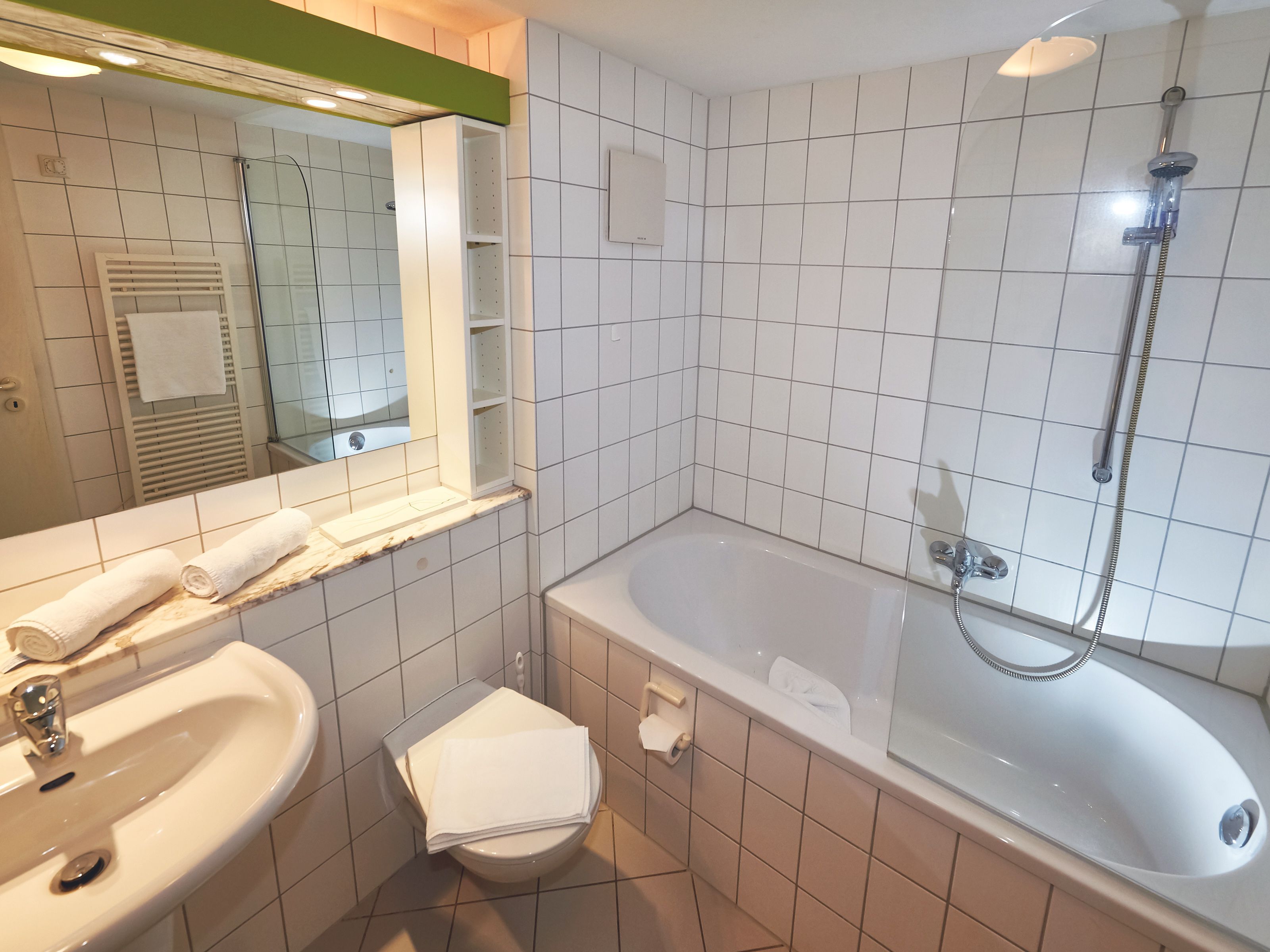 Das geflieste Badezimmer ist mit Badewanne/WC, einem beleuchteten Waschtisch inklusive Fön sowie einem beheizbaren Handtuchtrockner ausgestattet.