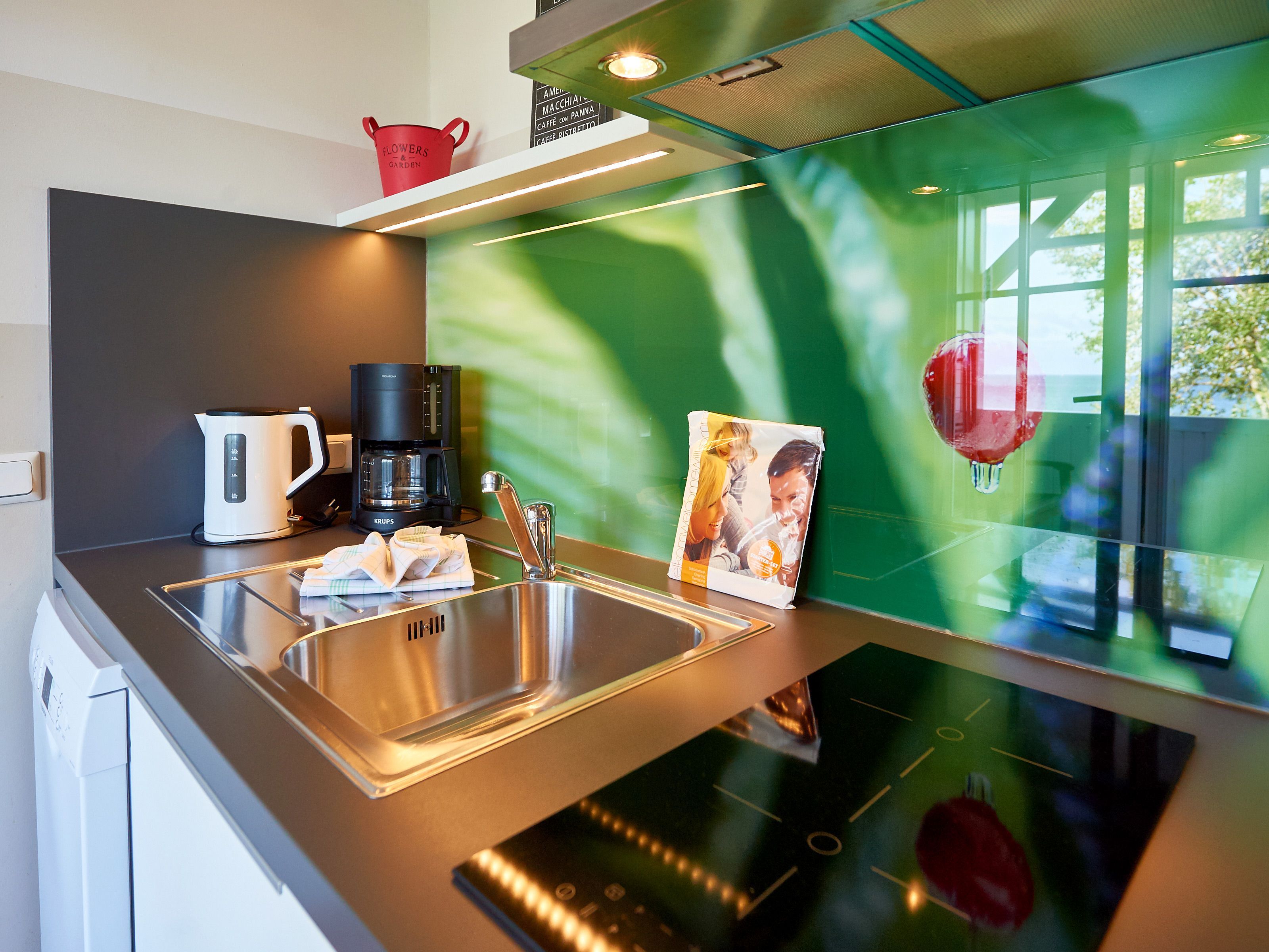 Die offene Küche ist mit einem 2-Zonen-Ceranherd, einem Backofen, Geschirrspüler, einem Kühlschrank mit Gefrierfach sowie Kaffeemaschine und Wasserkocher ausgestattet. Natürlich fehlen auch das nötige Koch- und Essgeschirr sowie genügend Besteck nicht. Wenn man nicht gerade unterwegs in einem der Lokale der Insel einkehrt, kann man sich hier also ganz bequem selbst „bekochen“. Übrigens: Der Bäcker für die frischen Frühstücksbrötchen ist nur ca. 10 Gehminuten entfernt und auch bis zum nächsten Supermarkt ist es nicht allzu weit.