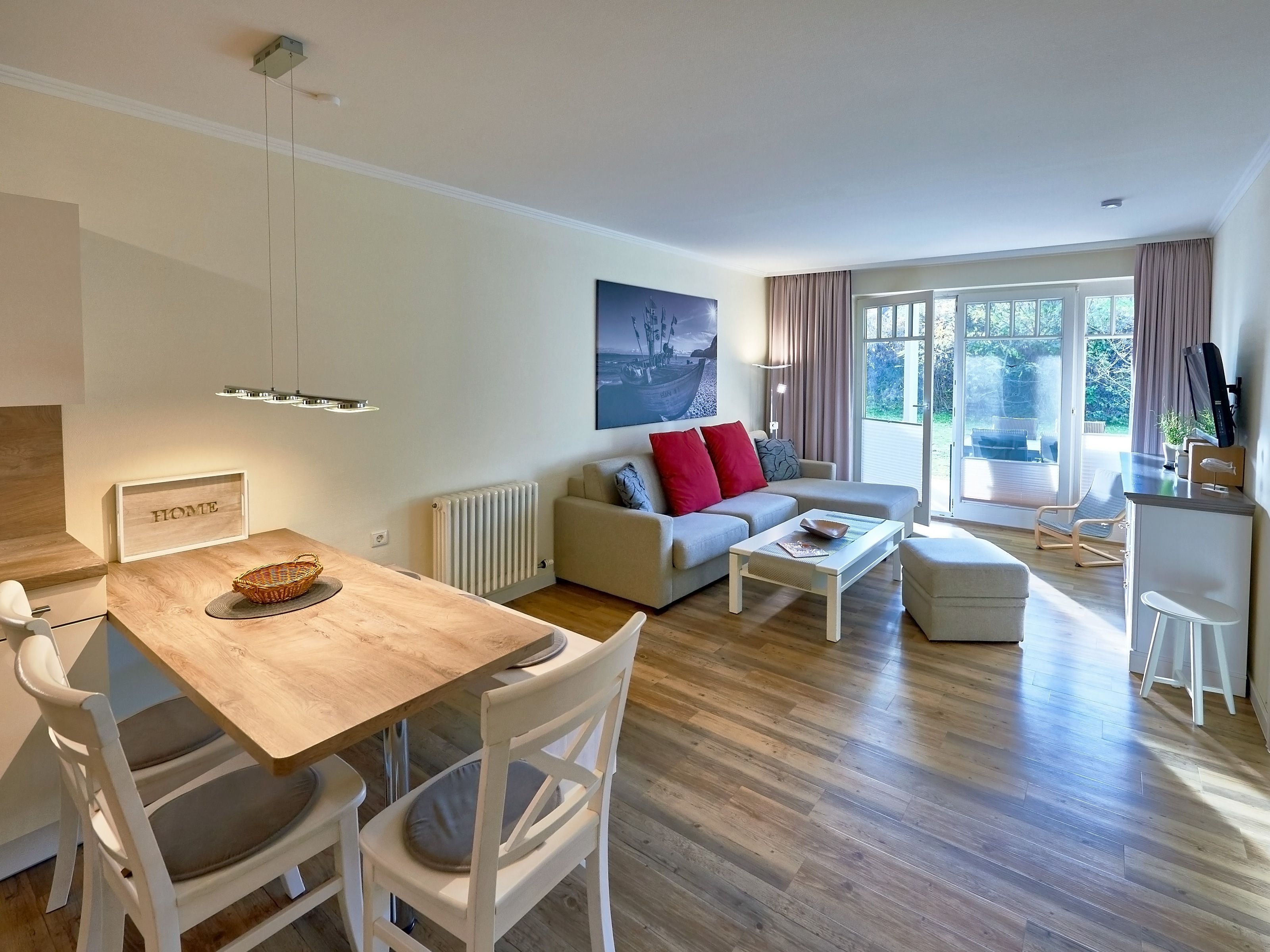 Im angenehm hell und freundlich wirkenden Wohnbereich kann die Couch bei Bedarf zu einer Schlafgelegenheit für zwei Personen verwandelt werden. Für Abwechslung und mediale Unterhaltung stehen ein großformatiger Flachbild-TV, ein DVD-Player, kostenfreies W-LAN sowie eine kleine Buch- und Spieleauswahl zur Verfügung. Am Esstisch findet die ganze Familie Platz.