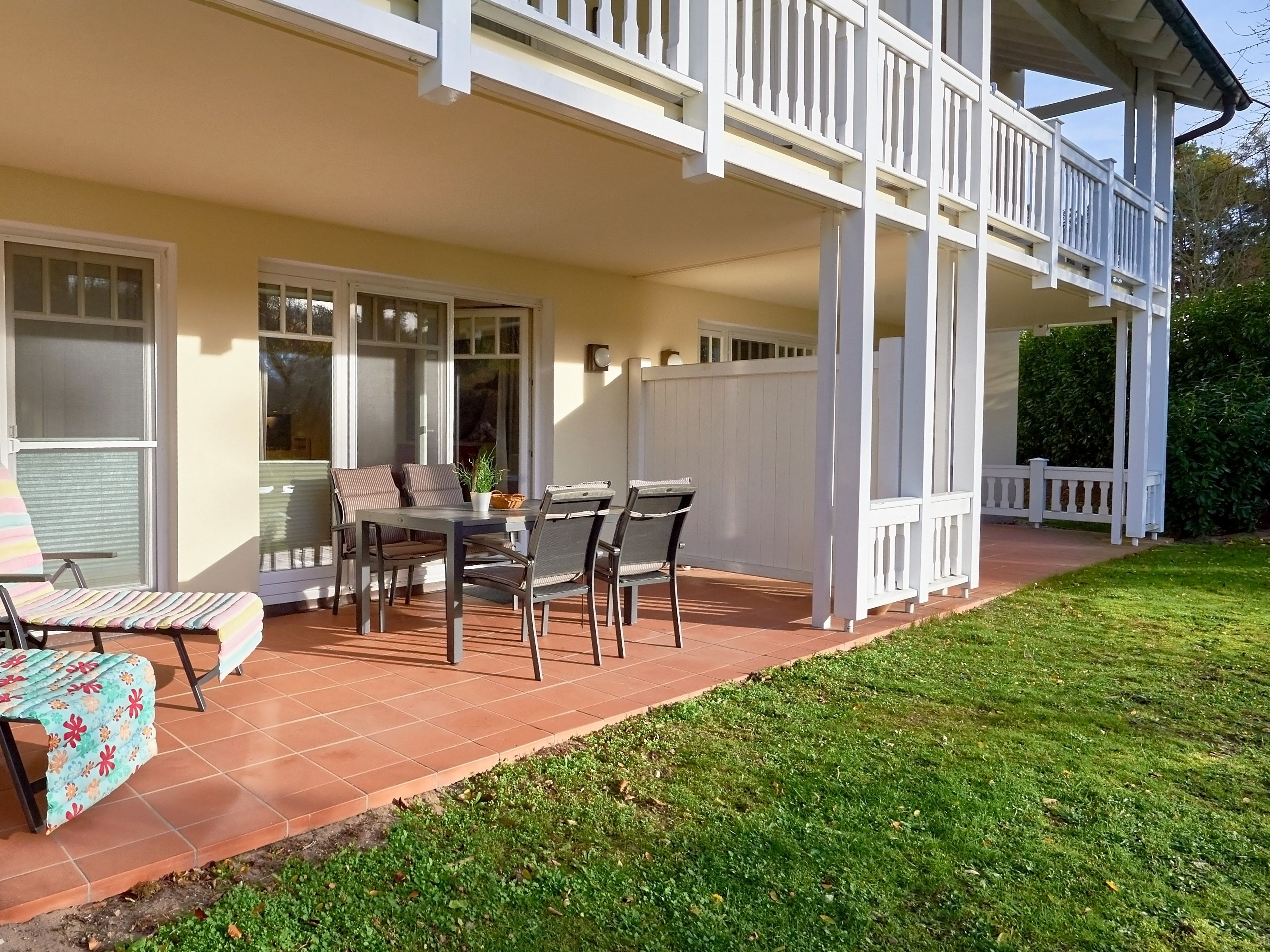Die große Terrasse ist zur Morgensonne ausgerichtet und sowohl vom Wohnzimmer als auch von einem der beiden Schlafzimmer aus zu betreten. Dank Überdachung und einer seitlichen Wind- und Sichtbarriere können Sie hier geschützt vor dem Wetter und neugierigen Blicken in der frische Ostseeluft relaxen.