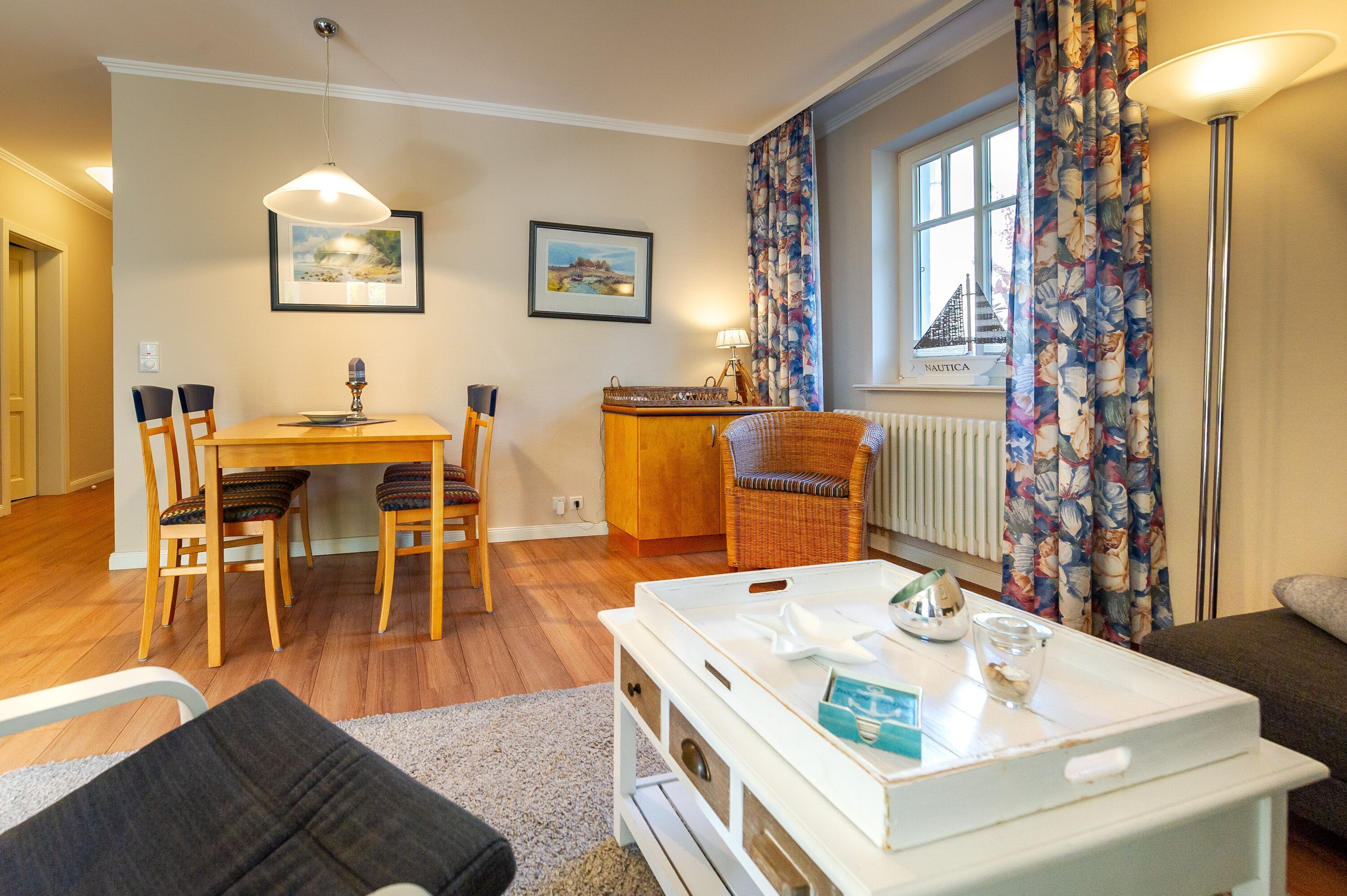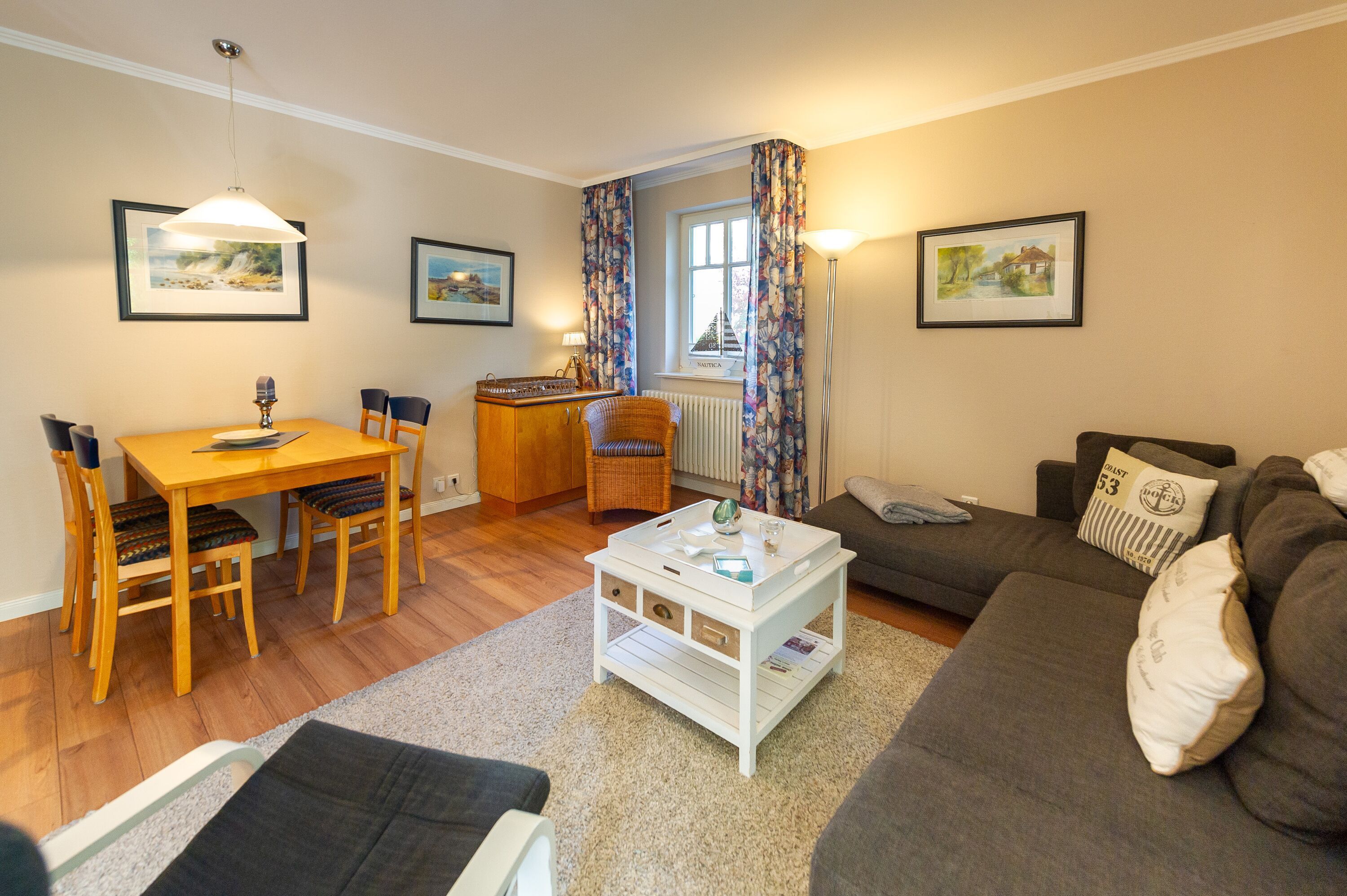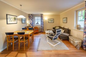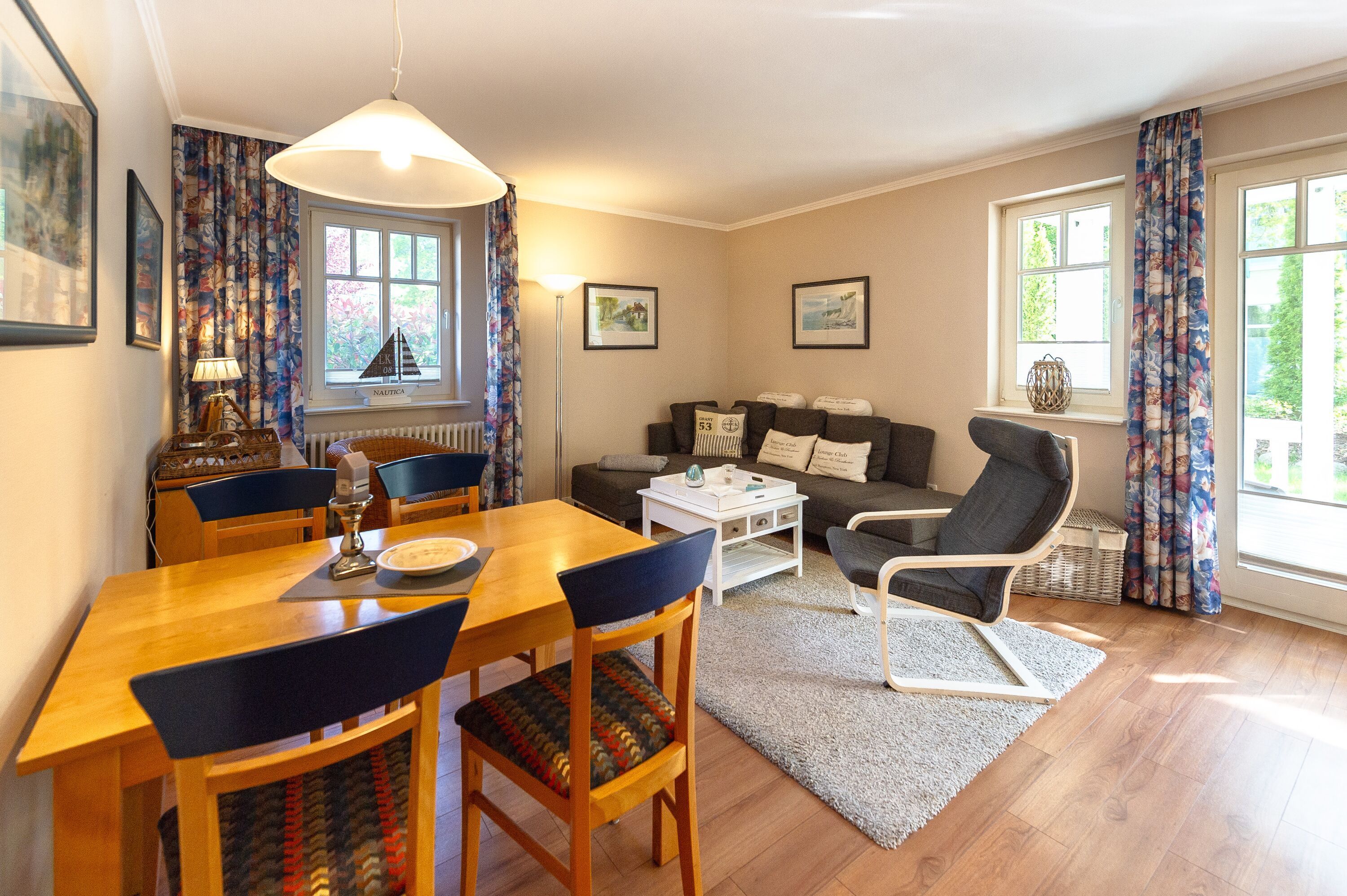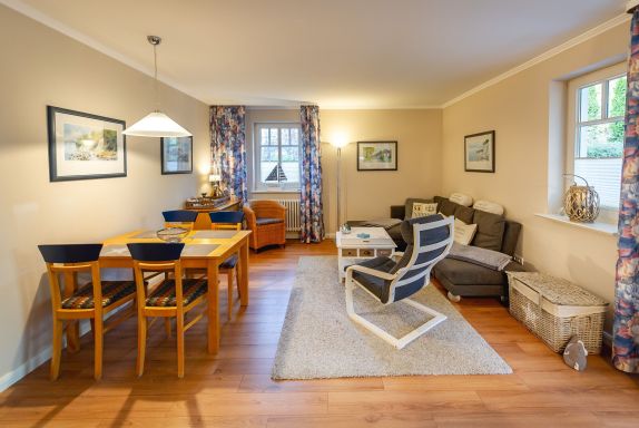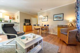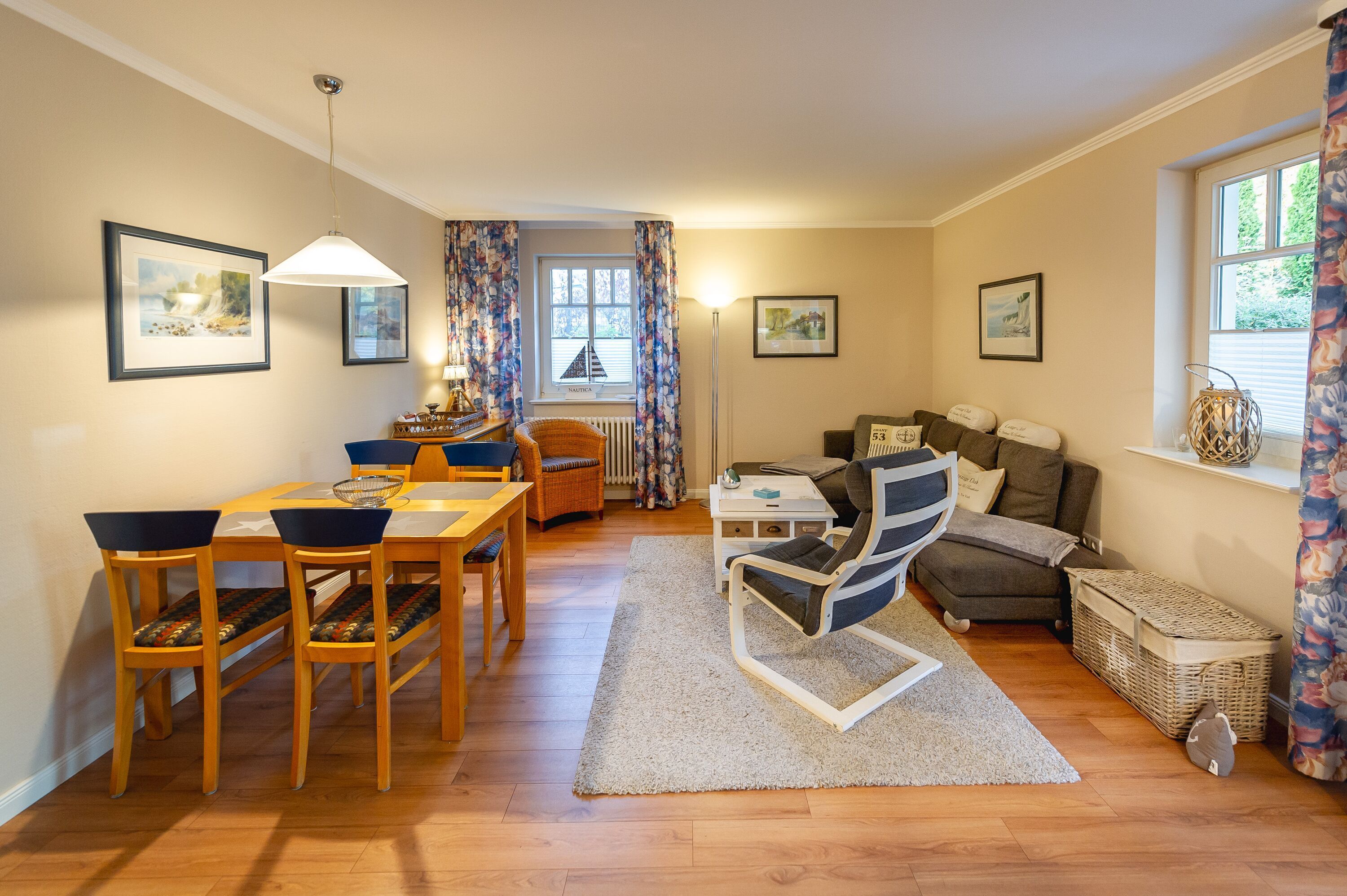 Zentraler Bestandteil Ihres gut 58 qm großen Urlaubsdomizils ist das Wohnzimmer, das mit drei Fenstern und der verglasten Terrassendoppeltür angenehm hell und wohnlich wirkt. Hier finden Sie u.a. einen gemütlichen Essplatz mit vier Stühlen und ein bequemes Loungesofa mit vielen Kissen, Sessel und Couchtisch vor, dazu zwei Sideboards sowie das technische Vergnügungsequipment mit Fernseher, Musikanlage inkl. DVD und kostenfreiem W-LAN.