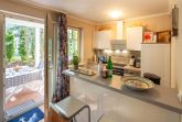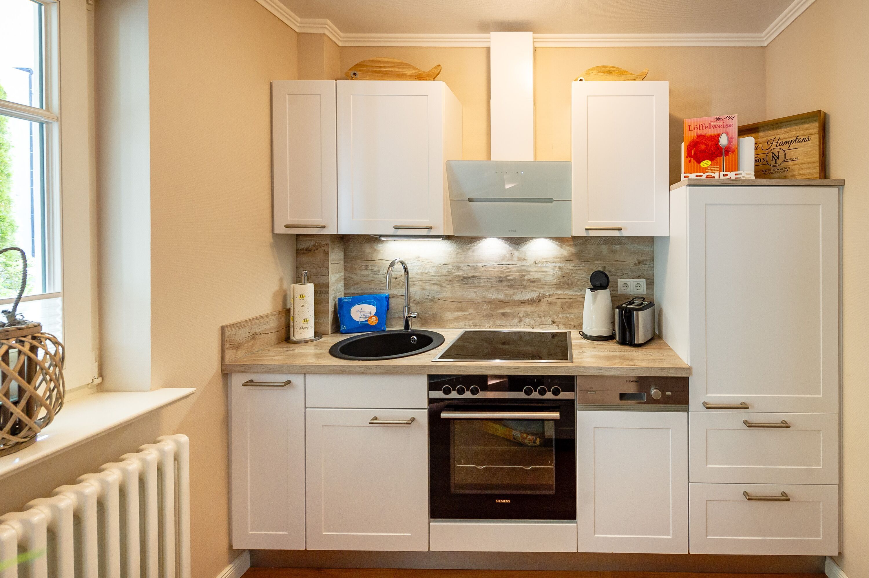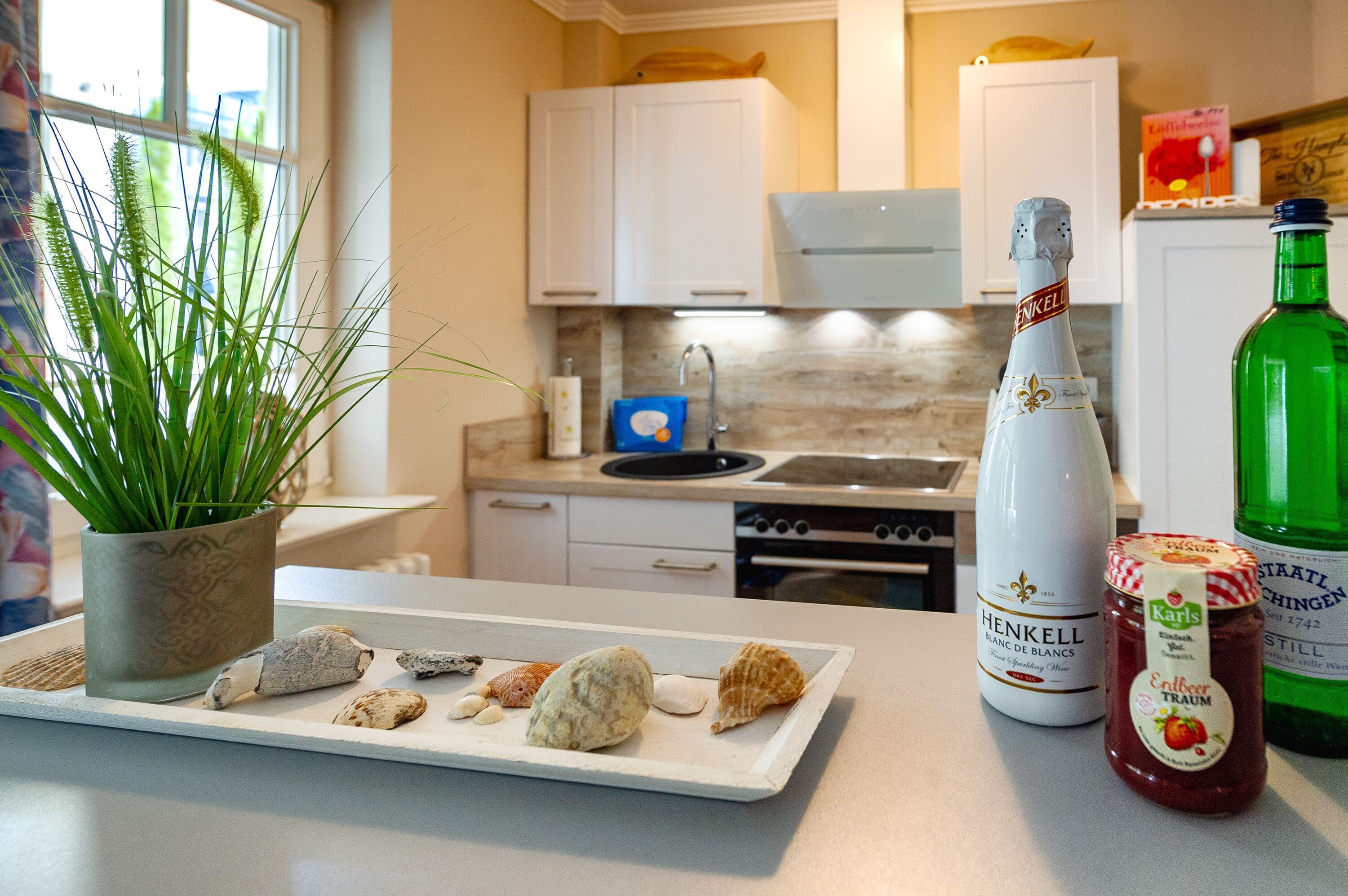 Die vollausgestattete Küche (Geschirrspüler, Backofen und Ceranfeld, Kühlschrank mit Gefrierfach, Mikrowelle, Kaffeemaschine, Toaster, Wasserkocher) mit Bartresen und zwei Barhockern ist im Wohnzimmer integriert und bietet alles an Pütt und Pann, was man als Selbstversorger benötigt.