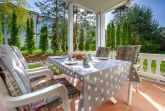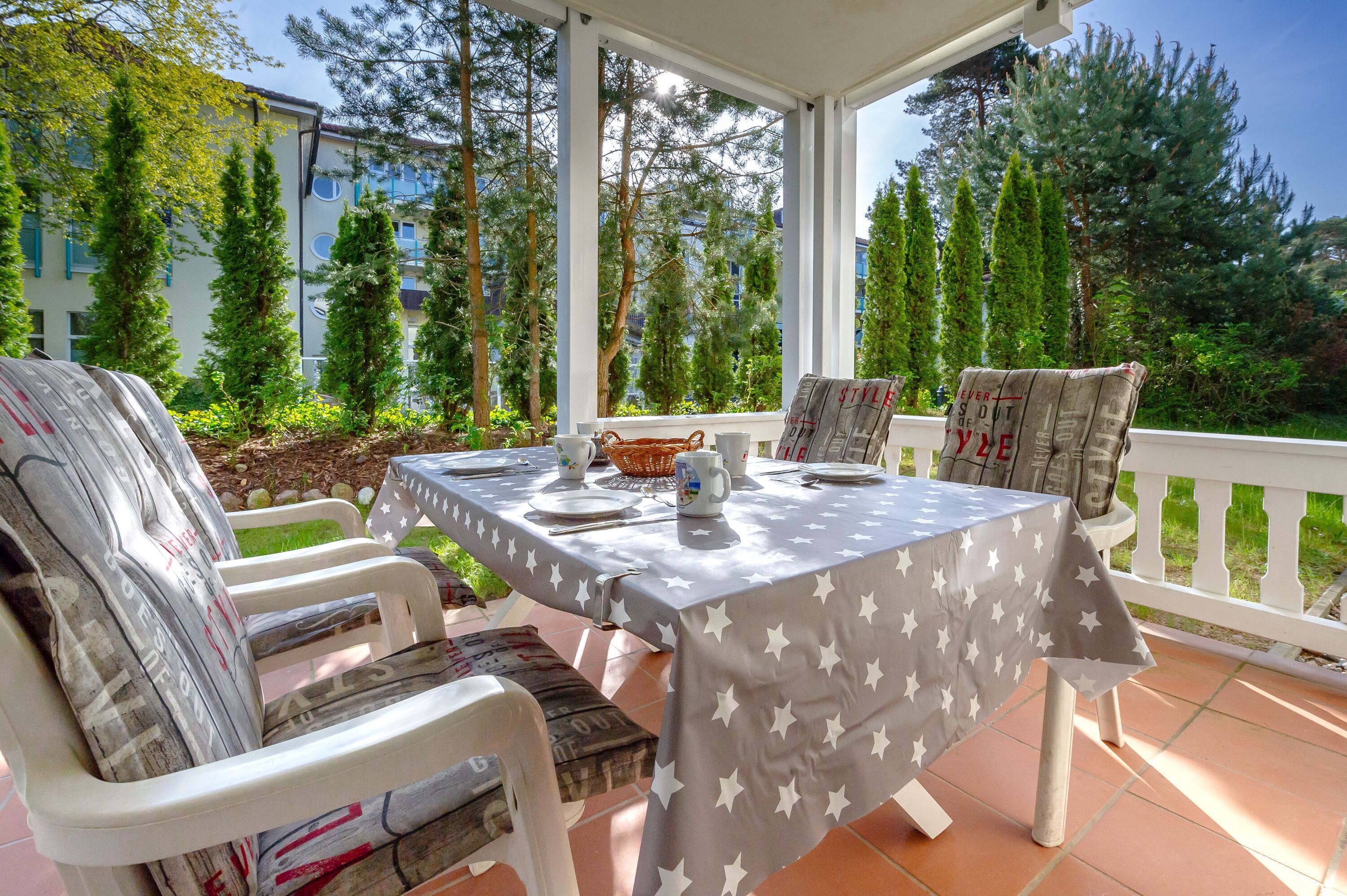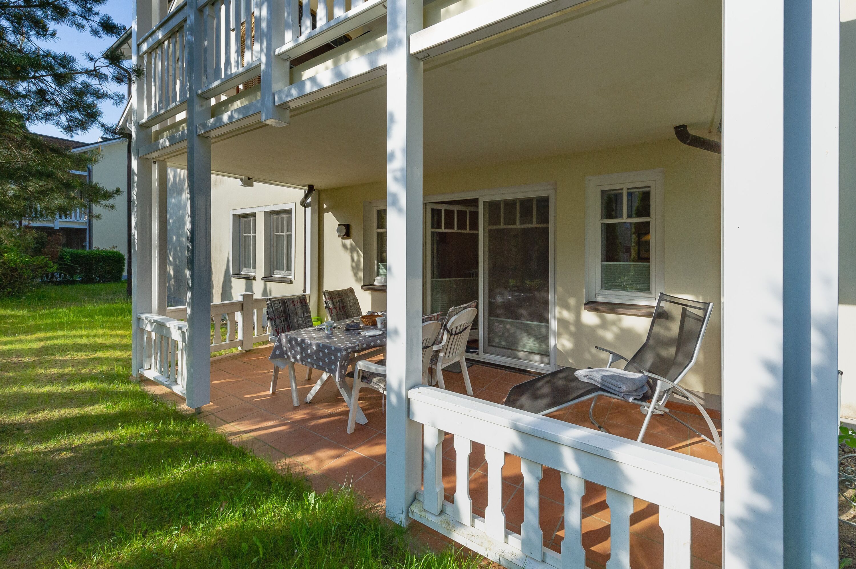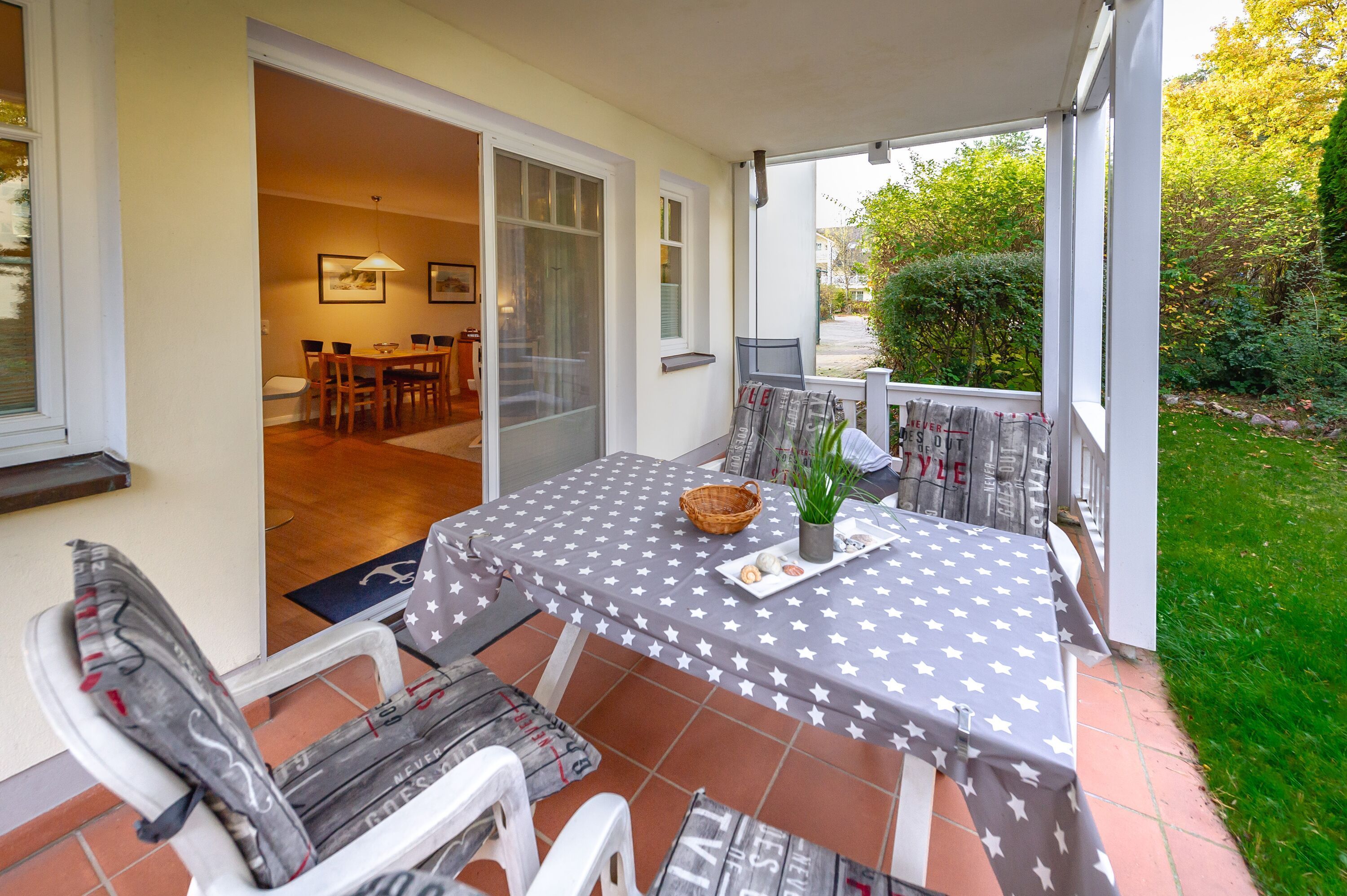 Vom Wohnzimmer aus gelangt man auf die ca. 14 qm große überdachte Terrasse in Ostausrichtung. Bis mittags können Sie hier sehr schön in der Sonne frühstücken. Die Terrasse bietet angenehme Privatsphäre, weil es weder rechts noch links einen Nachbarn gibt. Von der Terrasse aus kann man in die Grünanlagen des Dünenparks gehen und die rechts gelegene Rasenfläche für ein Sonnenbad am Nachmittag nutzen. Damit lästige Plagegeister draußen bleiben, sind an der Terrassentür und an einem der Wohnzimmerfenster Insektenschutzgitter angebracht.