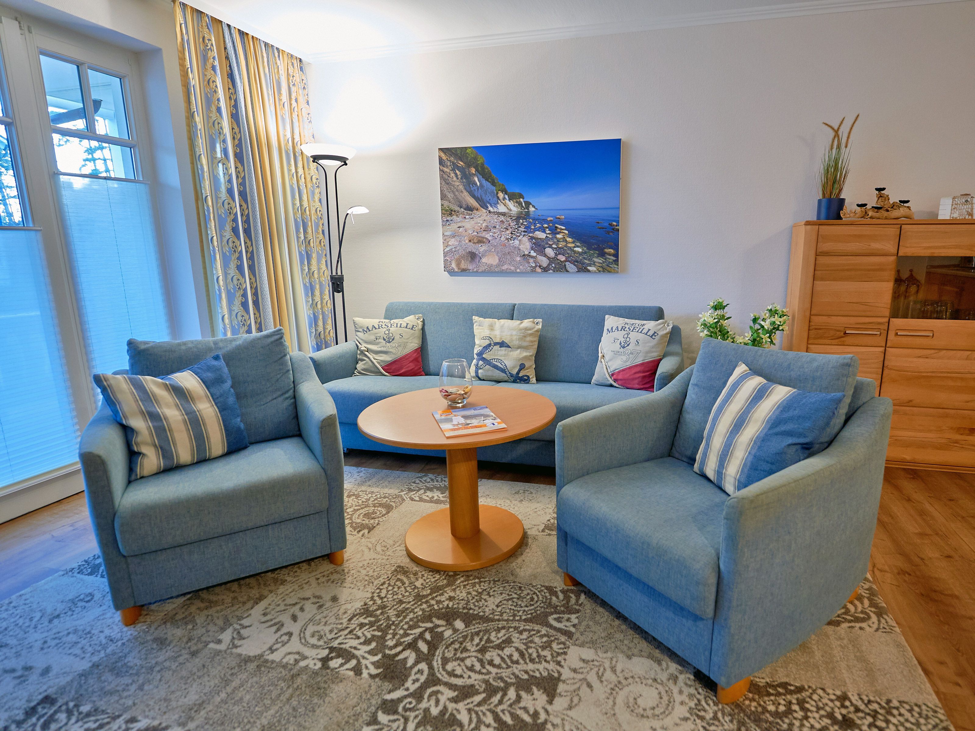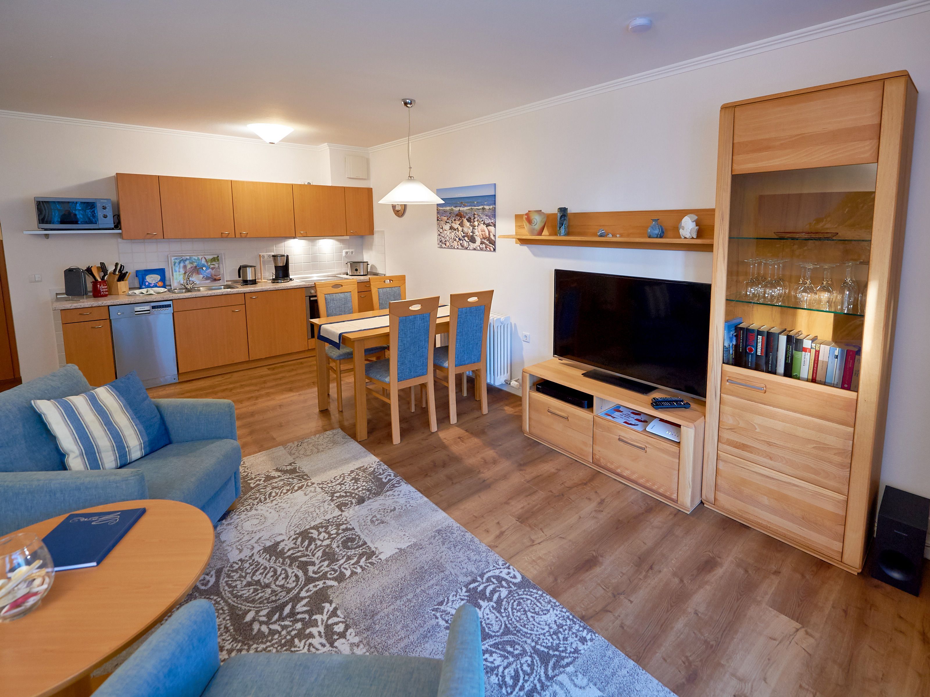 Im Wohnbereich laden bequeme Polstermöbel zum Platznehmen ein. Bei Bedarf lässt sich die Couch als Schlafgelegenheit für zwei Personen ausklappen. Mit einem großformatigen SMART-TV, einem BluRay-Player und kostenfreiem W-LAN ist die Wohnung auch technisch bestens ausgestattet. Das gilt auch für die Küchenzeile, die mit Herd/Backofen, Geschirrspüler, Kühlschrank, Mikrowelle, Kaffeemaschine, Toaster und Wasserkocher sowie allem nötigen Koch- und Essgeschirr zu überzeugen weiß. Die frischen Frühstücksbrötchen gibt es übrigens nur wenige Schritte entfernt beim Backshop im Hauptgebäude des Dünenparks.