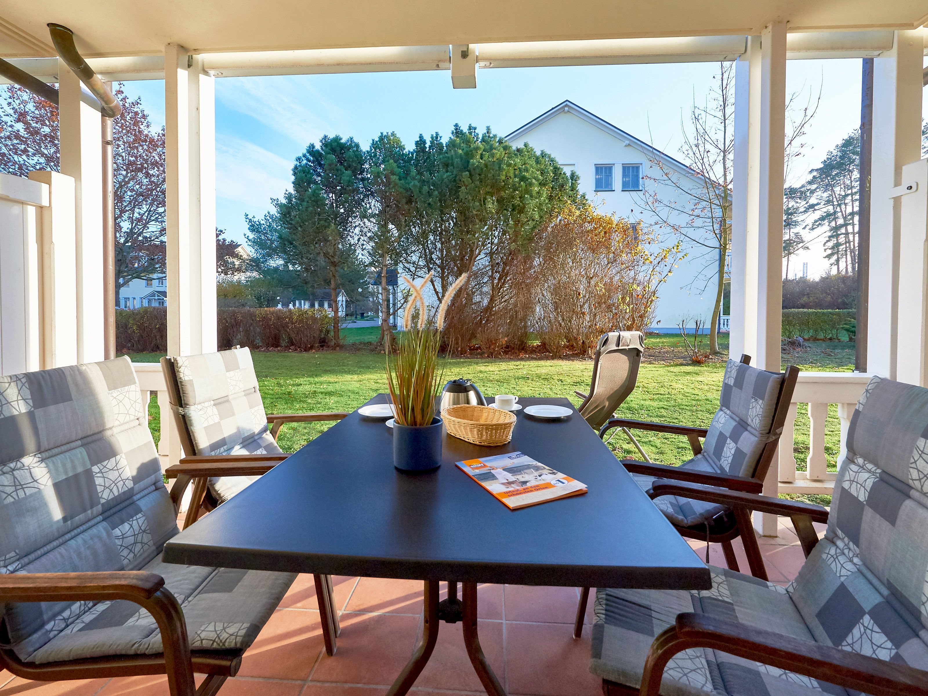 Dem Wohnzimmer vorgelagert ist eine geräumige Terrasse zur Morgensonne. Die Terrasse ist überdacht und verfügt auch über eine seitliche Wind- und Sichtbarriere, so dass Sie hier geschützt vor dem Wetter und neugierigen Blicken die frische Ostseeluft genießen können.