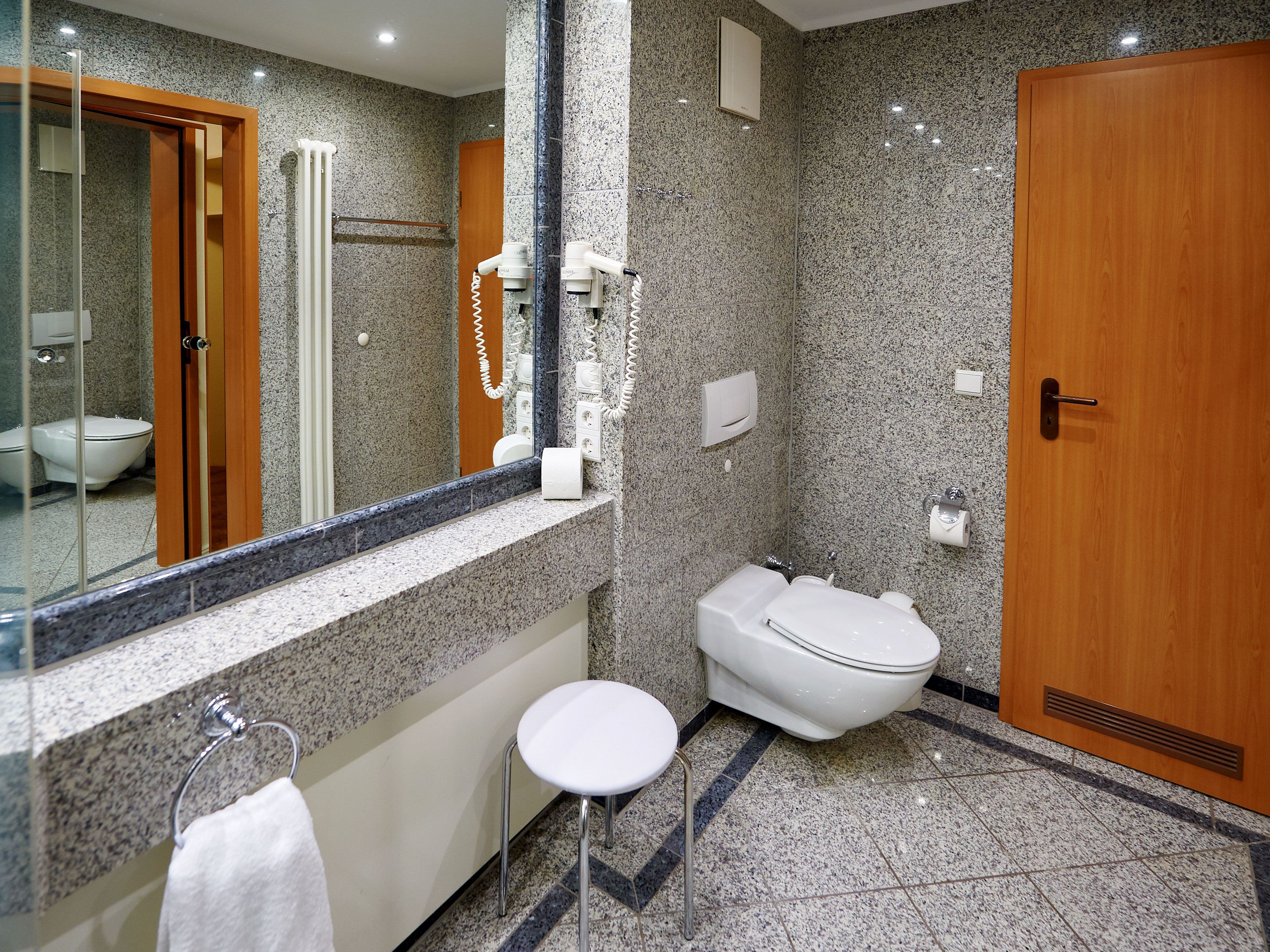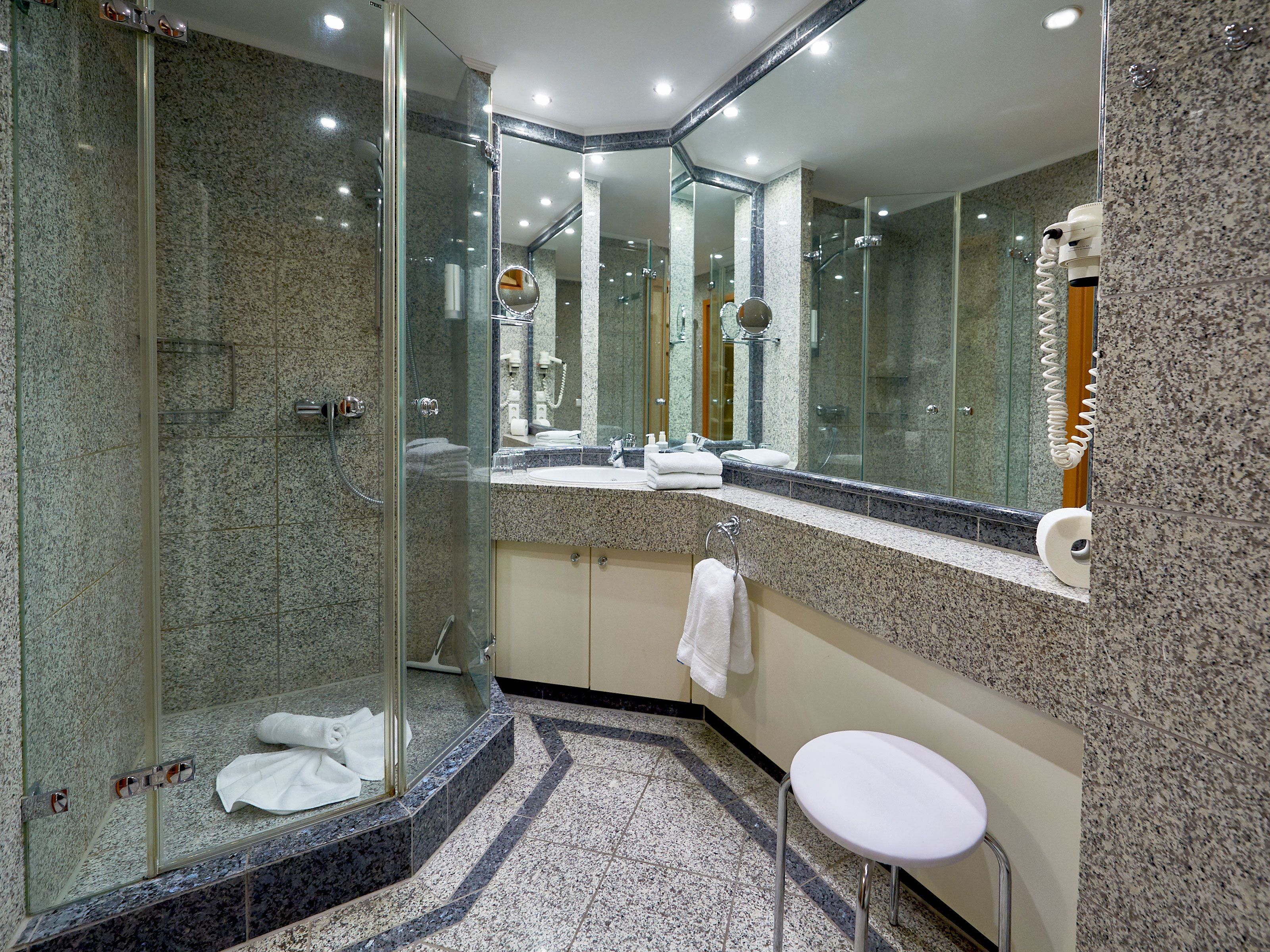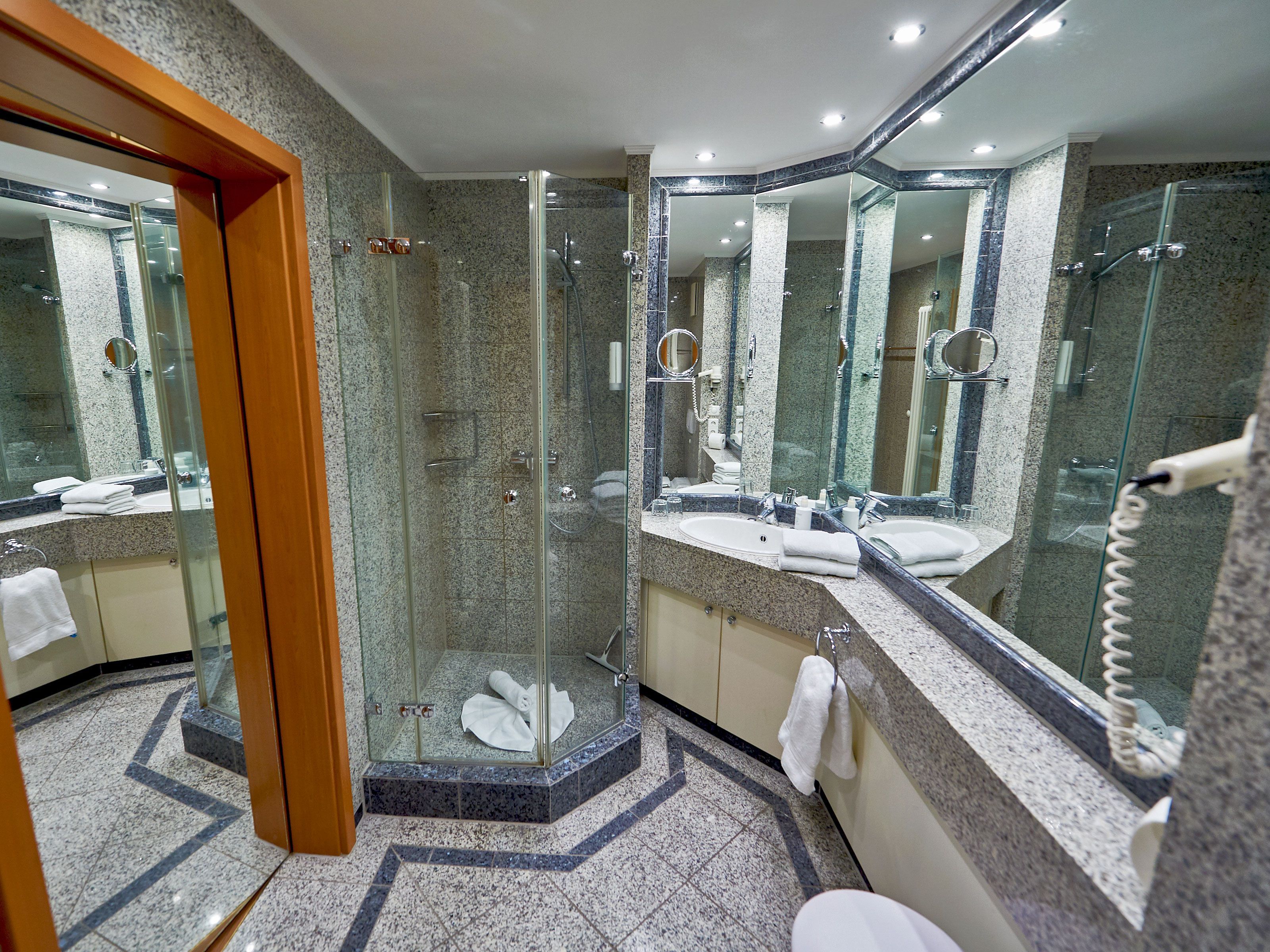 Das mit wertvollen Granitfliesen und großen Spiegelflächen ausgestattete Bad verfügt über eine geräumige Dusche, ein WC, einen beleuchteten Waschtisch sowie Kosmetikspiegel und Fön.