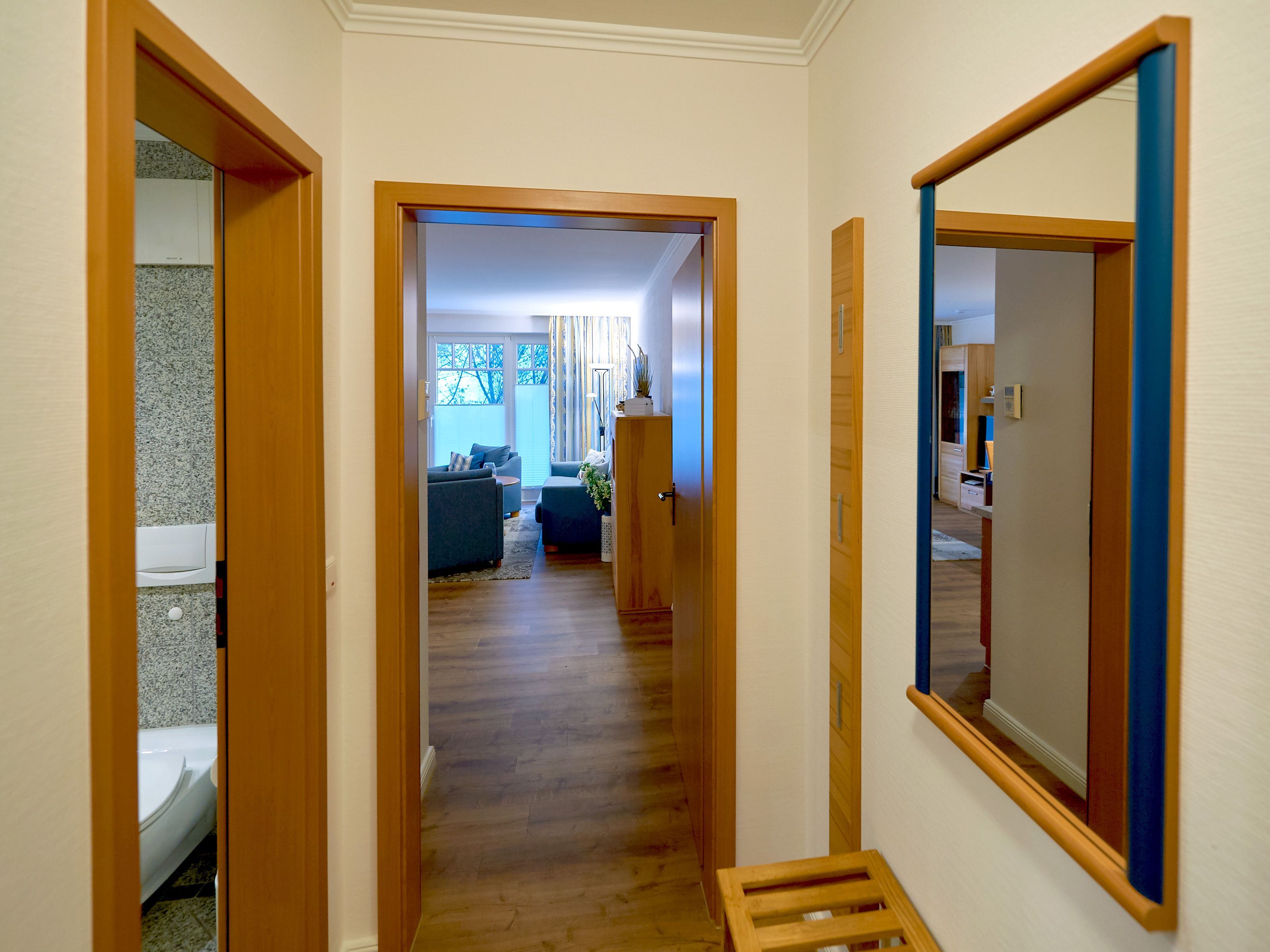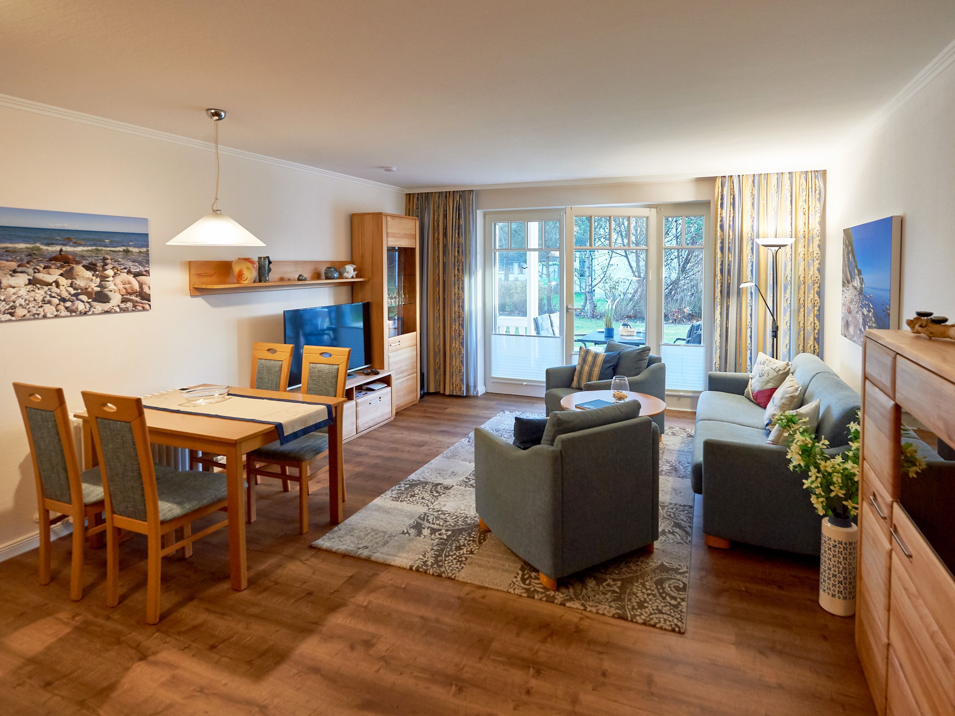 Herzlich willkommen in der Dünenperle! Dieses elegante 2-Raum-Appartement im Erdgeschoss ist gut 61 qm groß und für 1 - 4 Personen ausgelegt. Es besteht aus einem kombinierten Wohn-/Esszimmer mit integrierter Küchenzeile, einem Schlafzimmer sowie Flur und Bad.