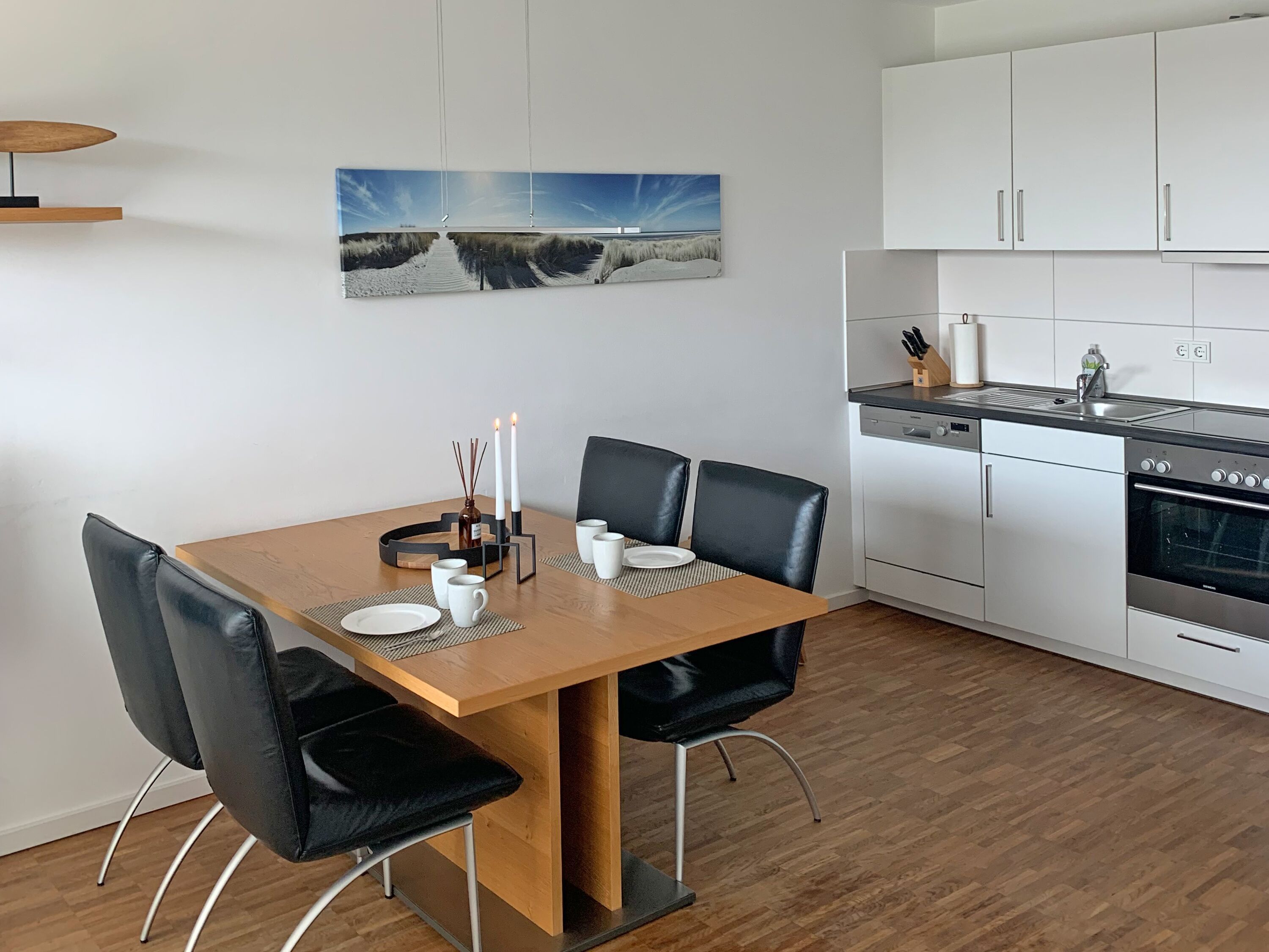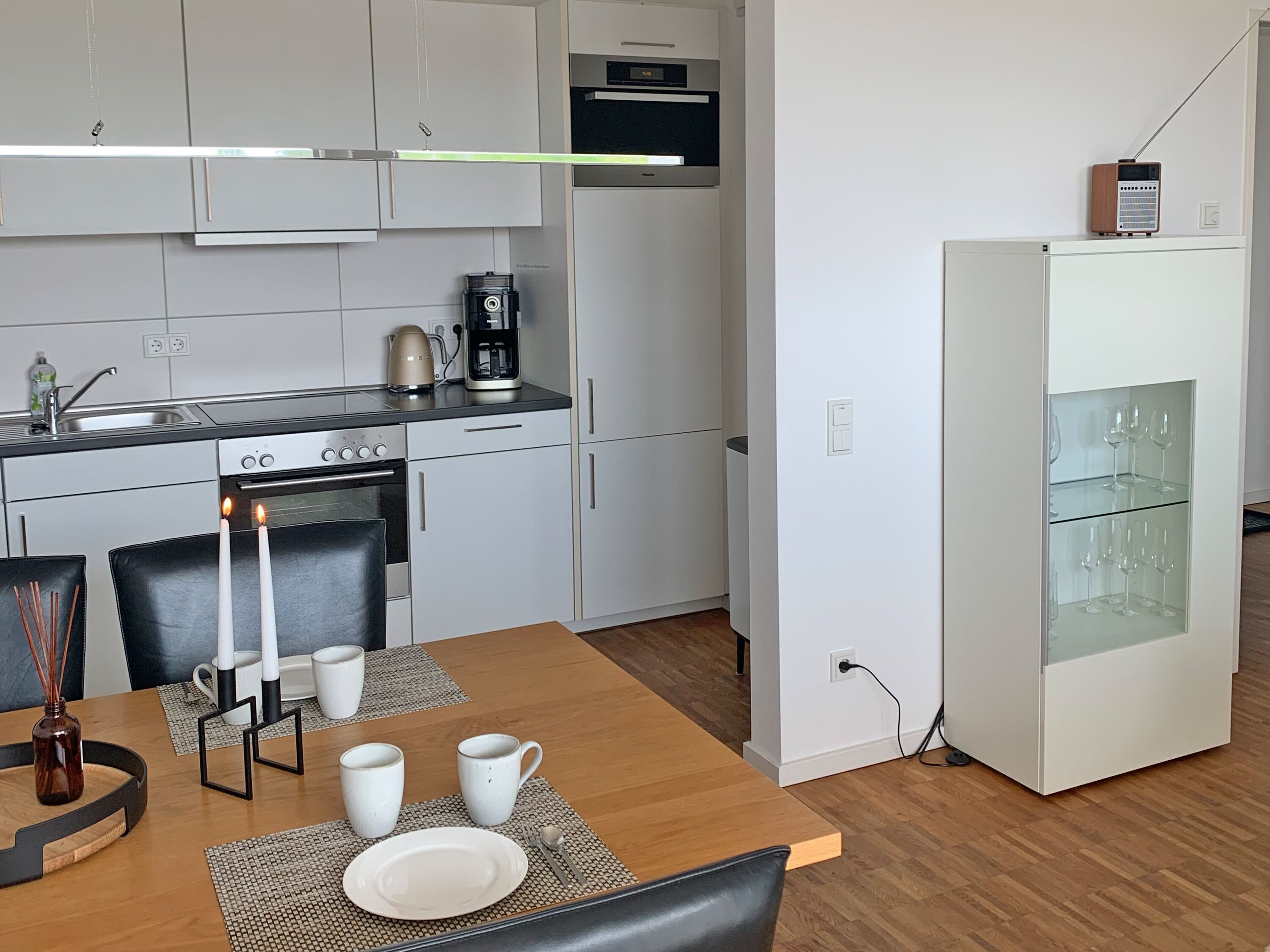 Damit Sie sich bequem selbst verpflegen können, ist die Küche mit allem notwendigen Komfort ausgestattet. Neben einem 4-Zonen-Ceranherd inklusive Backofen und Abzugshaube, einem Kühlschrank mit Gefrierfach, einem Geschirrspüler sowie einem Dampfgarer, einer Kaffeemaschine, einem Wasserkocher und einem Toaster stehen Ihnen natürlich auch Pfannen, Töpfe, Geschirr und diverse Kleinutensilien zur Verfügung. Wenige Gehminuten entfernt gibt es übrigens gleich mehrere Backshops für die frischen Frühstücksbrötchen.