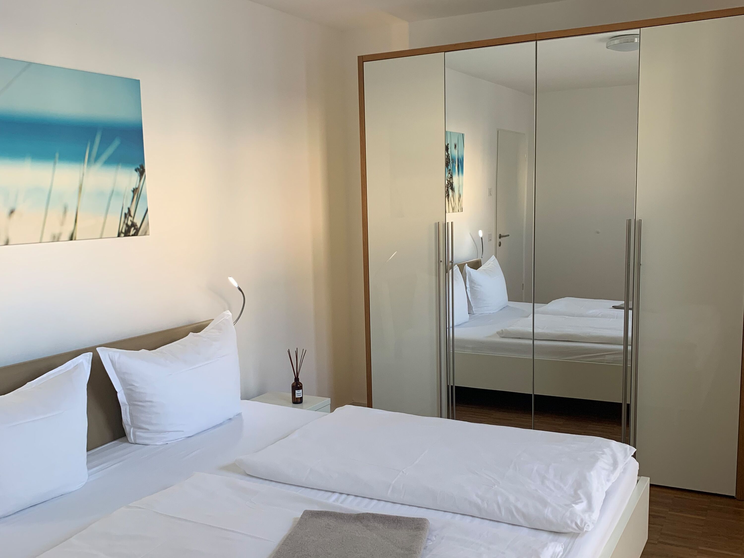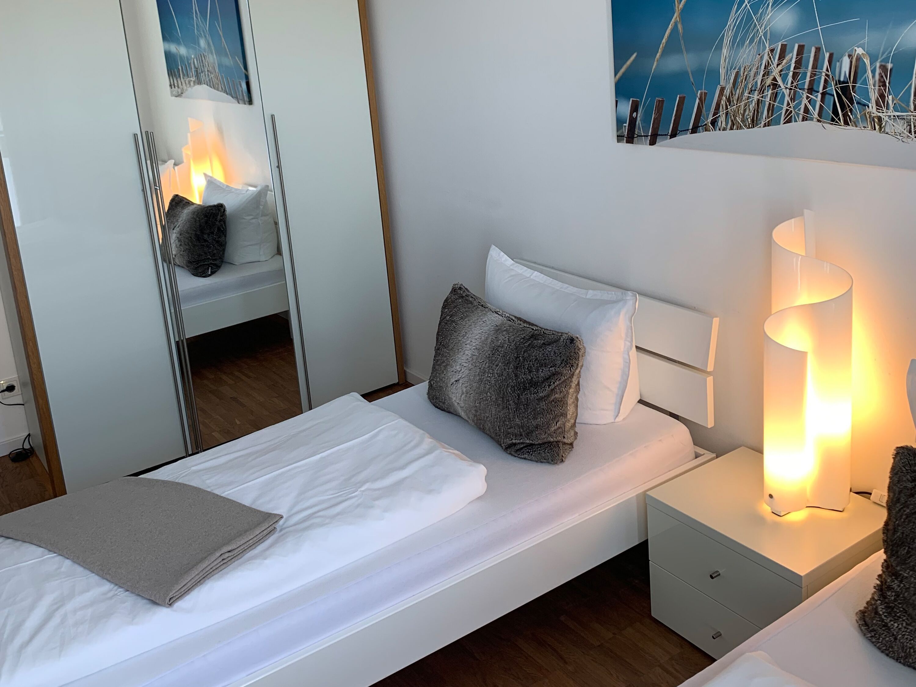 Ihr Zuhause auf Zeit verfügt über zwei separate Schlafzimmer, ausgestattet mit einem komfortablen Doppelbett (1,80 x 2,00 m) bzw. mit zwei Einzelbetten und einem zusätzlichen Fernseher. Geräumige Kleiderschränke bieten Platz für die Urlaubsgarderobe.