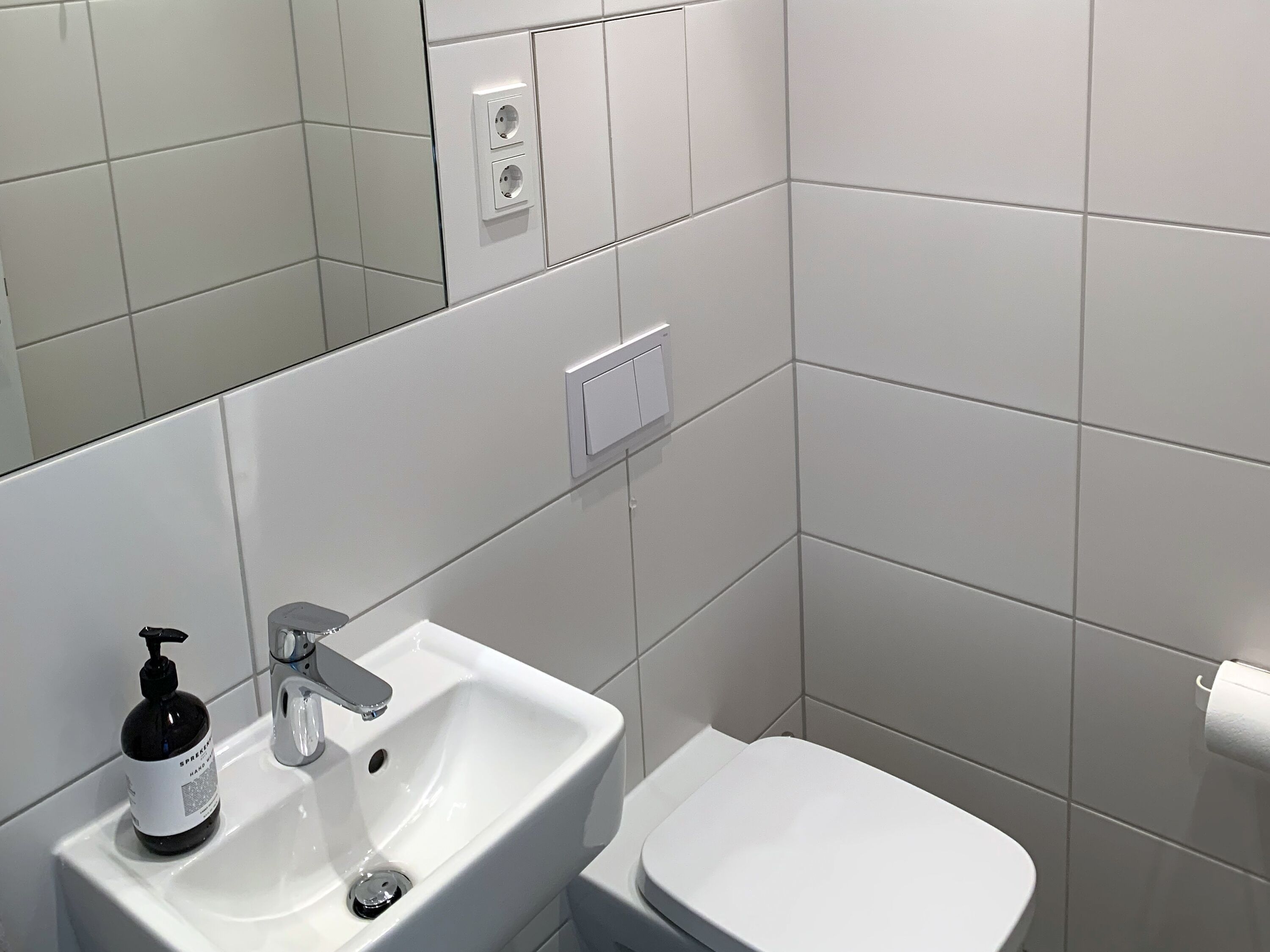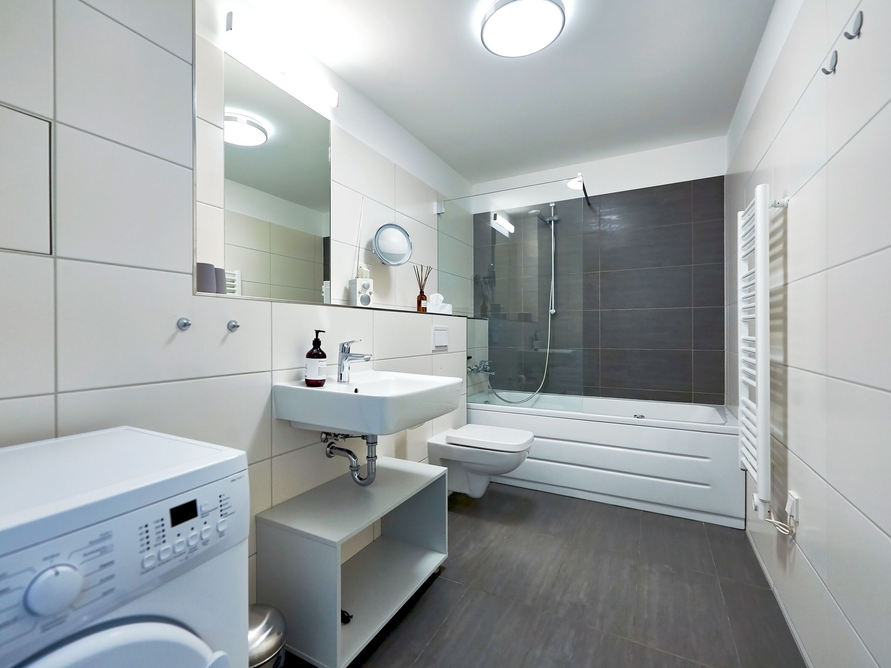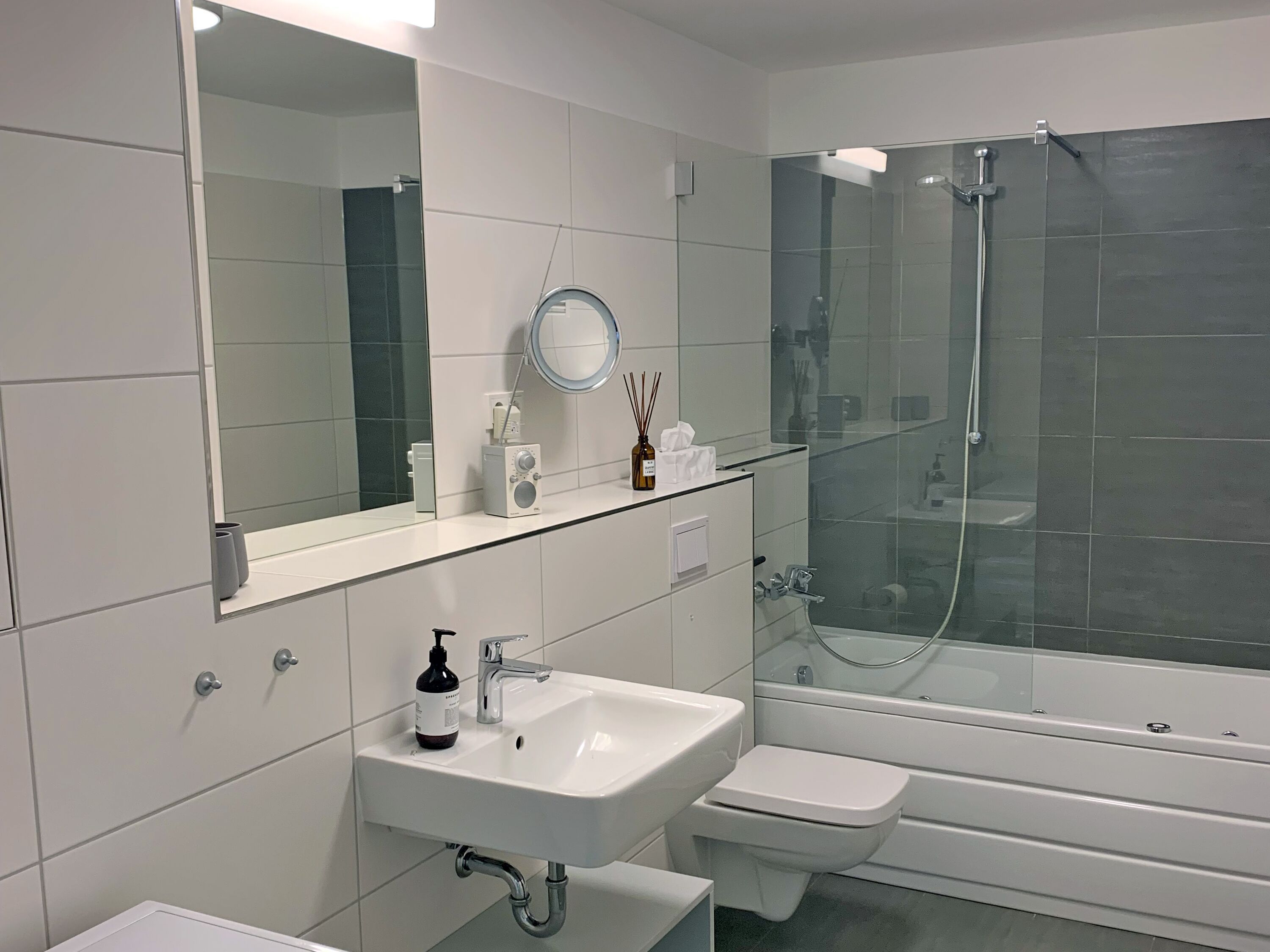 Das elegant geflieste Badezimmer bietet Ihnen den Komfort einer Badewanne, dazu natürlich ein WC, einen beleuchteten Waschtisch mit großem Spiegel, einen Kosmetikspiegel sowie einen Fön. Ein zusätzliches Gäste-WC sorgt dafür, dass es auch bei „voller Hütte“ immer entspannt zugeht.