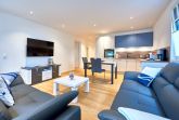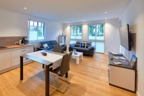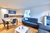 Das Appartement besteht aus einem kombinierten Wohn-/Esszimmer mit integrierter Küche, einem separaten Schlafzimmer, einem Badezimmer und einem Flurbereich. Die Terrasse ist vom Wohnzimmer und vom Schlafzimmer aus zu betreten.