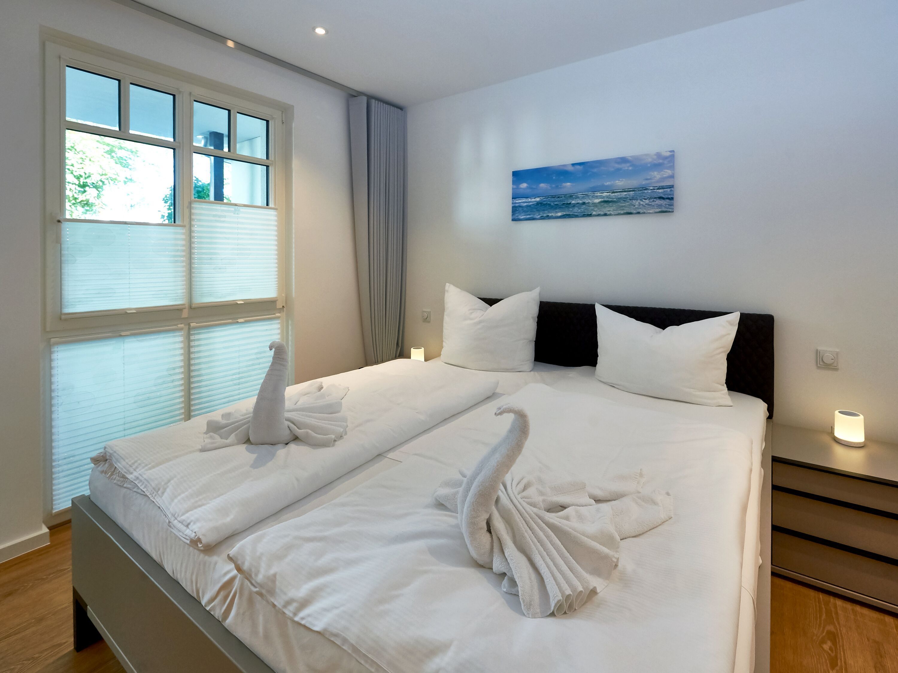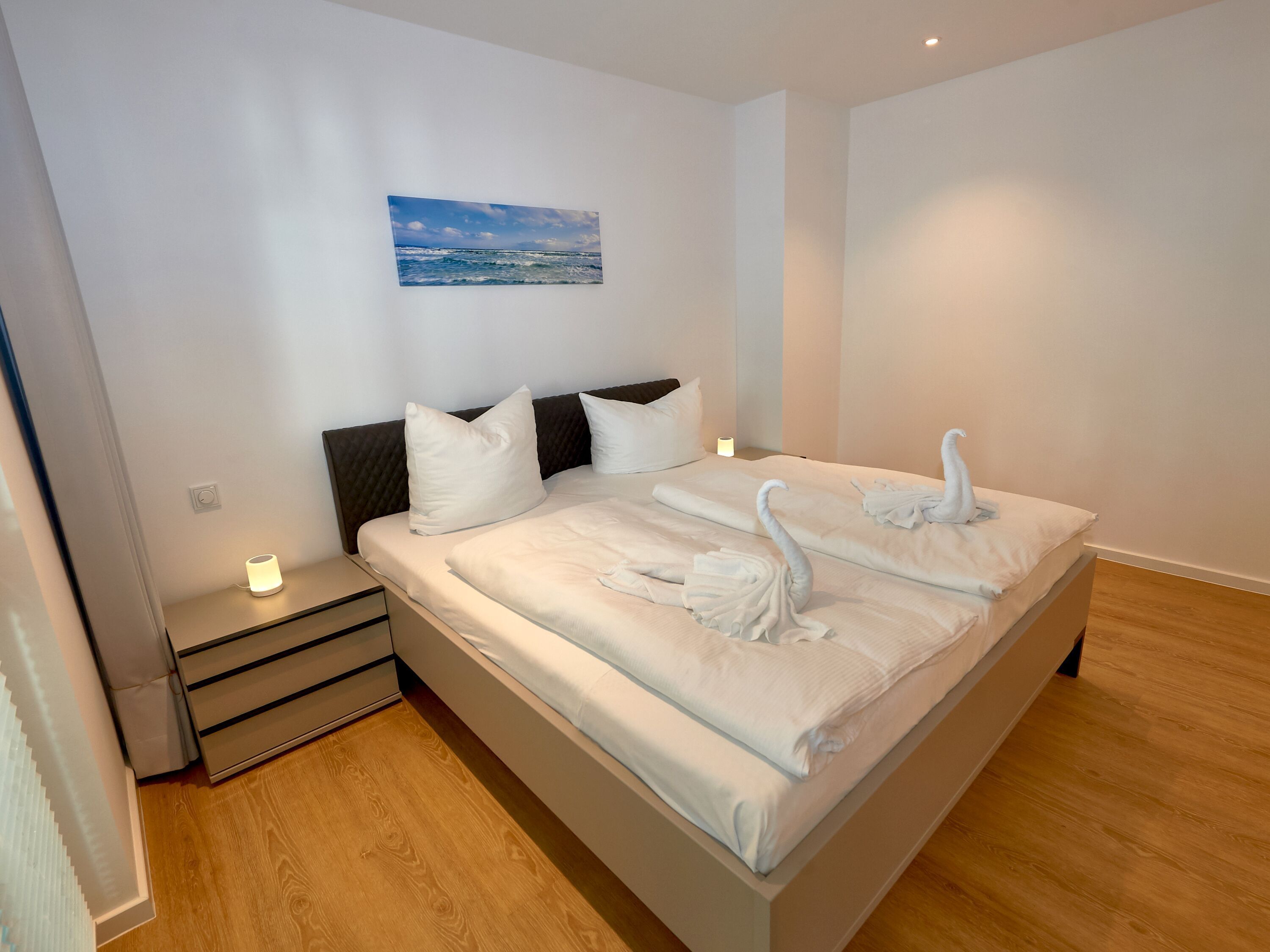 Im Schlafzimmer mit großem Kleiderschrank für Ihre Urlaubsgarderobe und einem zweiten Fernsehgerät verspricht ein herrlich bequemes Boxspringbett (1,80 x 2,00 m) süße Träume. Als besonderer Clou entpuppen sich die beiden Nachttischlampen. Diese dienen nämlich nicht nur der stimmungsvollen Beleuchtung, sondern können über Bluetooth auch die eigene Playlist oder das Lieblingshörbuch abspielen.