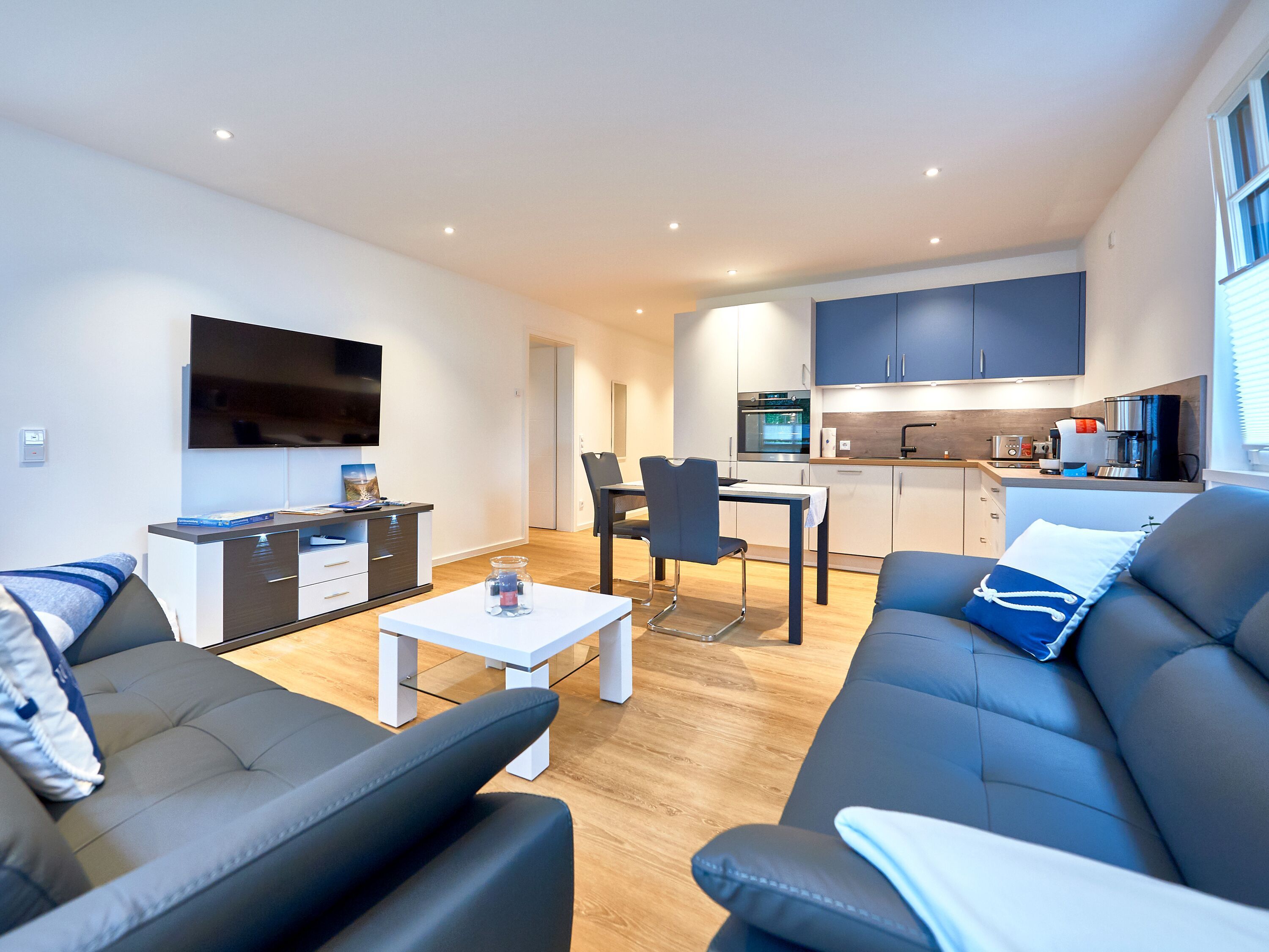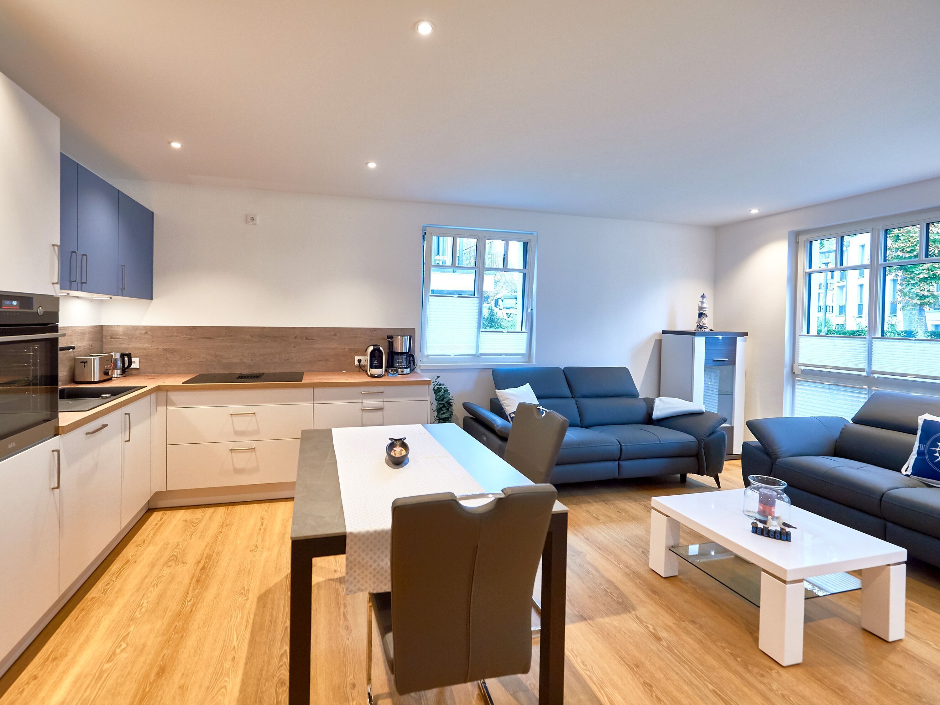 Die exklusive Einbauküche mit Markengeräten von Liebherr, Neff, Bosch, WMF und Bauknecht macht nicht nur optisch etwas her, sondern wartet förmlich darauf, dass Sie Ihren Kochkünsten freien Lauf lassen. Dazu stehen Ihnen u.a. ein 4-Zonen-Ceranherd mit integriertem Dunstabzug, ein Backofen, ein Geschirrspüler, eine große Kühl-/Gefrierkombi, ein Raclette-Grill sowie natürlich Wasserkocher, Toaster, eine Filterkaffeemaschine und eine extra Kaffee-Kapselmaschine zur Verfügung. Speisen können Sie wahlweise am großen Esstisch oder draußen auf der Terrasse in der frischen Ostseeluft. Wenn Sie sich stattdessen lieber in einem Restaurant oder Café verwöhnen lassen wollen, haben Sie in fußläufiger Entfernung genügend Auswahl.