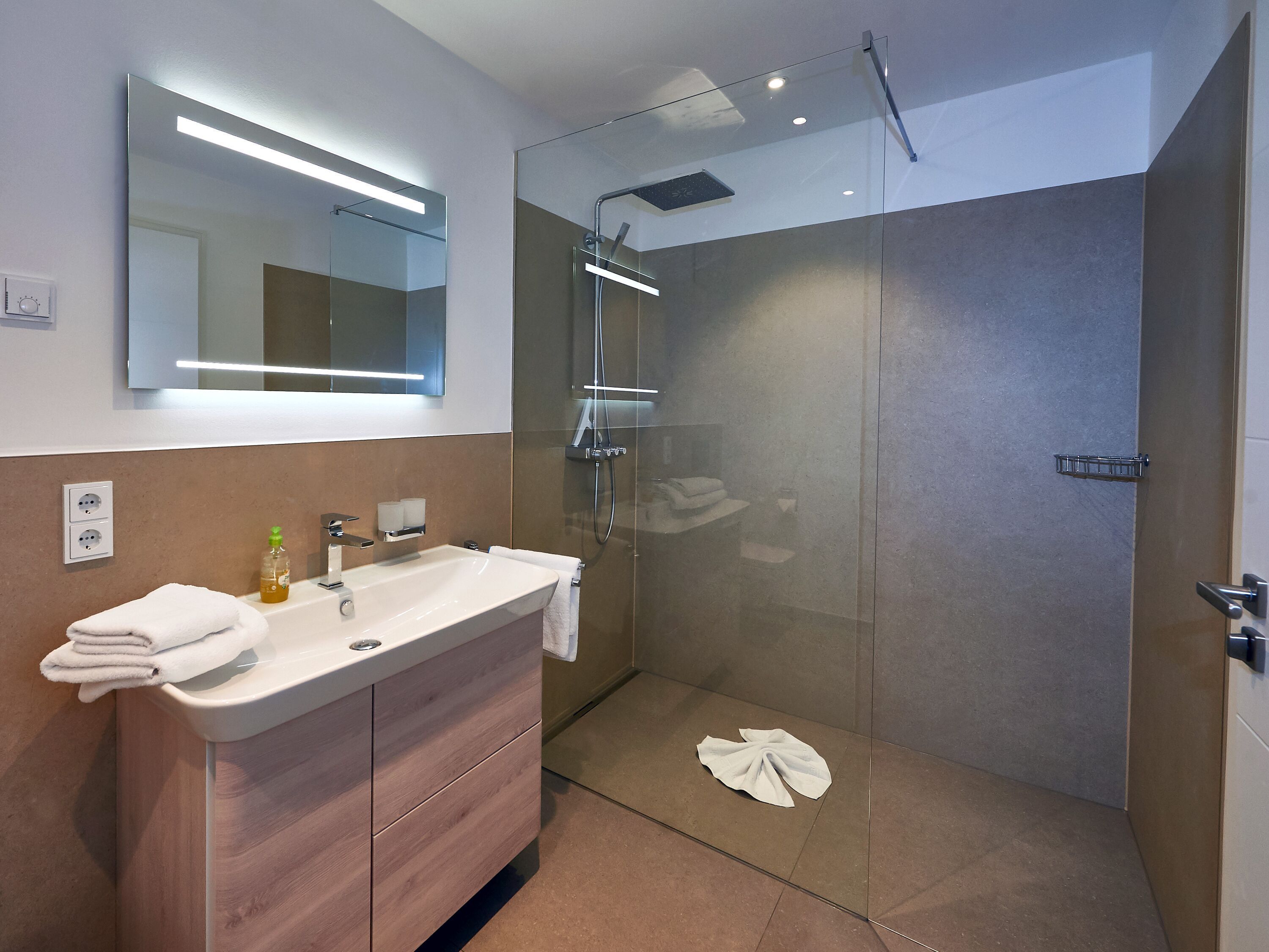 Das geräumige Badezimmer überzeugt mit einer ebenerdigen Dusche inkl. Duschhocker, WC, einem beleuchtetem Waschtisch mit großem Spiegel und Fön sowie einem Handtuchwärmer. Eine Fußbodenheizung sorgt hier und auch in allen anderen Räumen der Wohnung für angenehme Temperaturen.