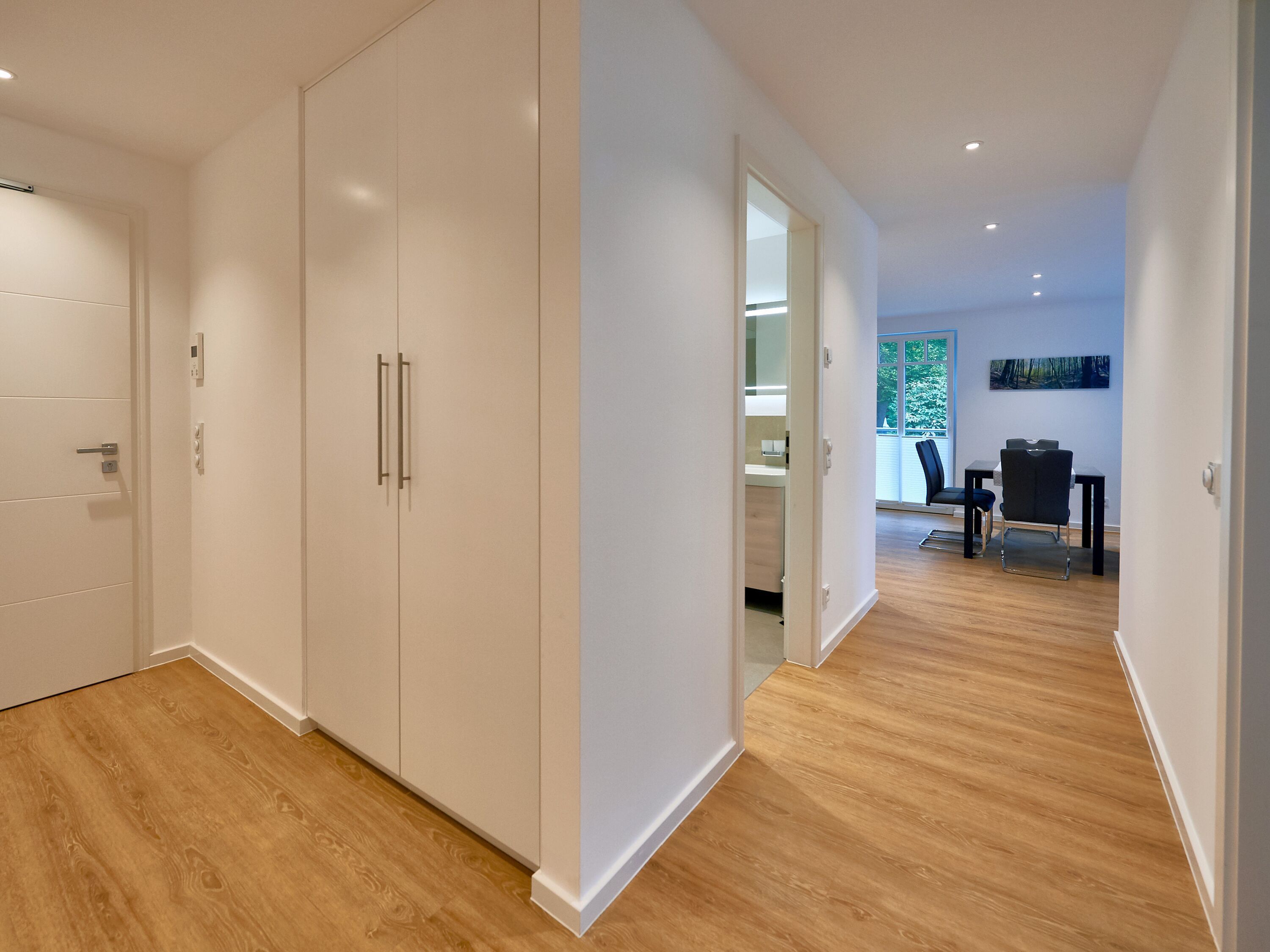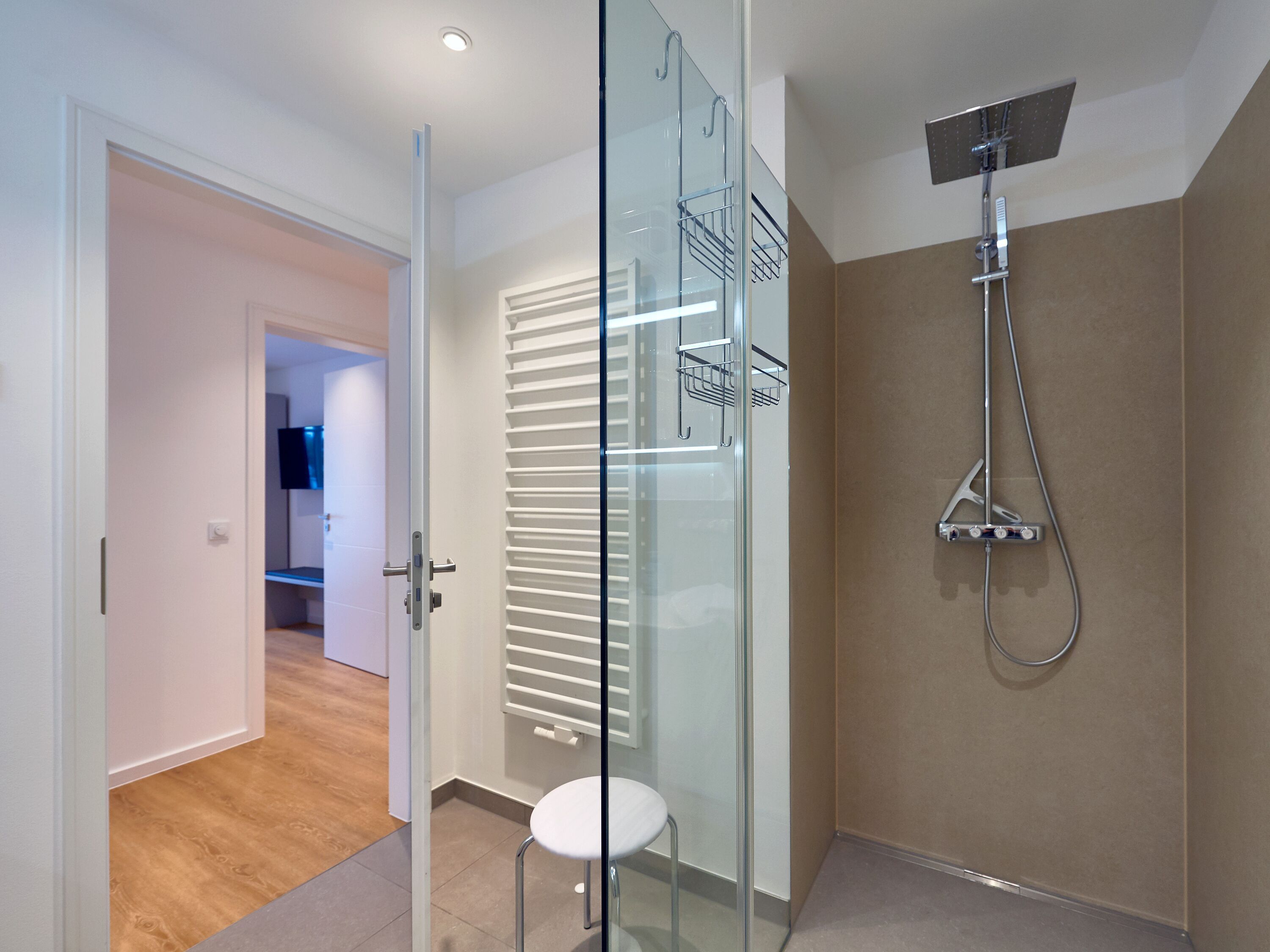 Die geräumigen Badezimmer überzeugen mit ebenerdigen Duschen, WC, beleuchteten Waschtischen mit großen Spiegeln, Fön sowie einem Handtuchwärmer. Die moderne Fußbodenheizung sorgt hier und auch in allen anderen Zimmern der Wohnung für ein angenehmes Raumklima.