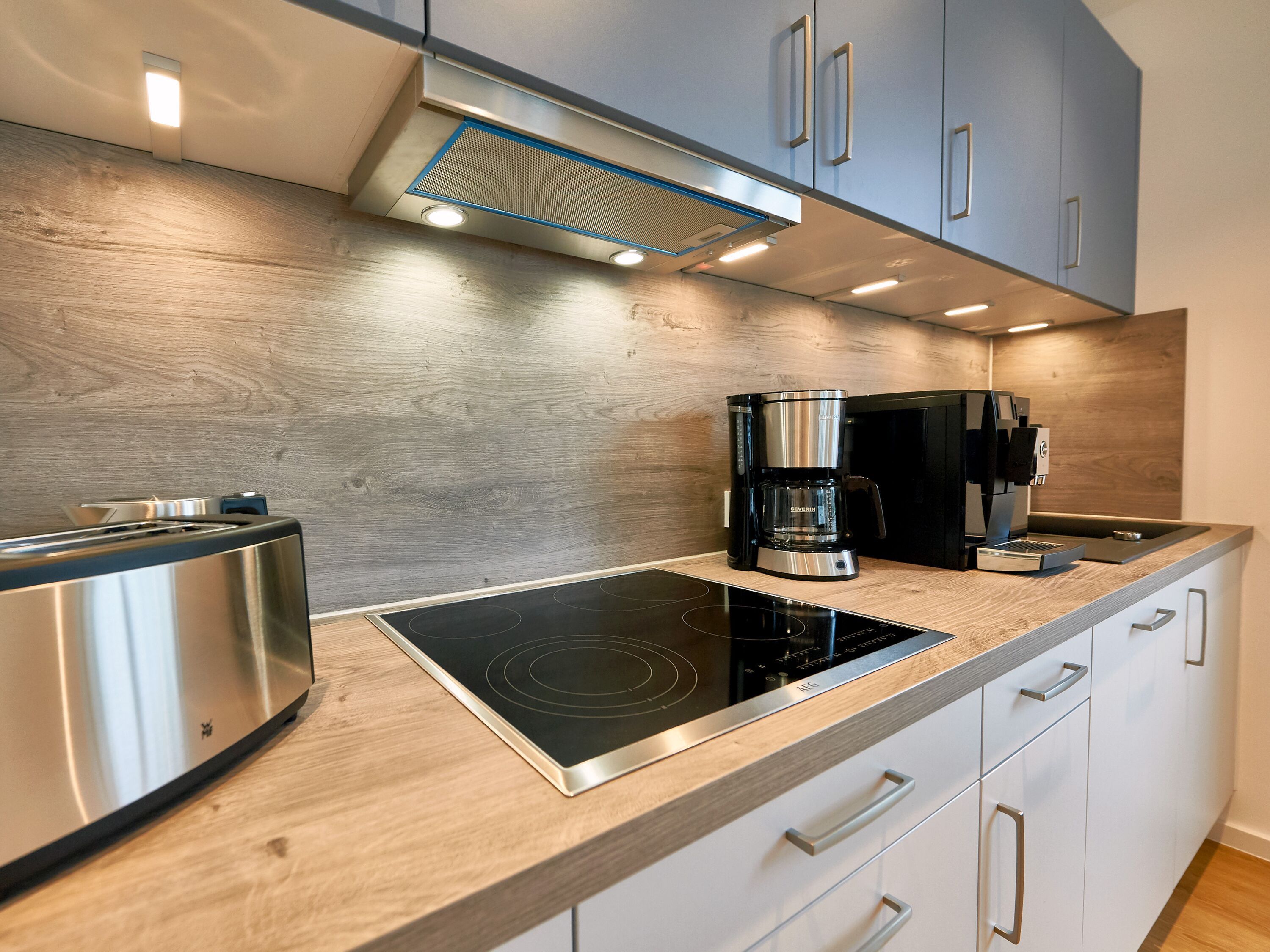 Die exklusive Einbauküche mit Markengeräten von Liebherr, Bosch, Neff, Bauknecht und WMF macht nicht nur optisch etwas her, sondern wartet förmlich darauf, dass Sie Ihren Kochkünsten freien Lauf lassen. Der 4-Zonen-Ceranherd mit Dunstabzugshaube, ein Raclette-Grill, ein Backofen in Komforthöhe, der Geschirrspüler, die große Kühl-/Gefrierkombi und dazu natürlich ein Wasserkocher, ein Toaster, eine Filterkaffeemaschine und sogar ein Kaffeevollautomat von JURA (inkl. Start-Ausstattung an Kaffeebohnen) machen es Ihnen leicht.