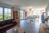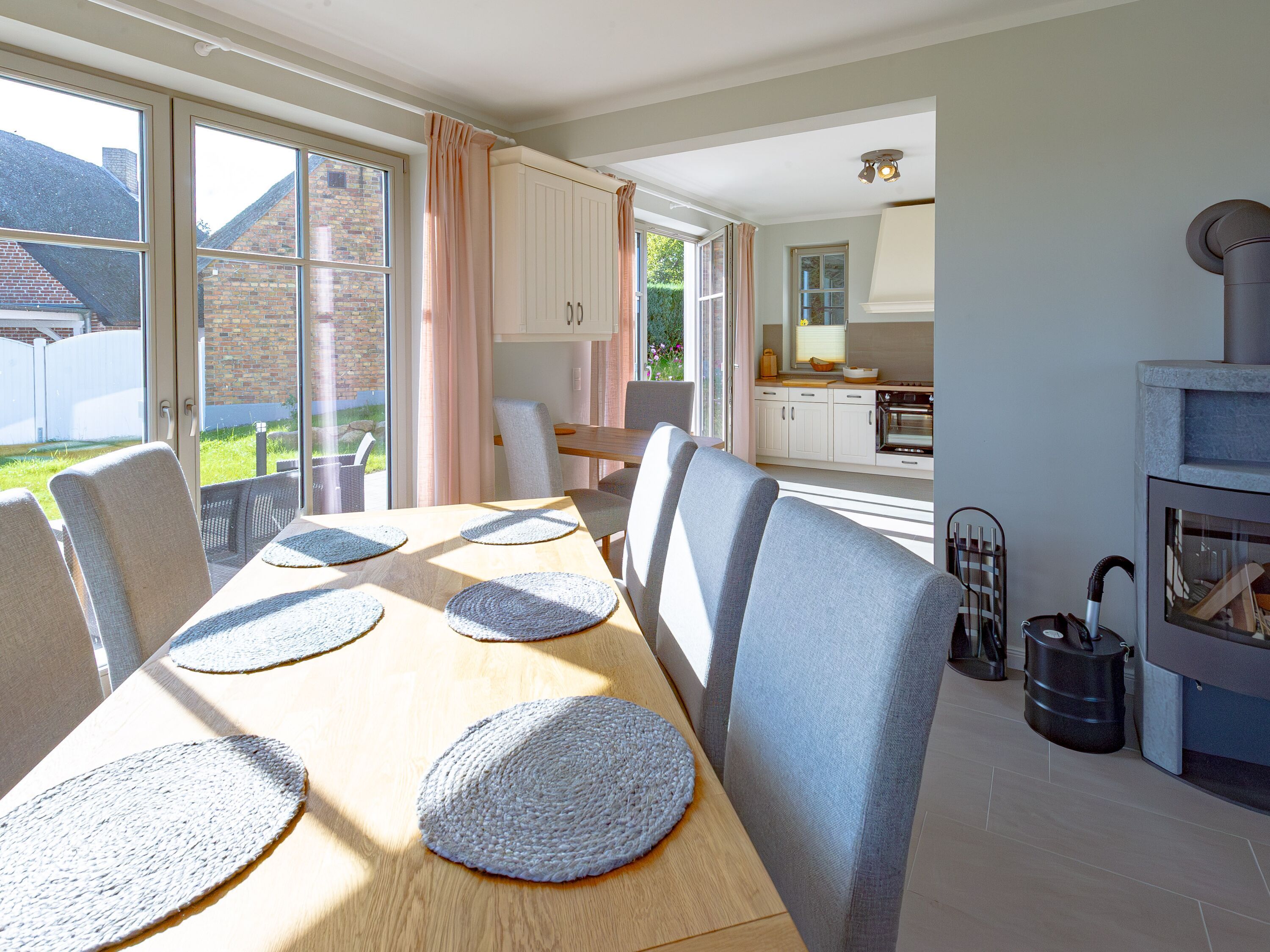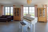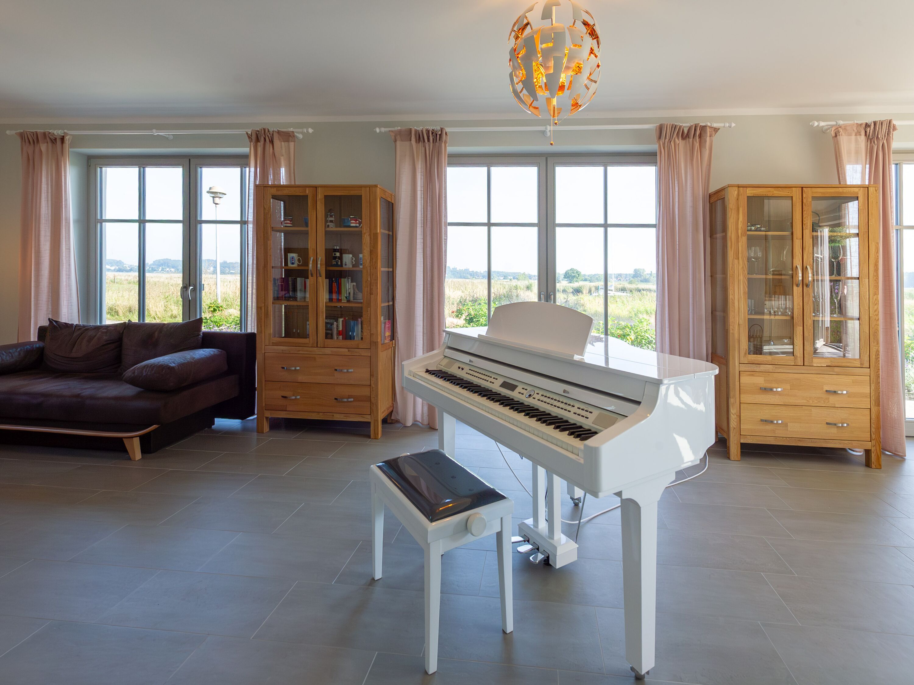 Herzstück des Hauses ist der große, offene Wohnbereich mit bequemen Sitzmöbeln, Smart-TV, Kaminofen, Esstisch, Küche und der vorgelagerten Sonnenterrasse. Alle Musikfreunde werden sich besonders über das E-Piano freuen, das nicht nur sehr dekorativ ausschaut, sondern für das auch die passenden Notenbücher in reicher Auswahl vorhanden sind.