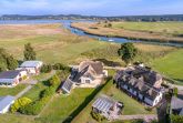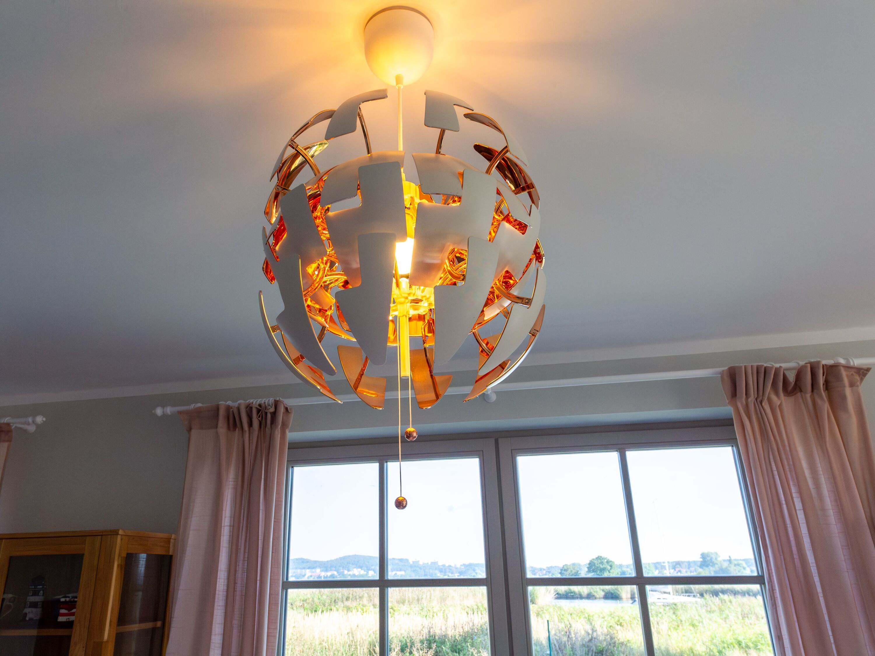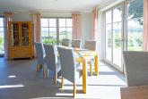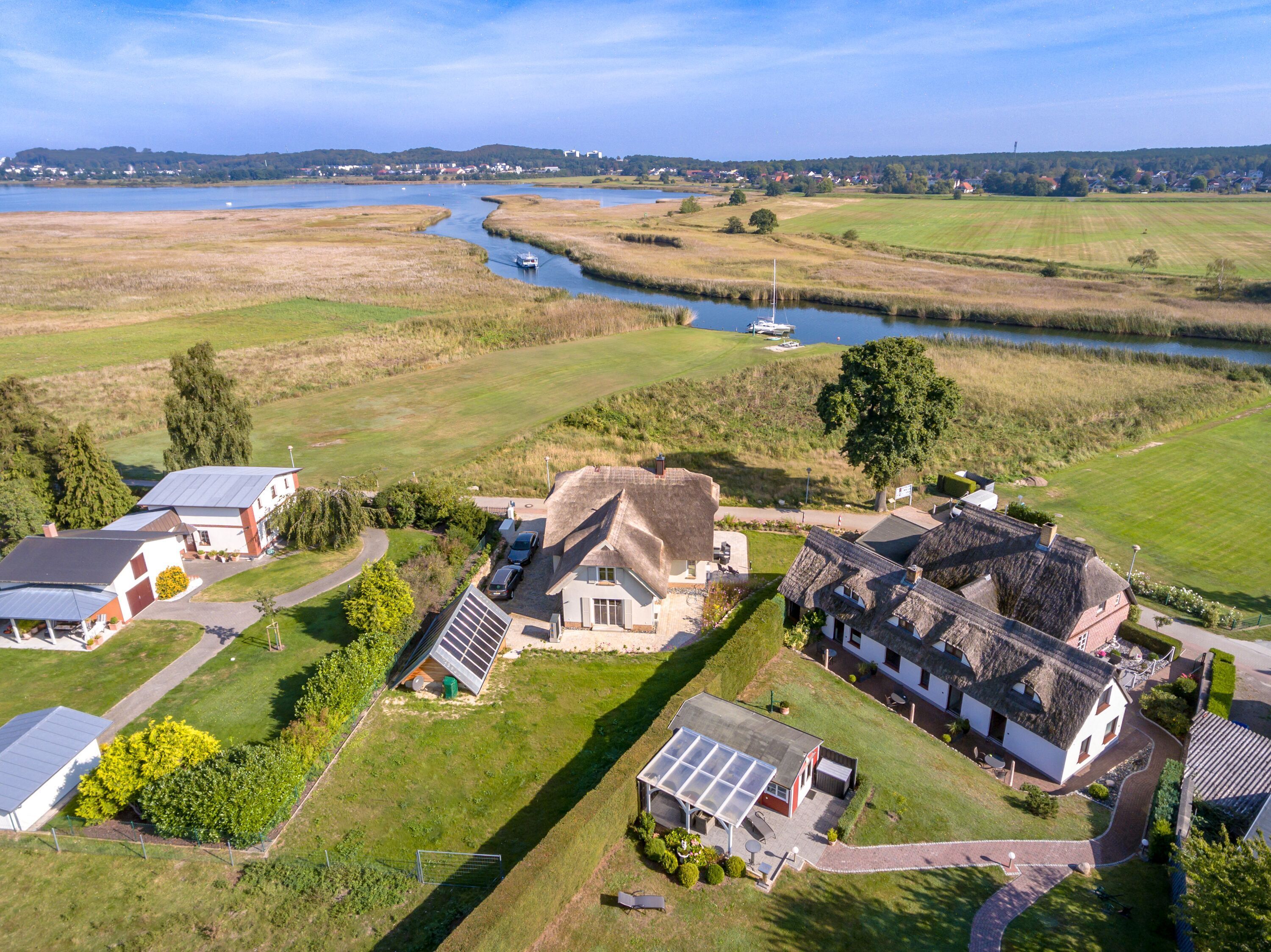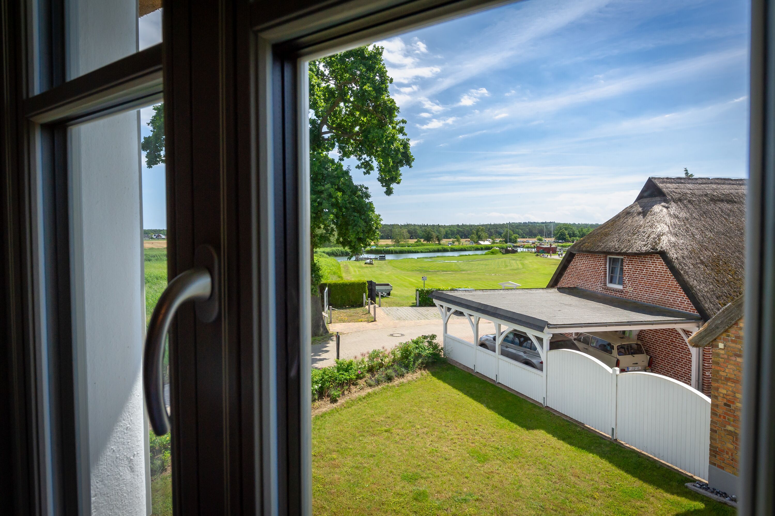 Die bodentiefen Fenster eröffnen einen schönen Blick auf die Wiesen- und Schilflandschaft an der Baaber Bek, die den Selliner See mit der südrügenschen Boddenlandschaft verbindet. Nur einen Katzensprung vom Haus entfernt befindet sich denn auch Rügens wohl kürzeste Fährverbindung, mit der Personen und Fahrräder bequem aufs andere Ufer nach Baabe und weiter in Richtung Mönchgut gelangen können.