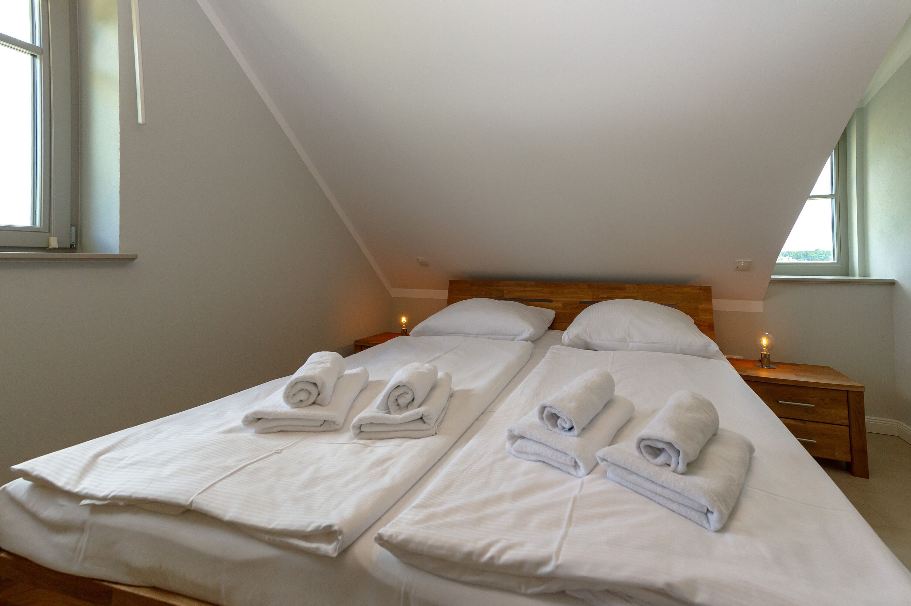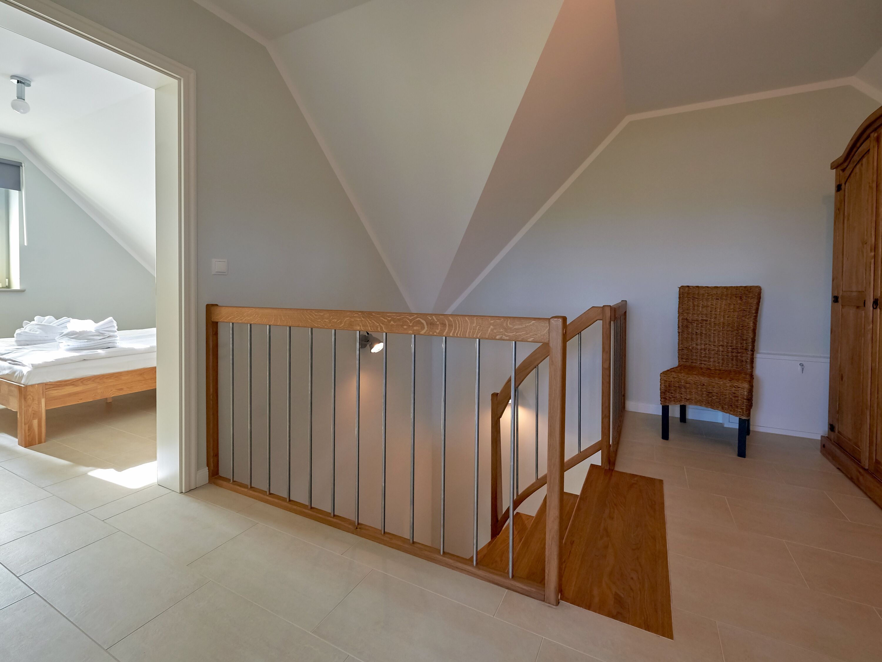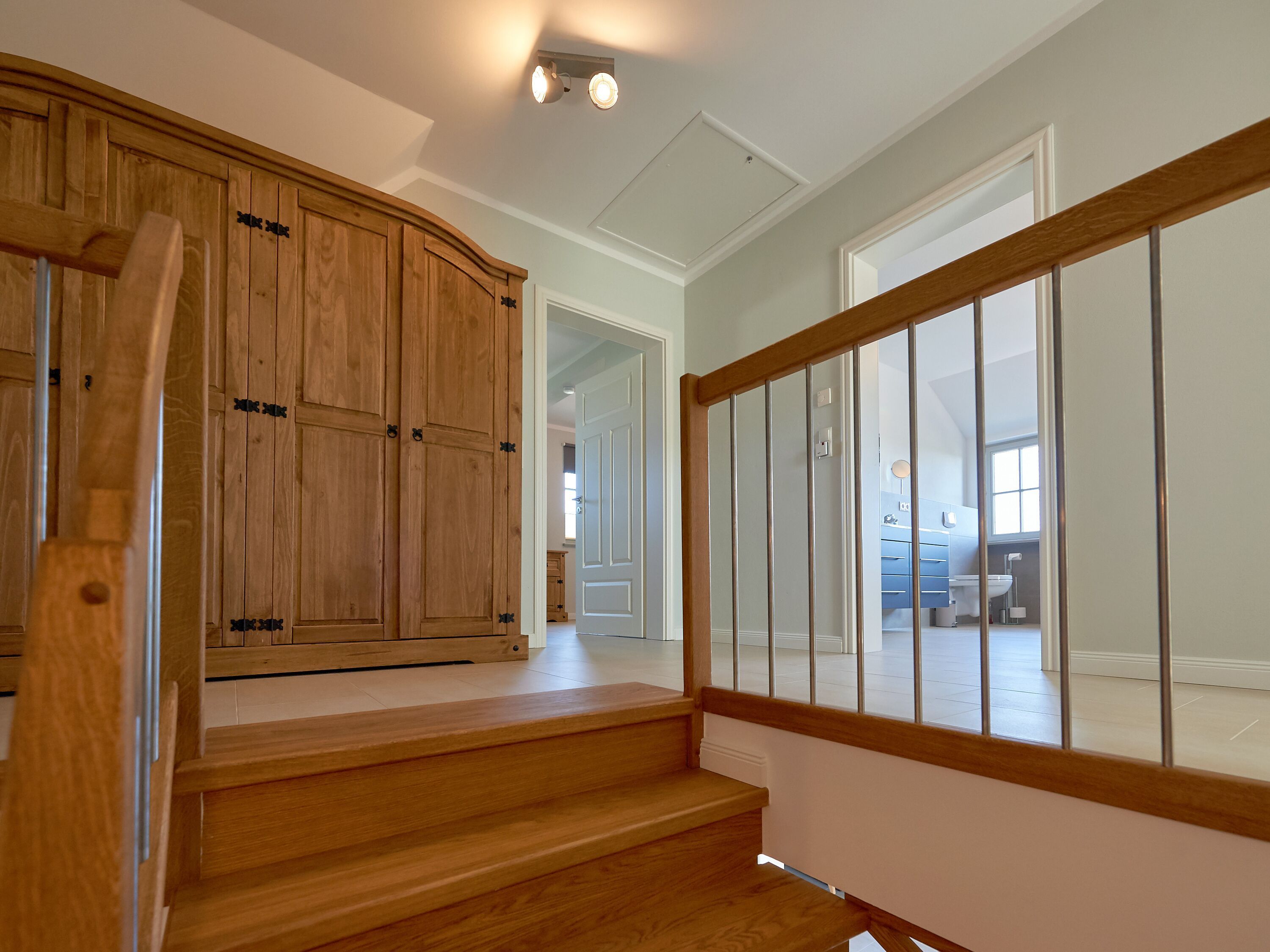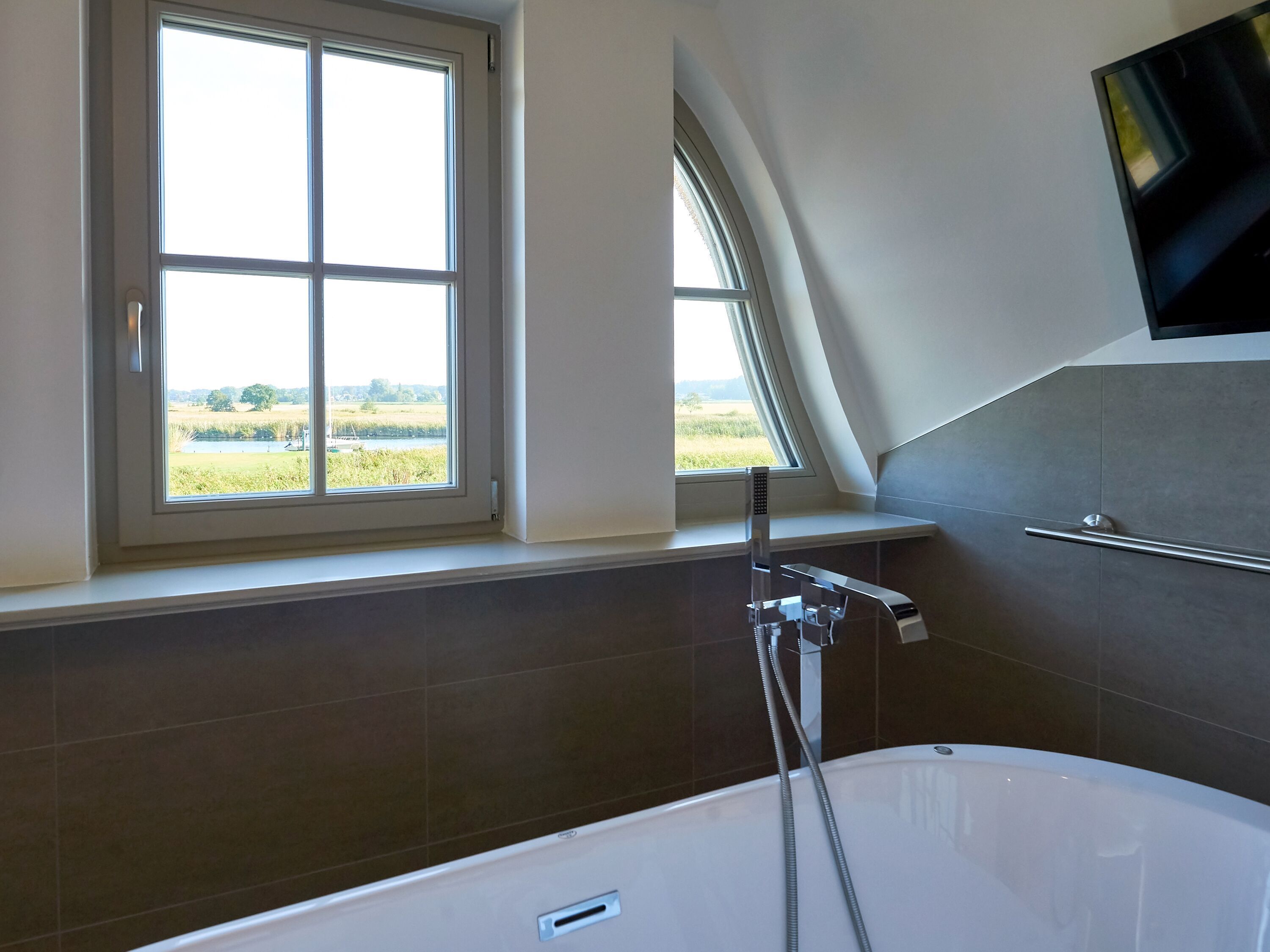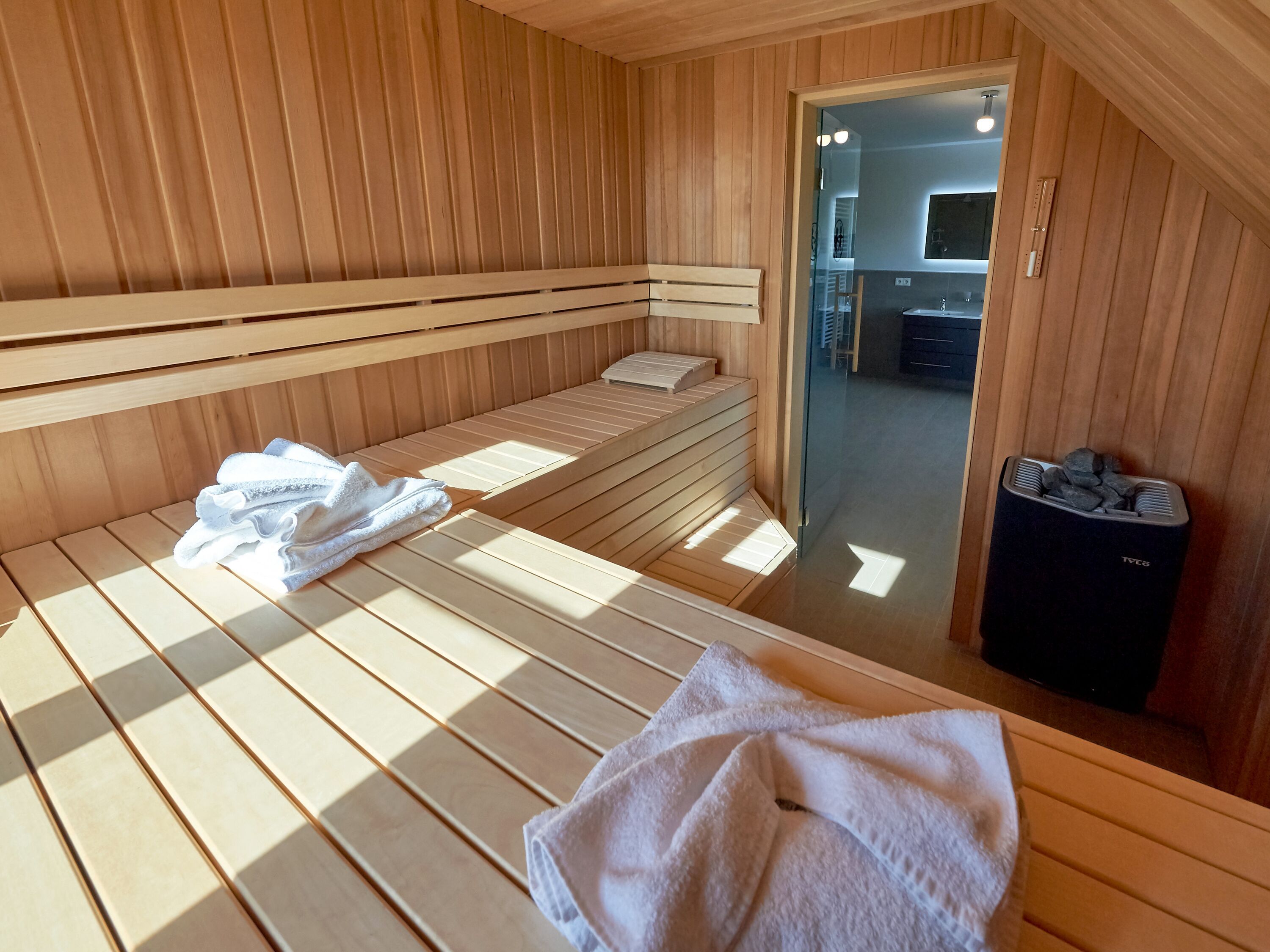 Ein paar Treppenstufen höher warten unter romantischen Dachschrägen Ihre beiden Schlafzimmer mit kuscheligen Doppelbetten (1,80 x 2,00m), eigenem Fernseher und geräumigen Kleiderschränken auf Sie. Im größeren der beiden Schlafzimmer befinden sich außerdem ein Einzelbett (90 x 2,00 m) sowie eine zusätzliche Couch. Für Begeisterung sorgt ganz sicher das Masterbad mit freistehender Whirlwanne plus Fernseher, einer ebenerdigen Dusche, einer Relaxliege und Ihrer ganz privaten Sauna. Hier lässt es sich wunderbar entspannen und genießen. Den Blick auf die traumhafte Landschaft vor dem Haus gibt´s gratis dazu.