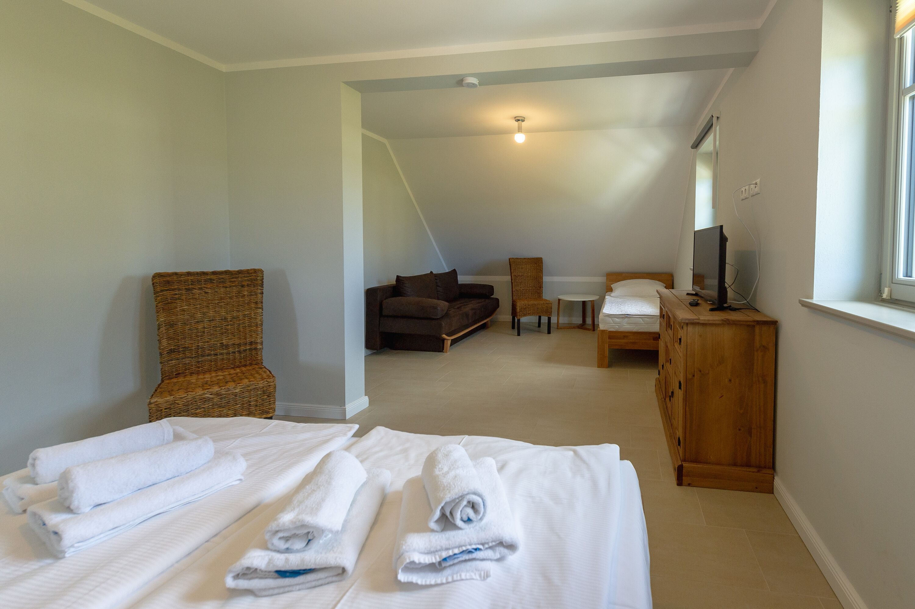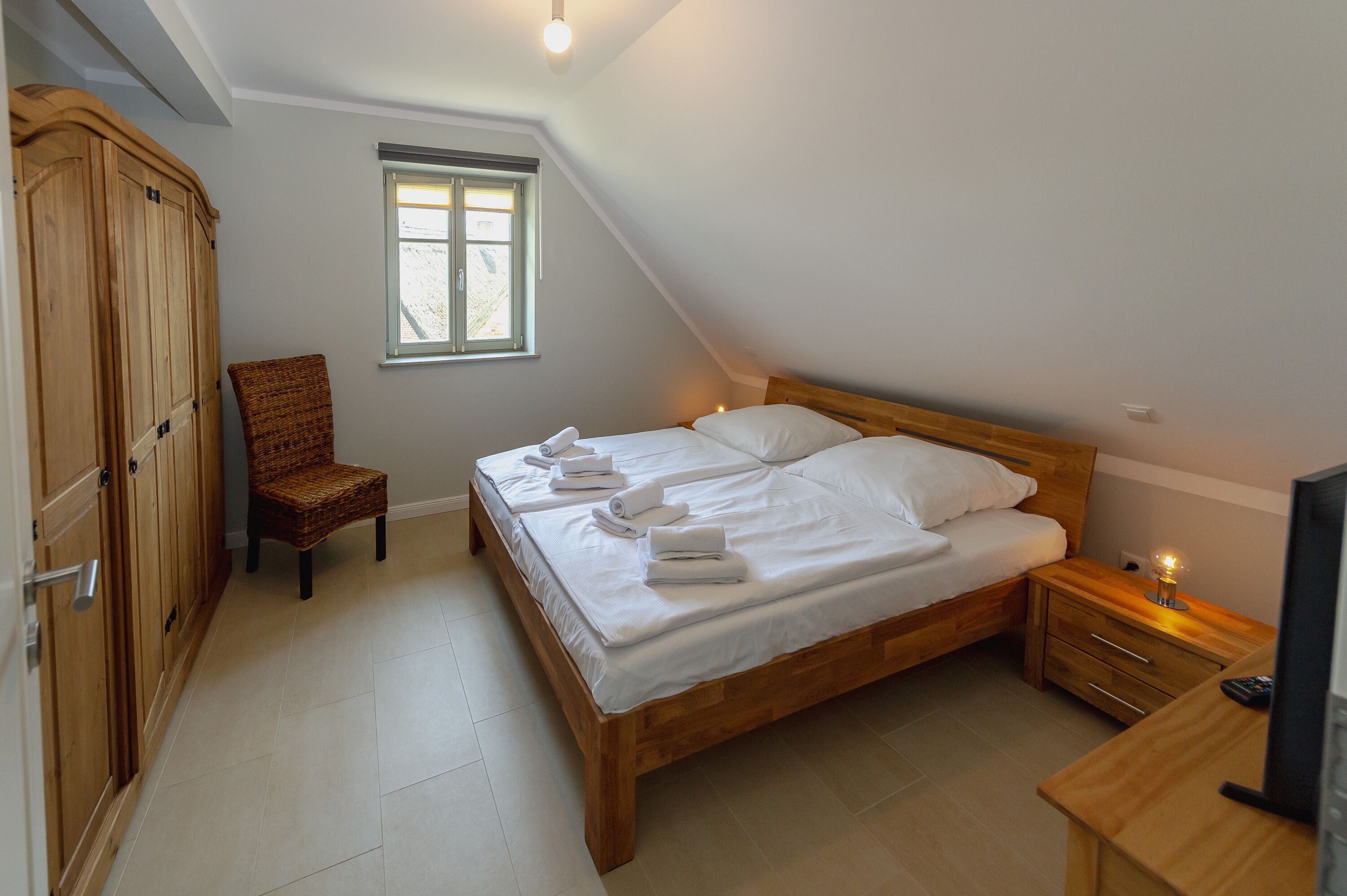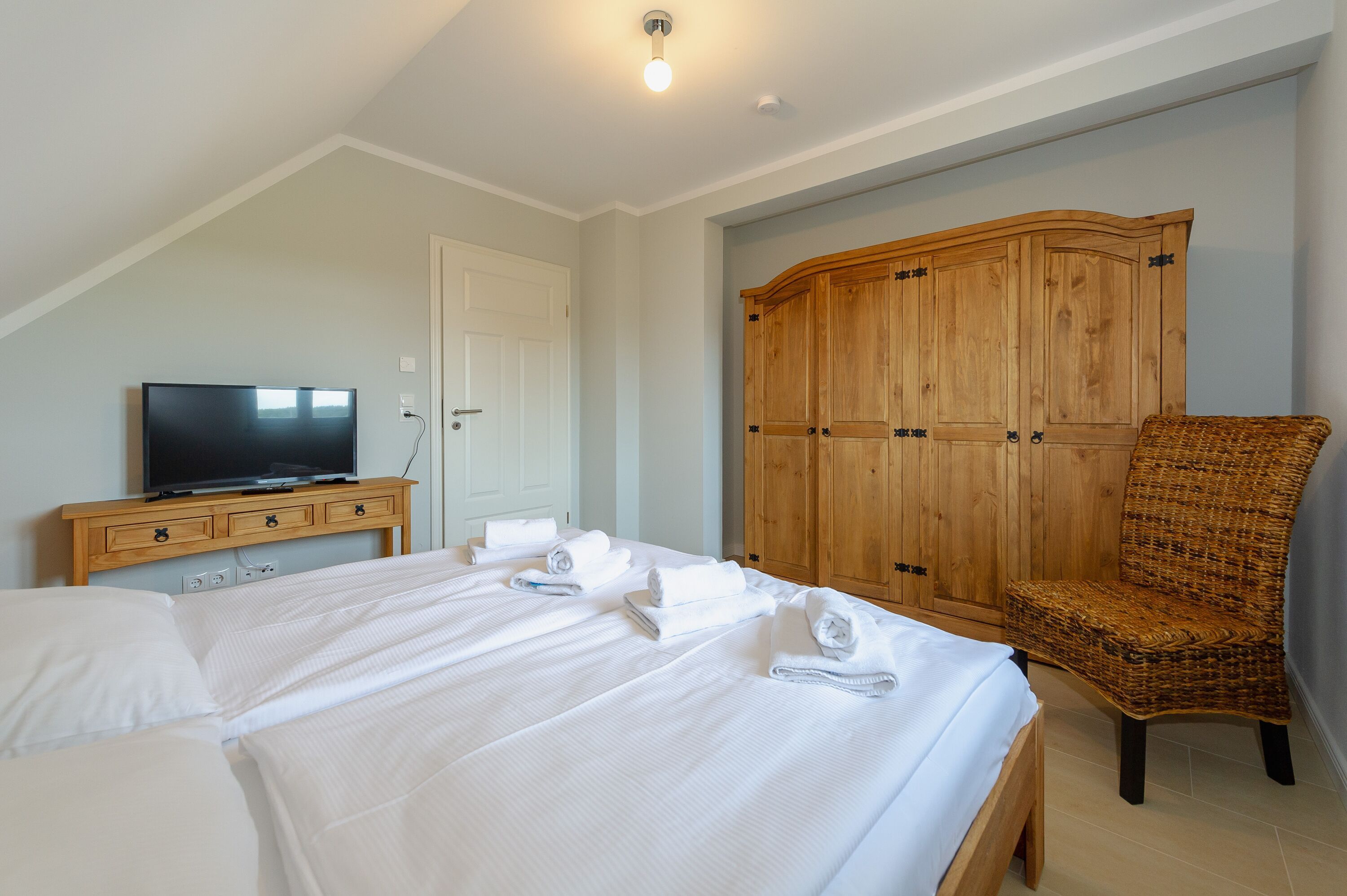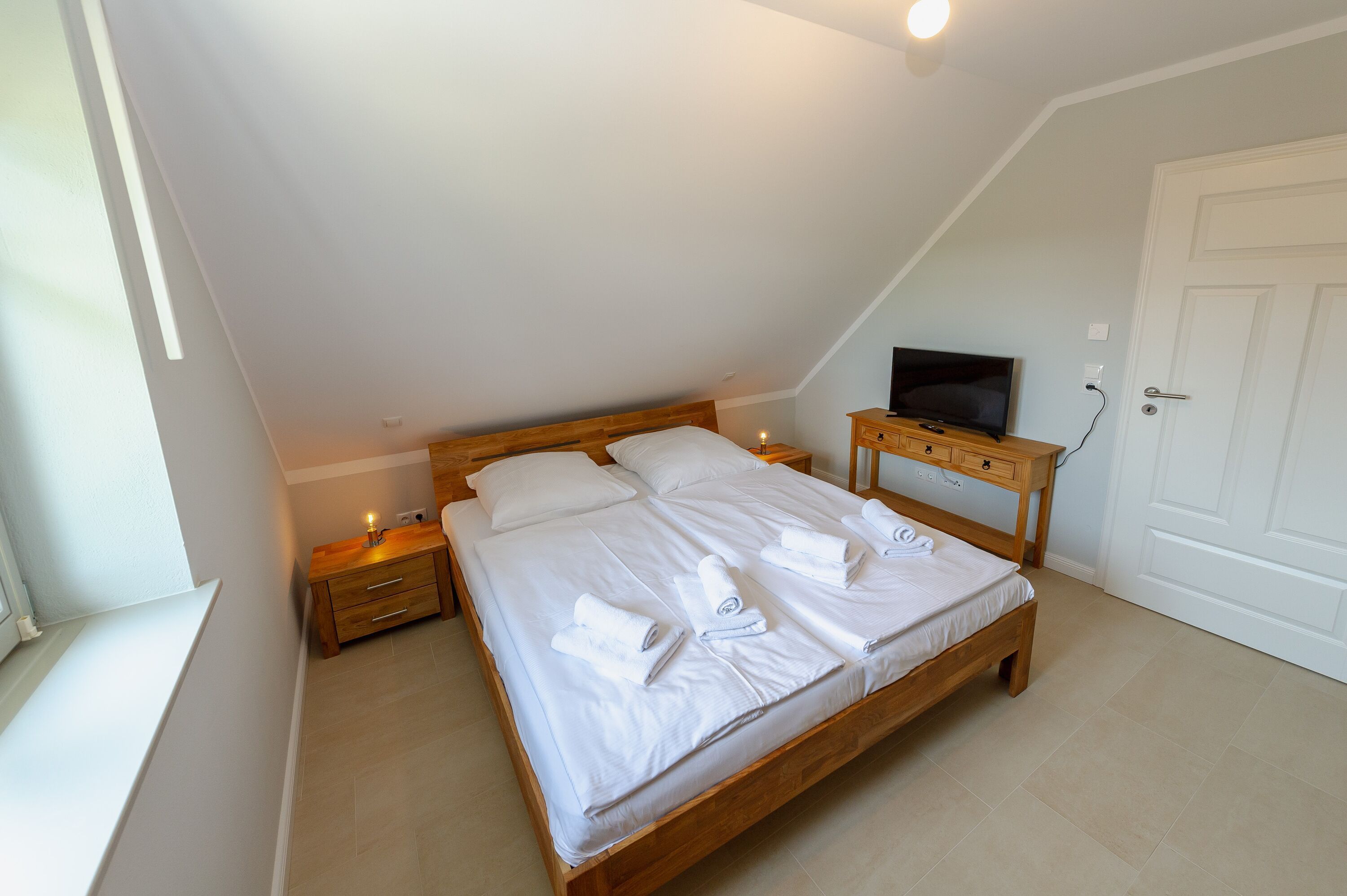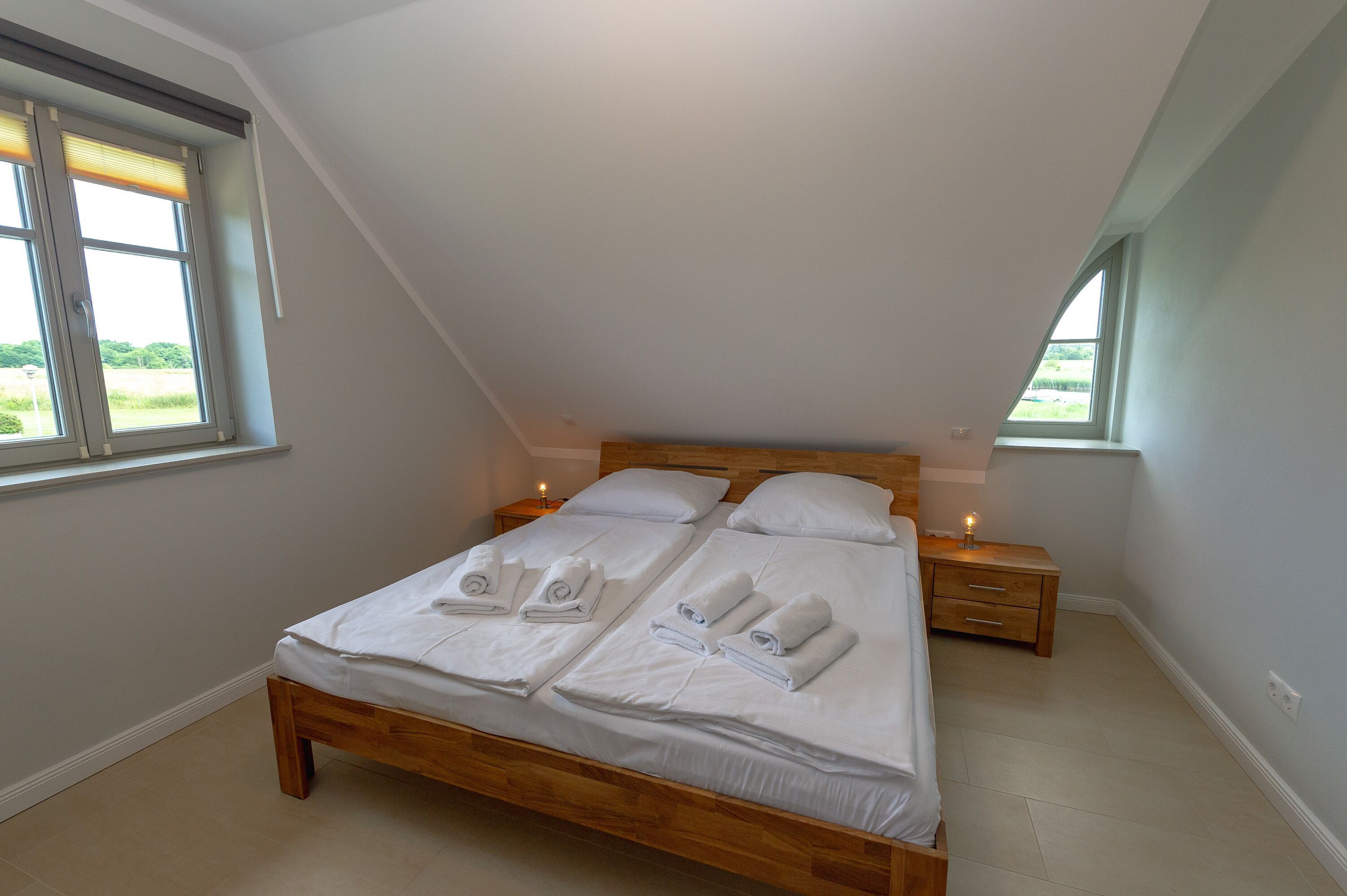 Ein paar Treppenstufen höher warten unter romantischen Dachschrägen Ihre beiden Schlafzimmer mit kuscheligen Doppelbetten (1,80 x 2,00m), eigenem Fernseher und geräumigen Kleiderschränken auf Sie. Im größeren der beiden Schlafzimmer befinden sich außerdem ein Einzelbett (90 x 2,00 m) sowie eine zusätzliche Couch. Für Begeisterung sorgt ganz sicher das Masterbad mit freistehender Whirlwanne plus Fernseher, einer ebenerdigen Dusche, einer Relaxliege und Ihrer ganz privaten Sauna. Hier lässt es sich wunderbar entspannen und genießen. Den Blick auf die traumhafte Landschaft vor dem Haus gibt´s gratis dazu.