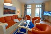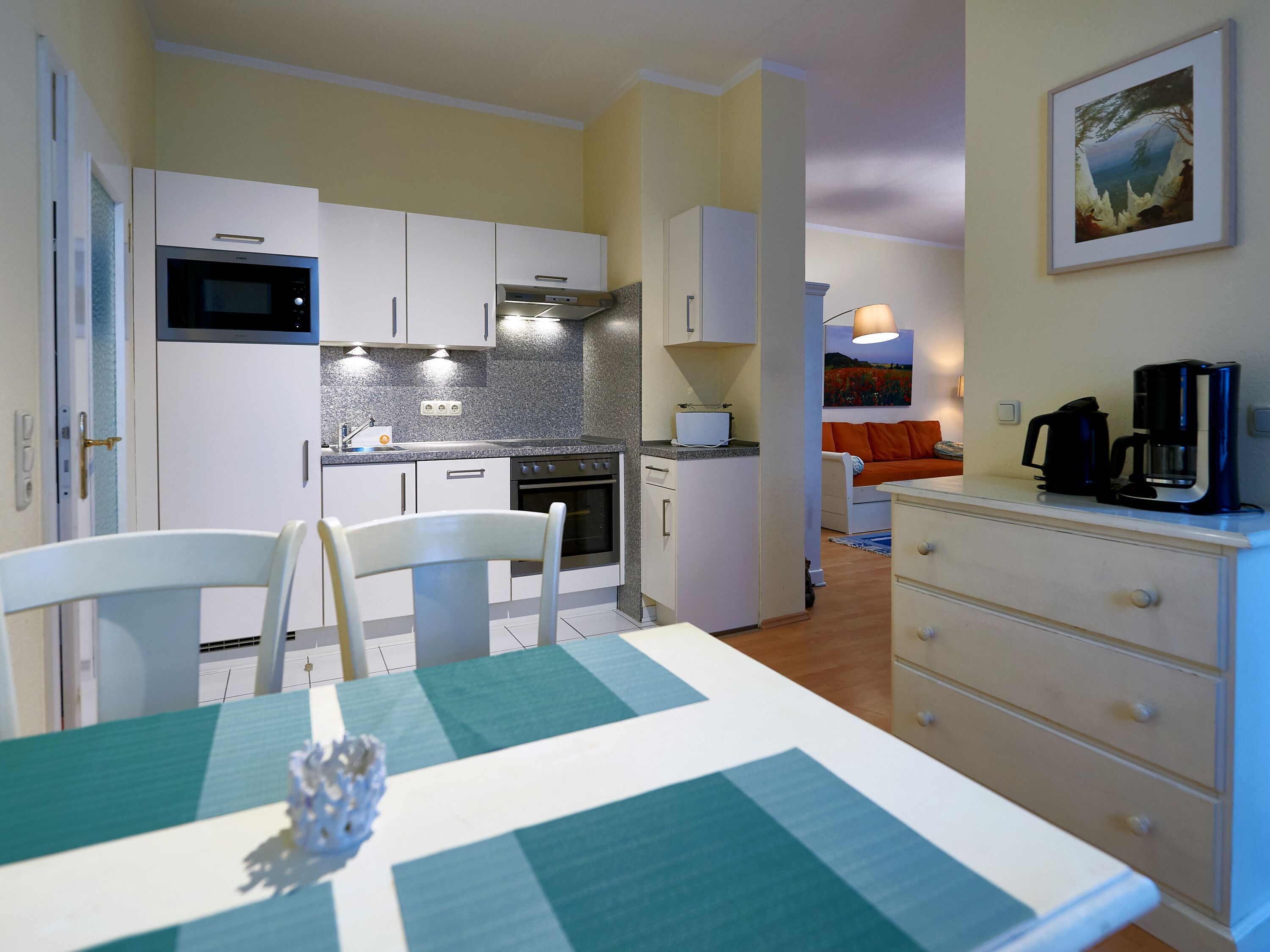 Das geräumige Wohn- und Esszimmer mit integrierter Küche ist räumlich geschickt in die verschiedenen Funktionsbereiche unterteilt. Zur technischen Ausstattung gehören ein Flachbild-TV, ein Radio mit CD-Player und kostenfreies W-LAN. Selbstverständlich ist auch eine kleine Auswahl an Büchern vorhanden. Die Couch lässt sich bei Bedarf in eine Schlafgelegenheit für zwei Personen verwandeln.