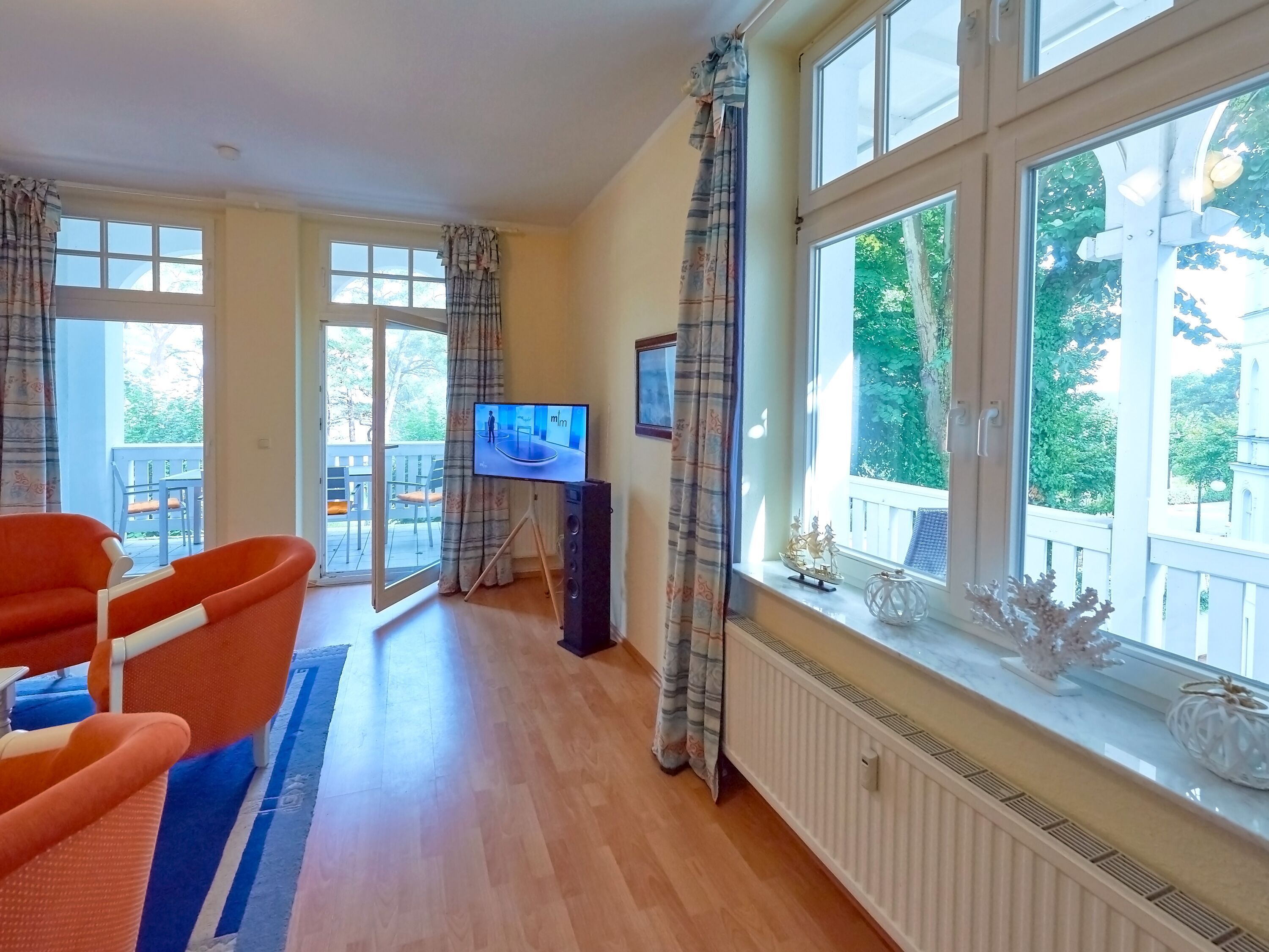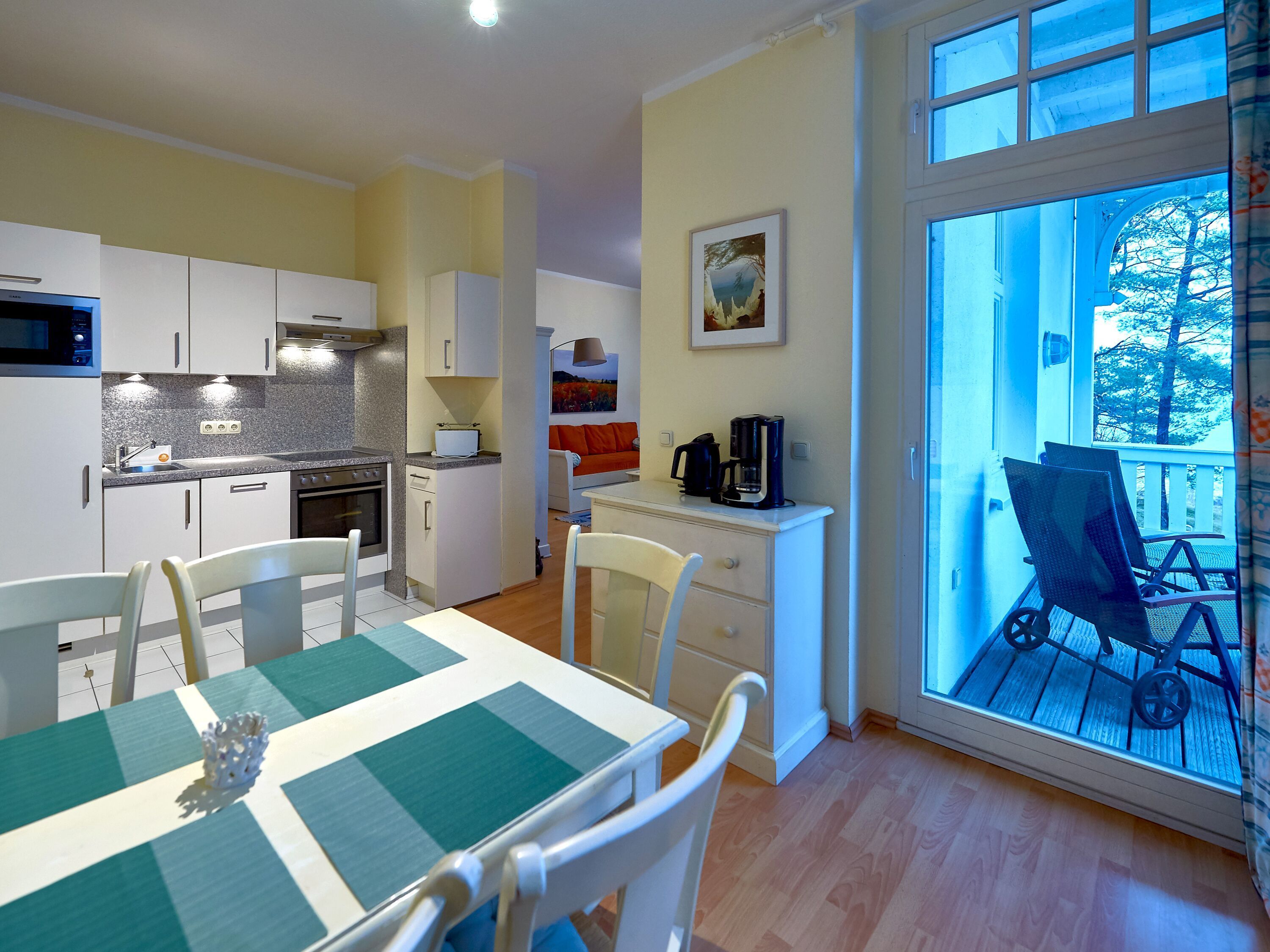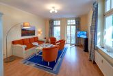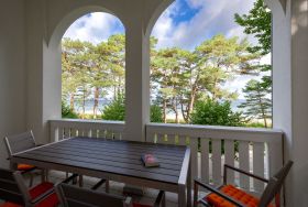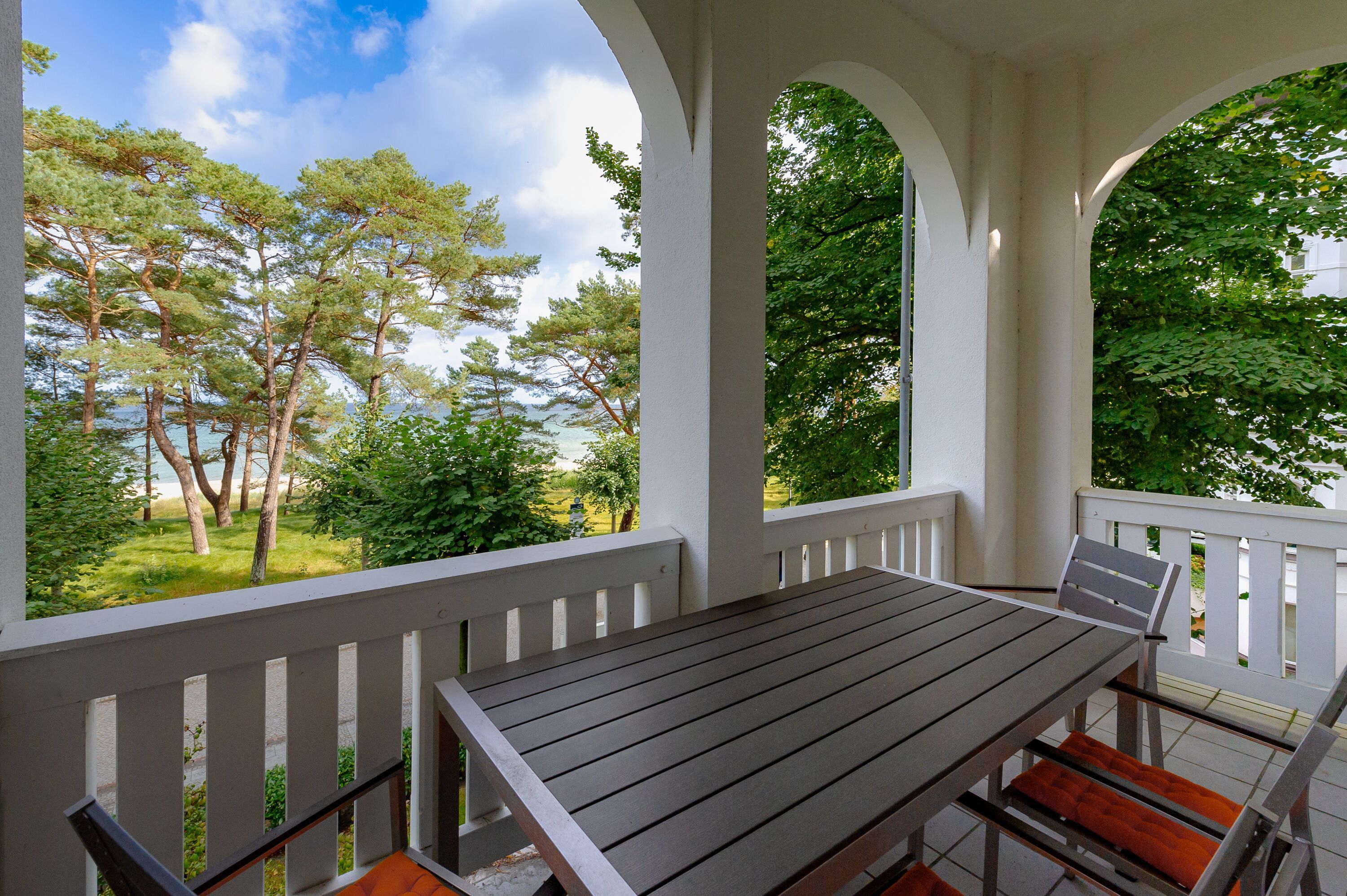 Dem Wohnzimmer seeseitig vorgelagert ist eine geräumige, überdachte Loggia mit herrlichem Panoramablick auf das Meer und das Treiben auf der autofreien Strandpromenade. Hier lässt es sich ganz vortrefflich frühstücken und die Morgensonne genießen. Seitlich gibt es darüber hinaus noch einen zusätzlichen Meerblick-Balkon mit zwei Sonnenliegen, ebenfalls überdacht.