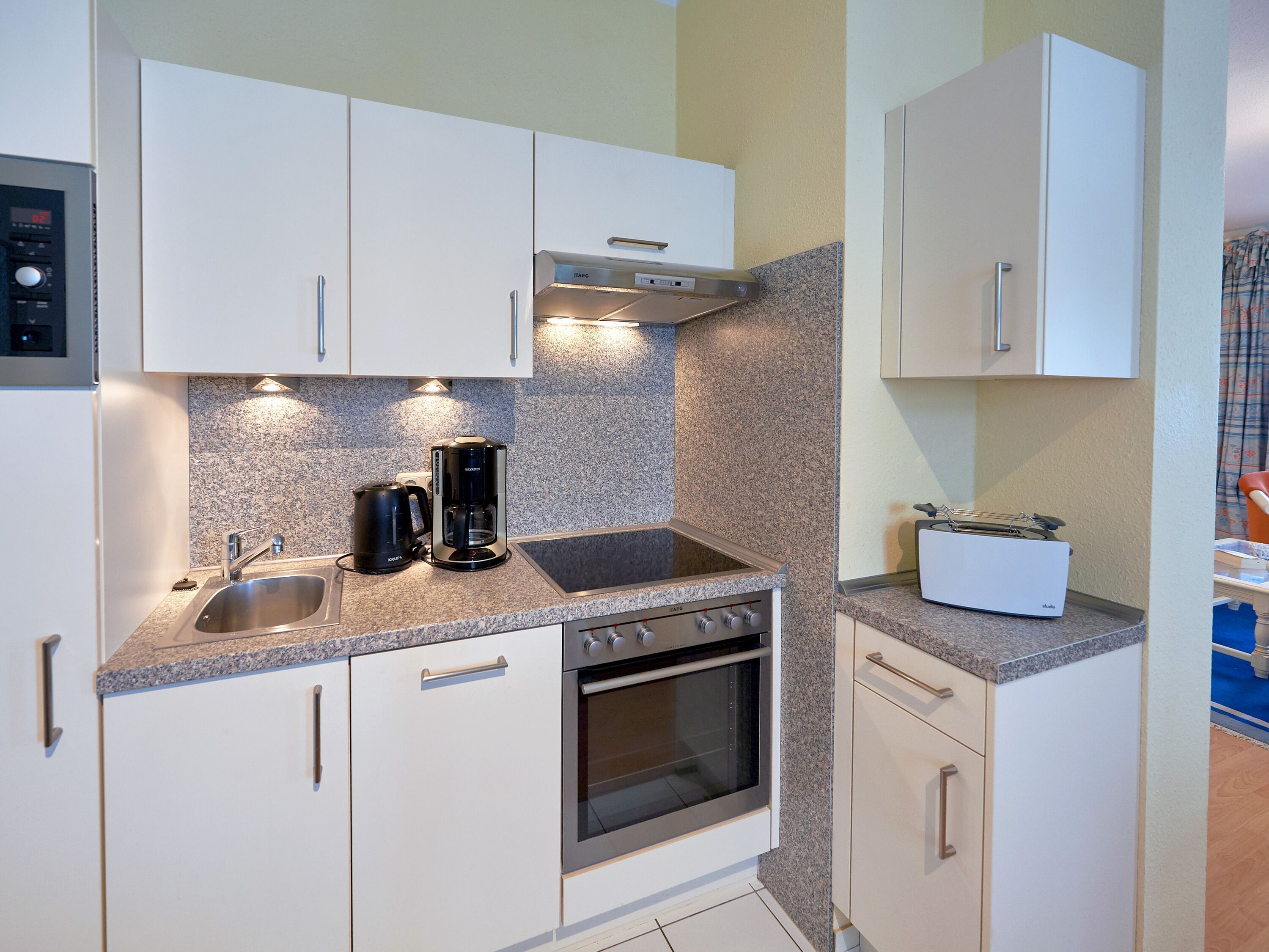 Die Küche Ihres Urlaubsdomizils bietet alles, damit man sich bequem selbst bekochen kann. Dazu zählen ein 4-Platten-Herd mit Backofen und Abzugshaube, eine Mikrowelle, ein Geschirrspüler, ein Kühlschrank sowie Kaffeemaschine, Wasserkocher und Toaster. Natürlich sind auch das nötige Kochgeschirr und sonstige Kleinutensilien vorhanden. Bis zum nächsten Einkaufsmarkt mit Bäcker sind es übrigens nur knapp 500 Meter.