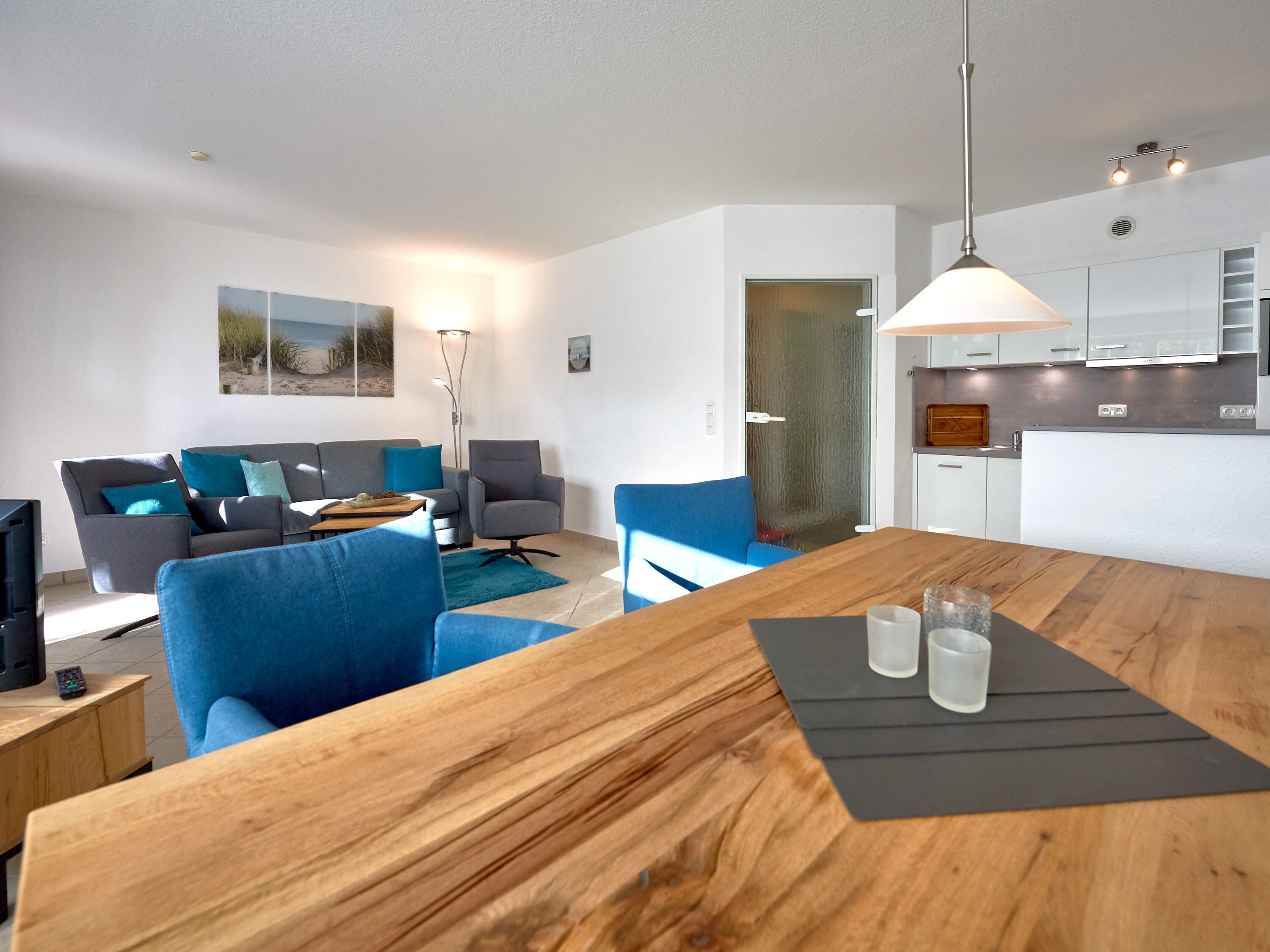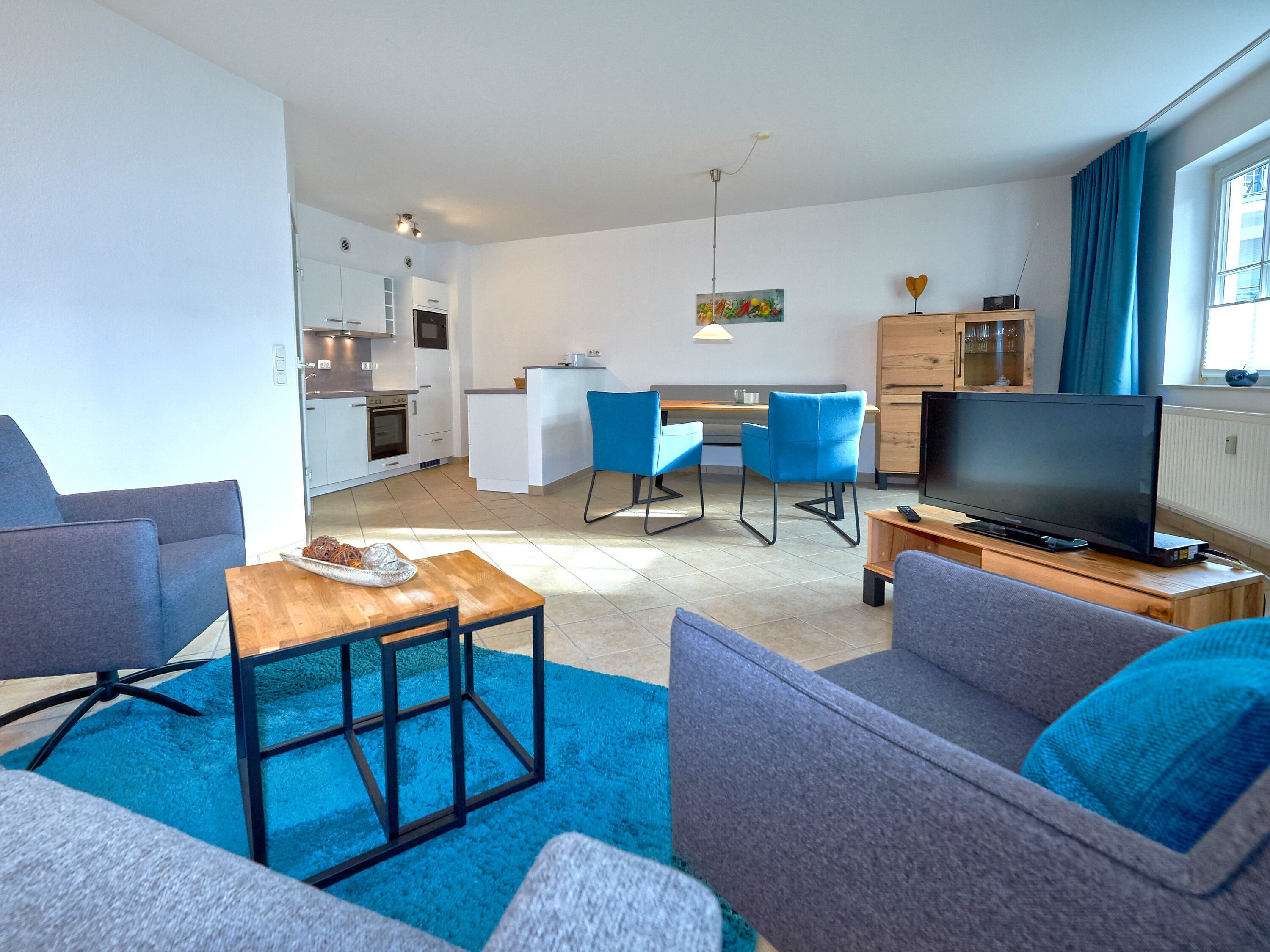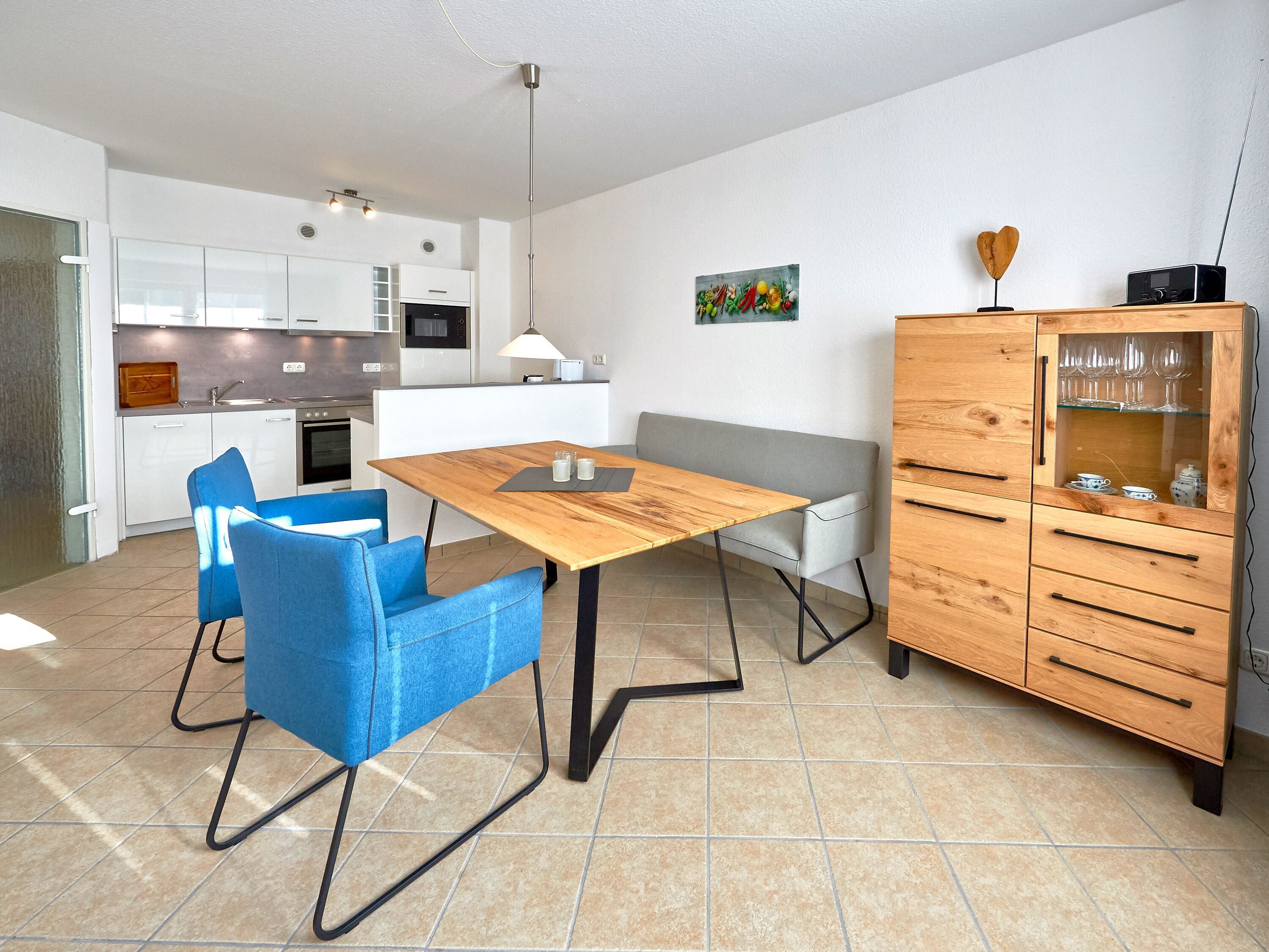 Herzstück Ihres Zuhauses auf Zeit ist das großzügige Wohn- und Esszimmer mit vorgelagertem Balkon und offener Küche. Geschickt in die einzelnen Funktionsbereiche unterteilt, können Sie hier wunderbar auf bequemen Polstermöbeln relaxen, mit der ganzen Familie speisen und natürlich auch nach Herzenslust kochen.