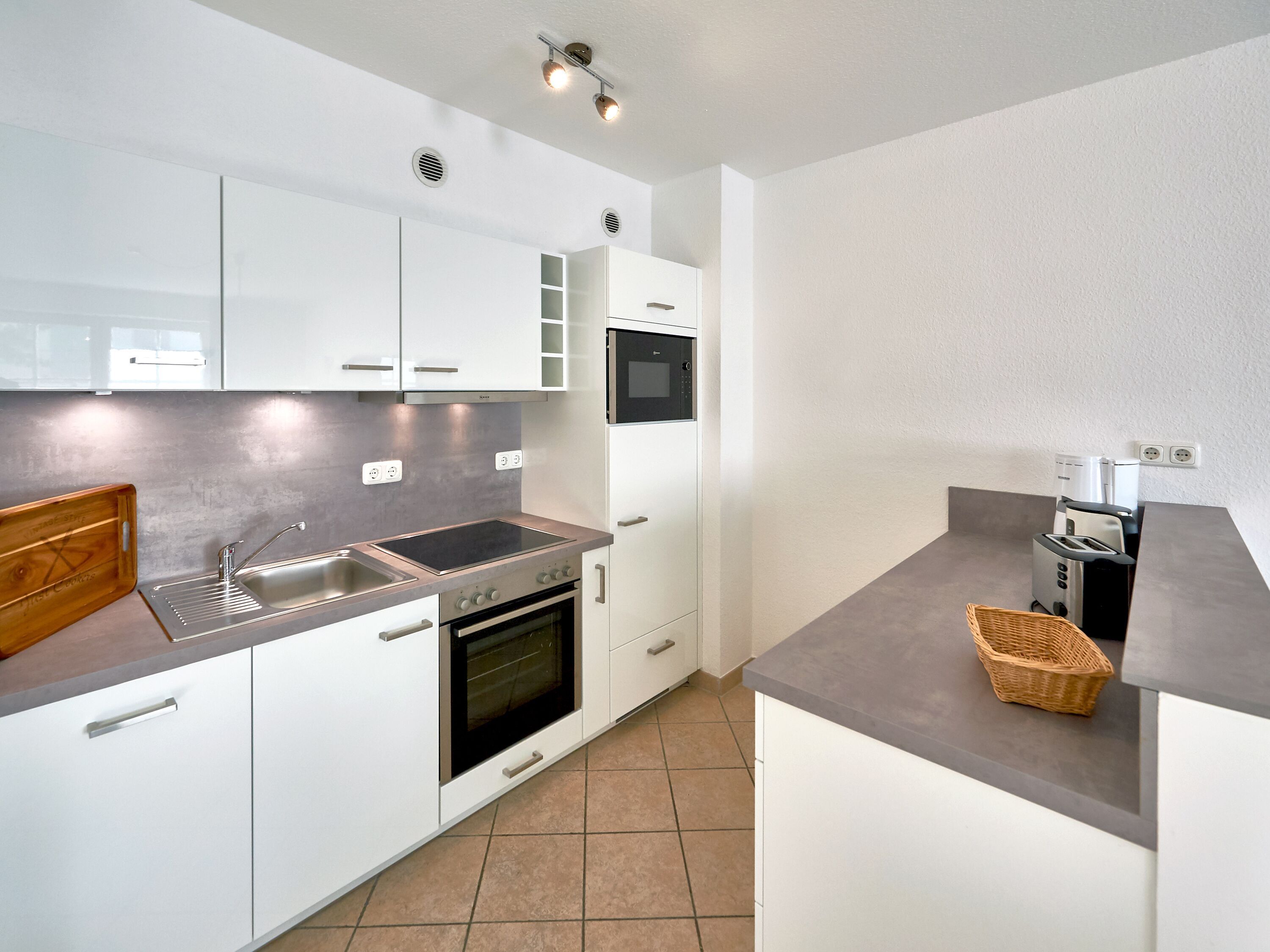 Die moderne Einbauküche ist bestens ausgestattet. Sie finden hier u.a. einen 4-Zonen-Ceranherd mit Backofen und Abzugshaube, eine Mikrowelle, einen Kühlschrank mit Gefrierfach, einen Geschirrspüler sowie eine Filterkaffeemaschine, einen Wasserkocher und einen Toaster. Selbstverständlich mangelt es auch nicht am nötigen Koch- und Essgeschirr. Der nächste Einkaufsmarkt mit Bäcker ist übrigens nur ca. 250 Meter entfernt.