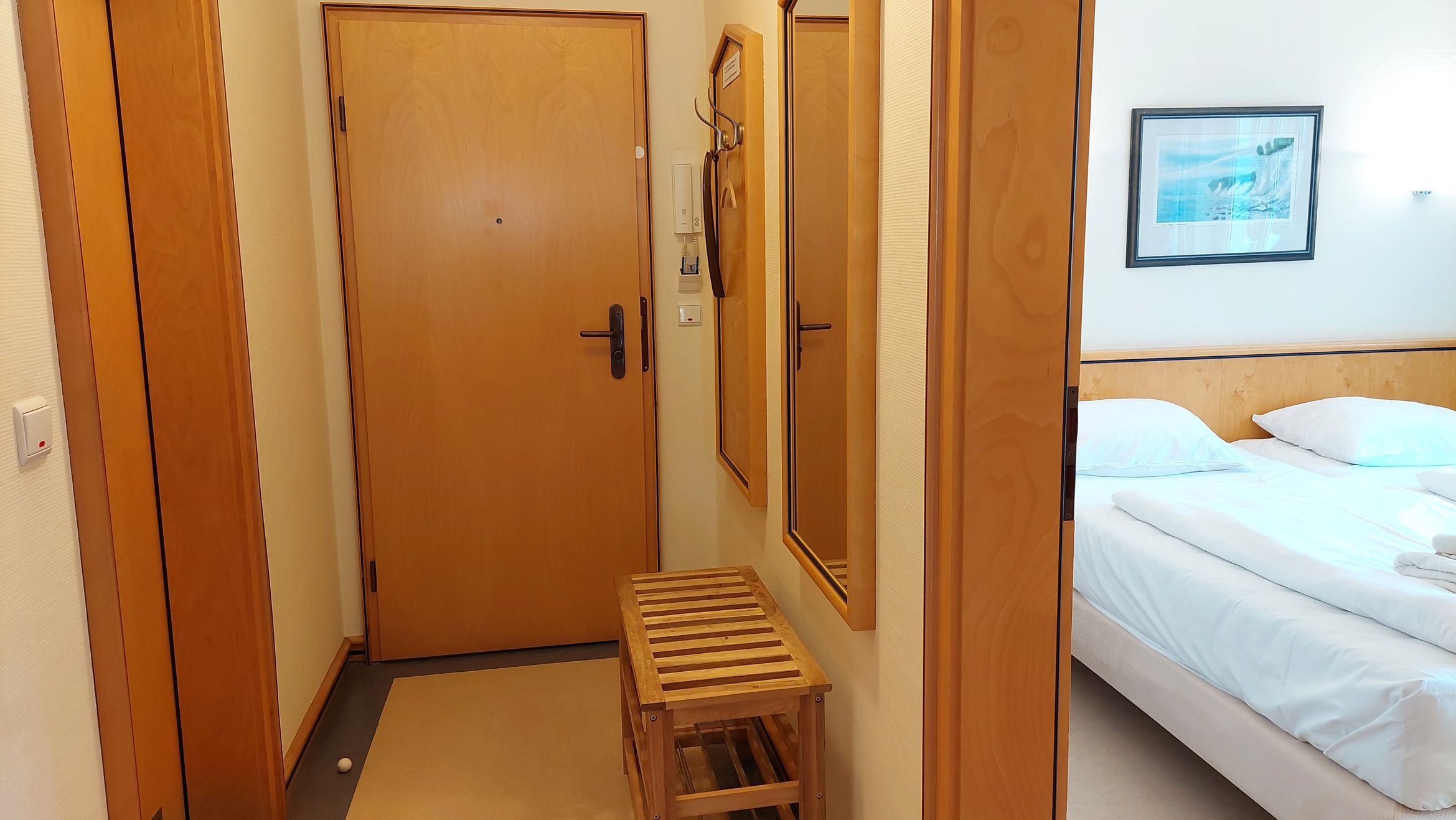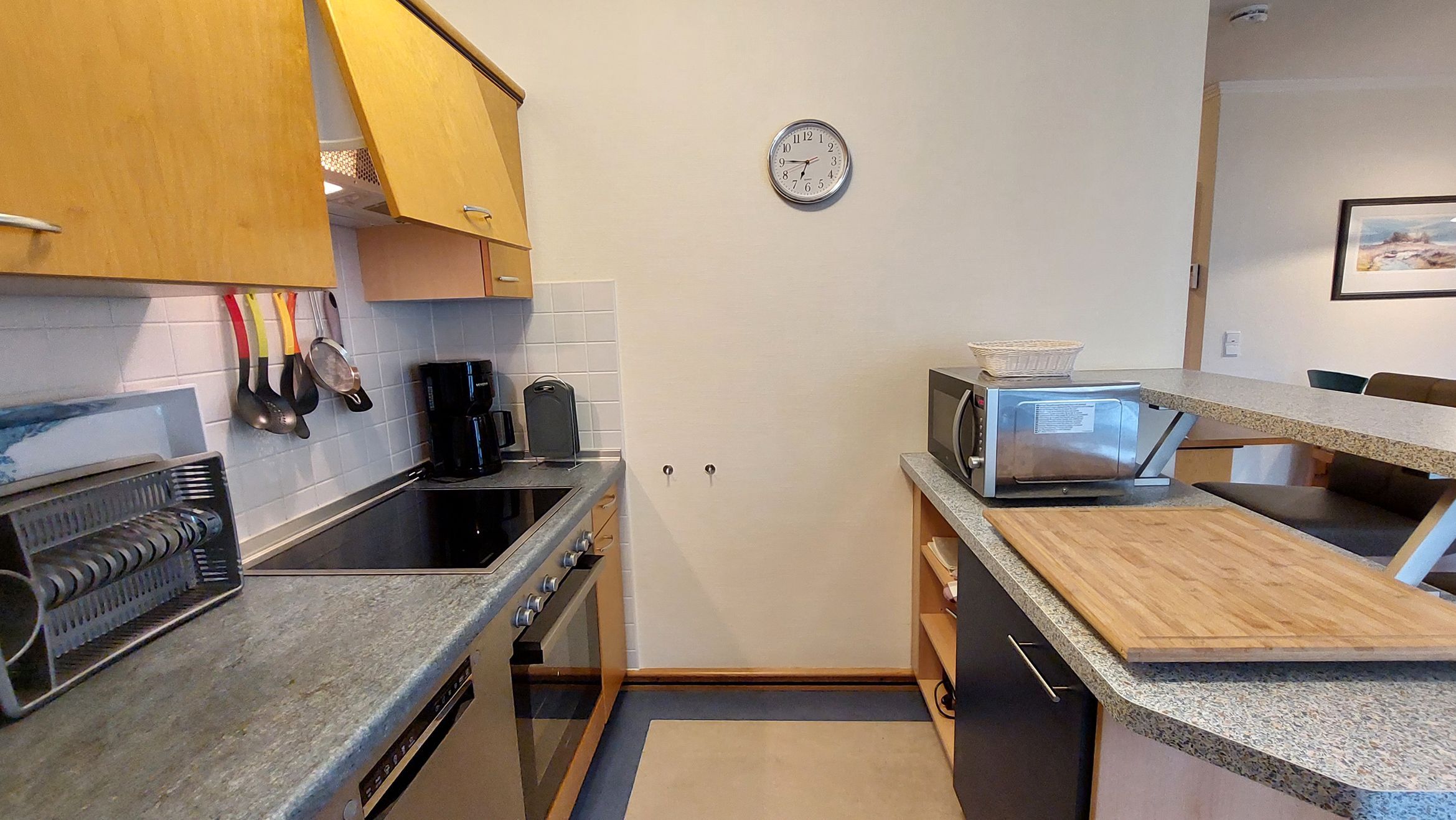 Die Wohnung verfügt über ein gemütliches Schlafzimmer und ein Badezimmer mit Dusche und WC. Die offene Küche ist mit allen nötigen Utensilien ausgestattet, um sich selbst verpflegen zu können. Dazu gehören unter anderem eine Küchenzeile mit Kaffeemaschine, Mikrowelle, Geschirrspüler und einem Tresen samt Barhockern.