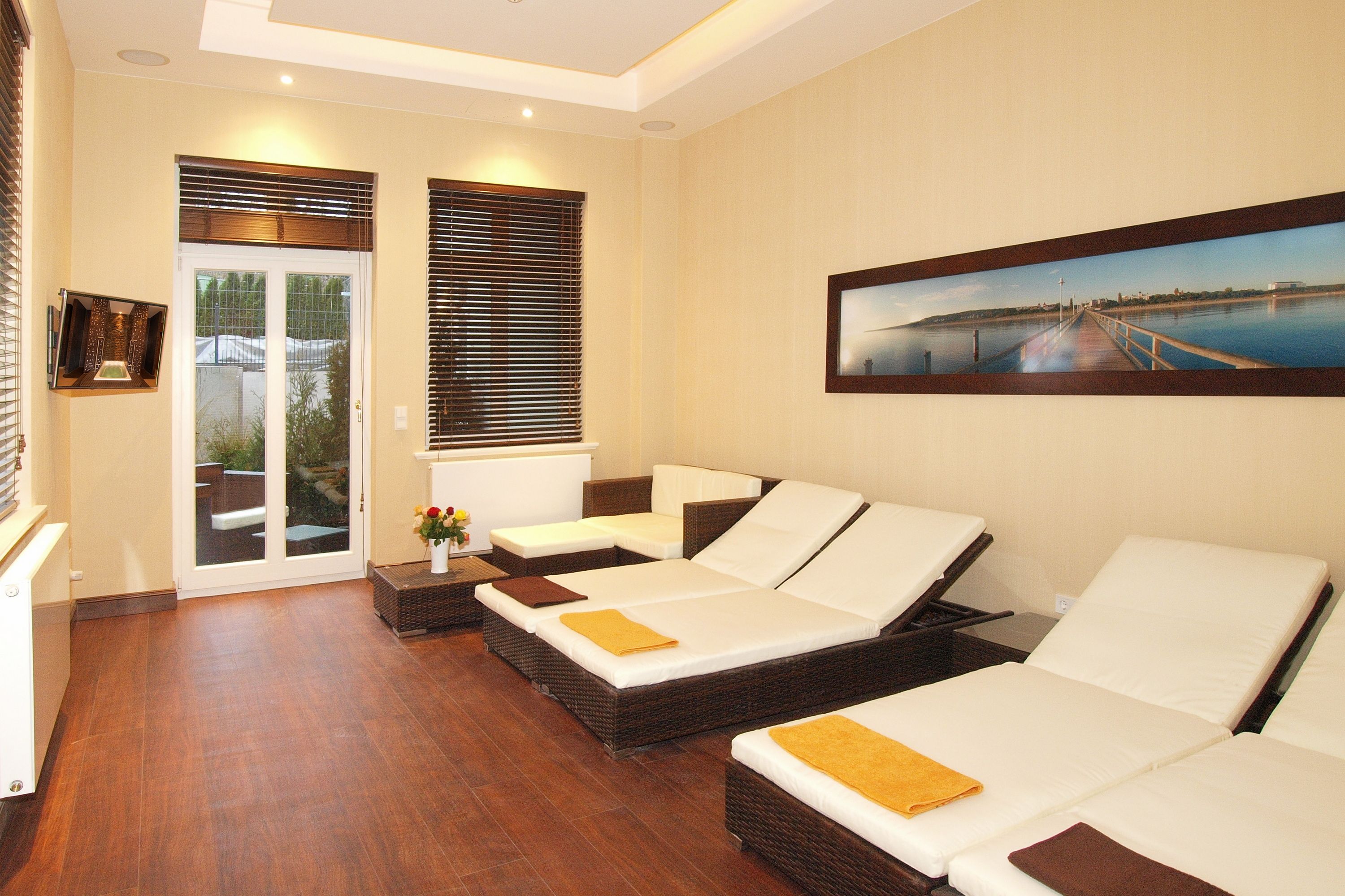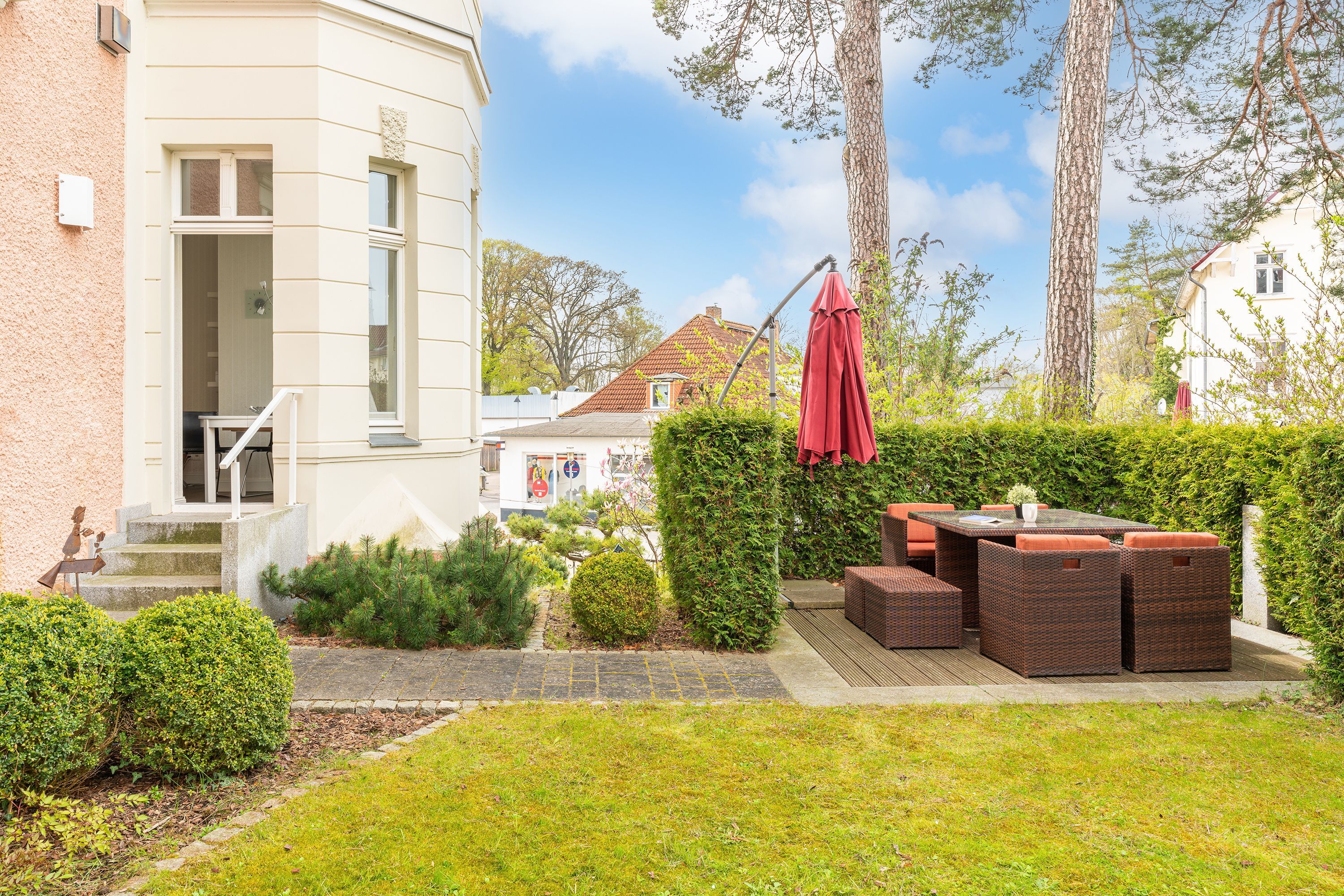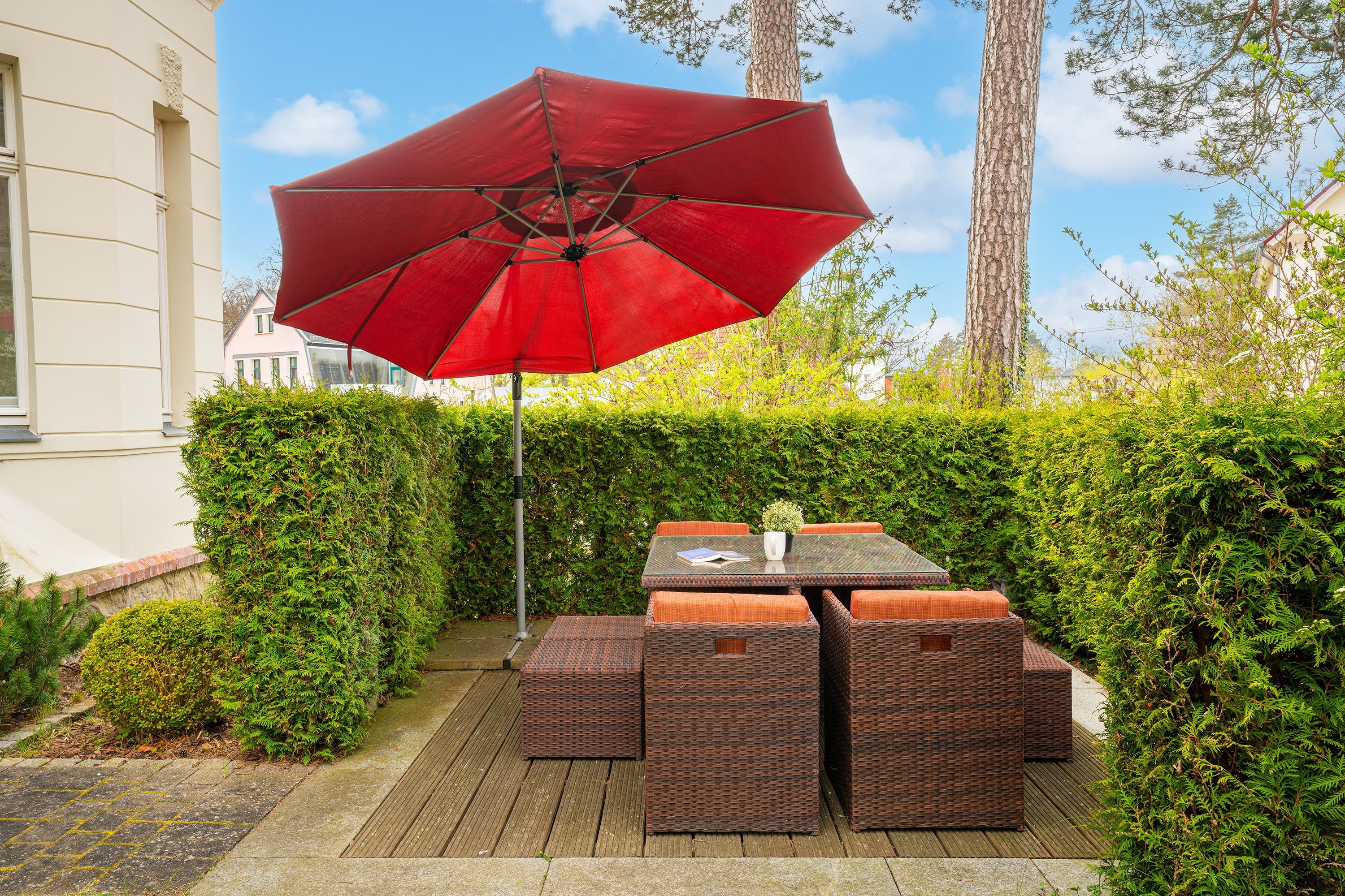 Hier wird Ihnen auf 66 Quadratmetern eine komplett ausgestattete Ferienwohnung mit eigener Nordost-Terrasse und Gartenanteil geboten, die in diesem Objekt einmalig ist. Des Weiteren können Sie auf gleicher Etage auf den Wellnessbereich zurückgreifen, der Ihnen ein einmaliges Saunaerlebnis in einer Ganzglassauna bietet mit eigenem Außenbereich.