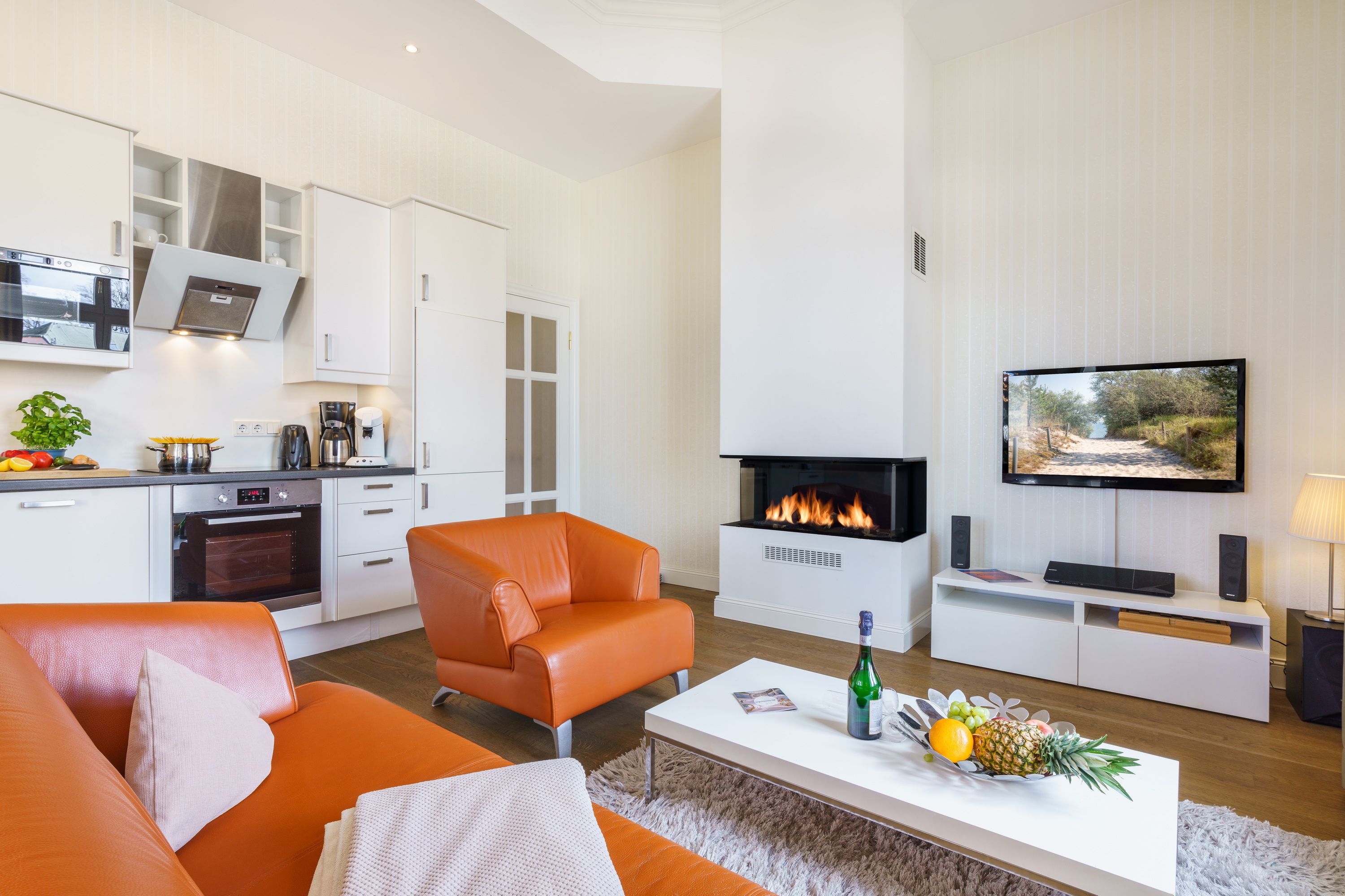 Die Wohnung selbst besticht durch Ihre stilvolle Einrichtung und wird mit einem Gaskamin (per Fernbedienung steuerbar) im Wohnzimmer abgerundet. Dieser lädt zu gemütlichen Stunden zu jeder Jahreszeit ein. Ein modernes Heimkinosystem mit Internetzugang sind selbstverständlich.