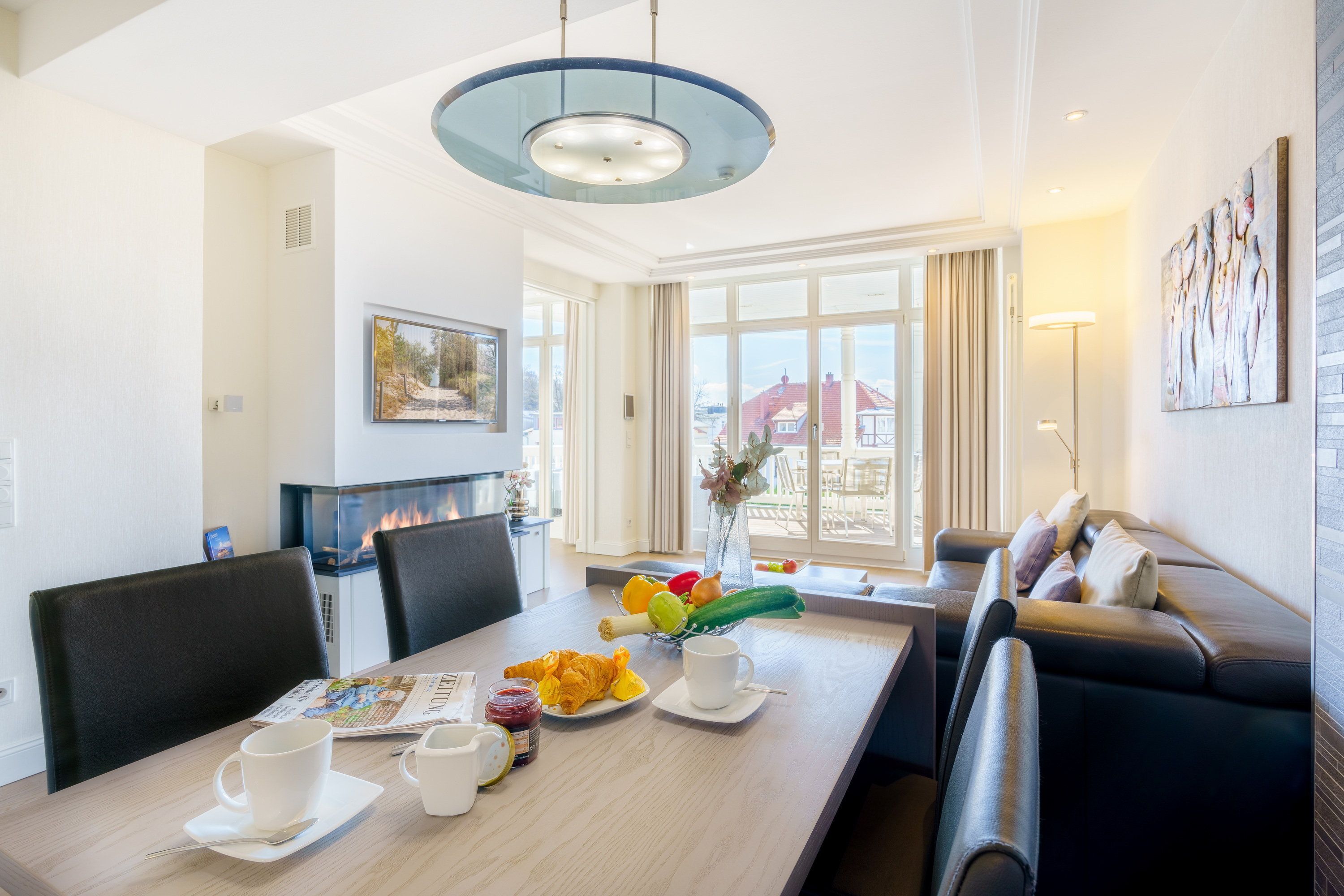 Vom Wohn- und Schlafbereich gelangen Sie auf den großzügigen Balkon, der wegen seiner historischen Holzsäulen und seiner enormen Größe in diesem Objekt einzigartig ist. Durch seine Südausrichtung werden Sie fast den ganzen Tag mit Sonne beschenkt, ein grandioser Blick über Zinnowitz inklusive. Damit Sie auf Ihrem Balkon auch längere Zeit verweilen können, ist er mit einer gemütlichen Loungeecke (Rattan Sofa) ausgestattet. Zudem steht ein Esstisch für gemeinsame Mahlzeiten an der frischen Ostseeluft bereit.