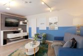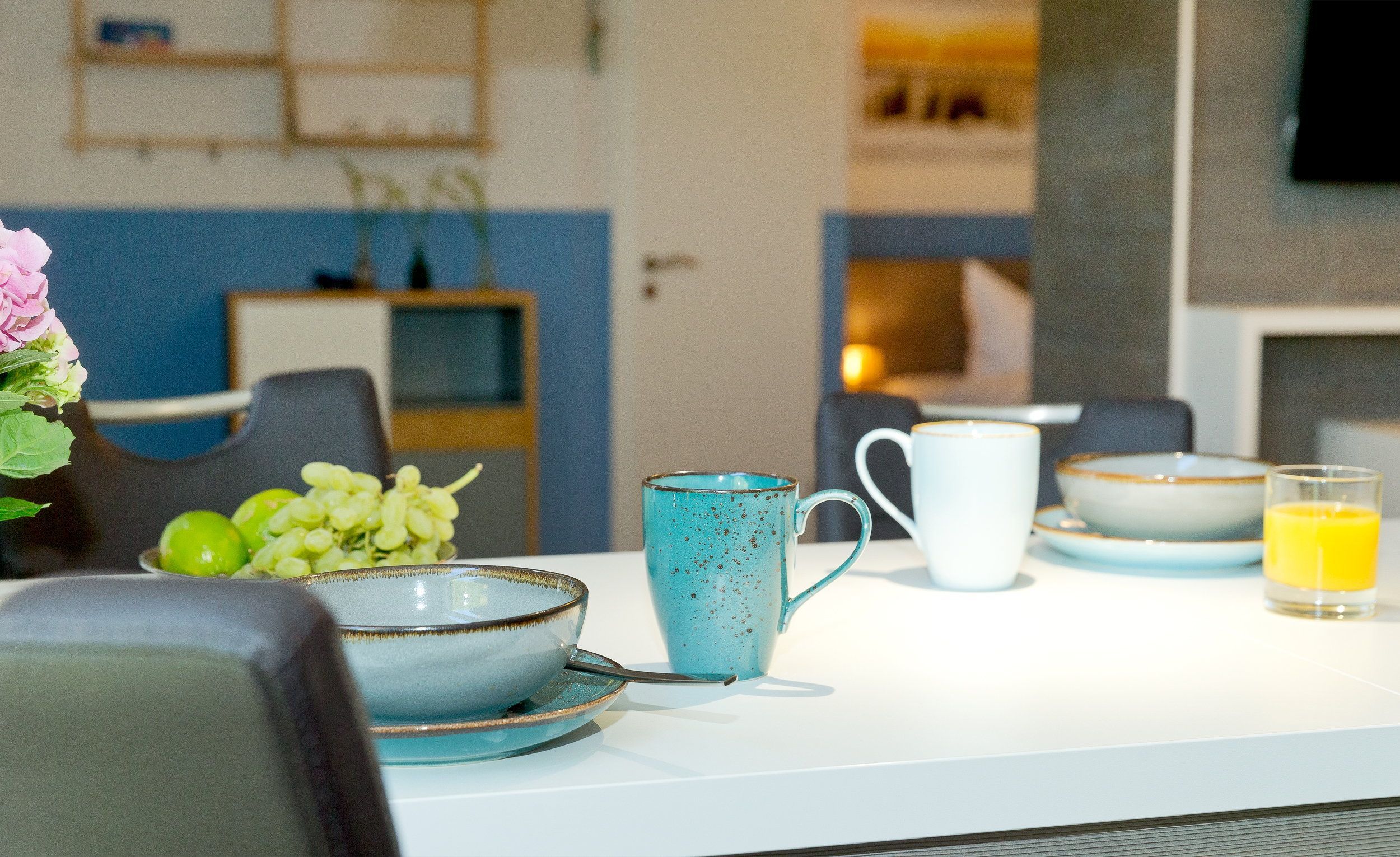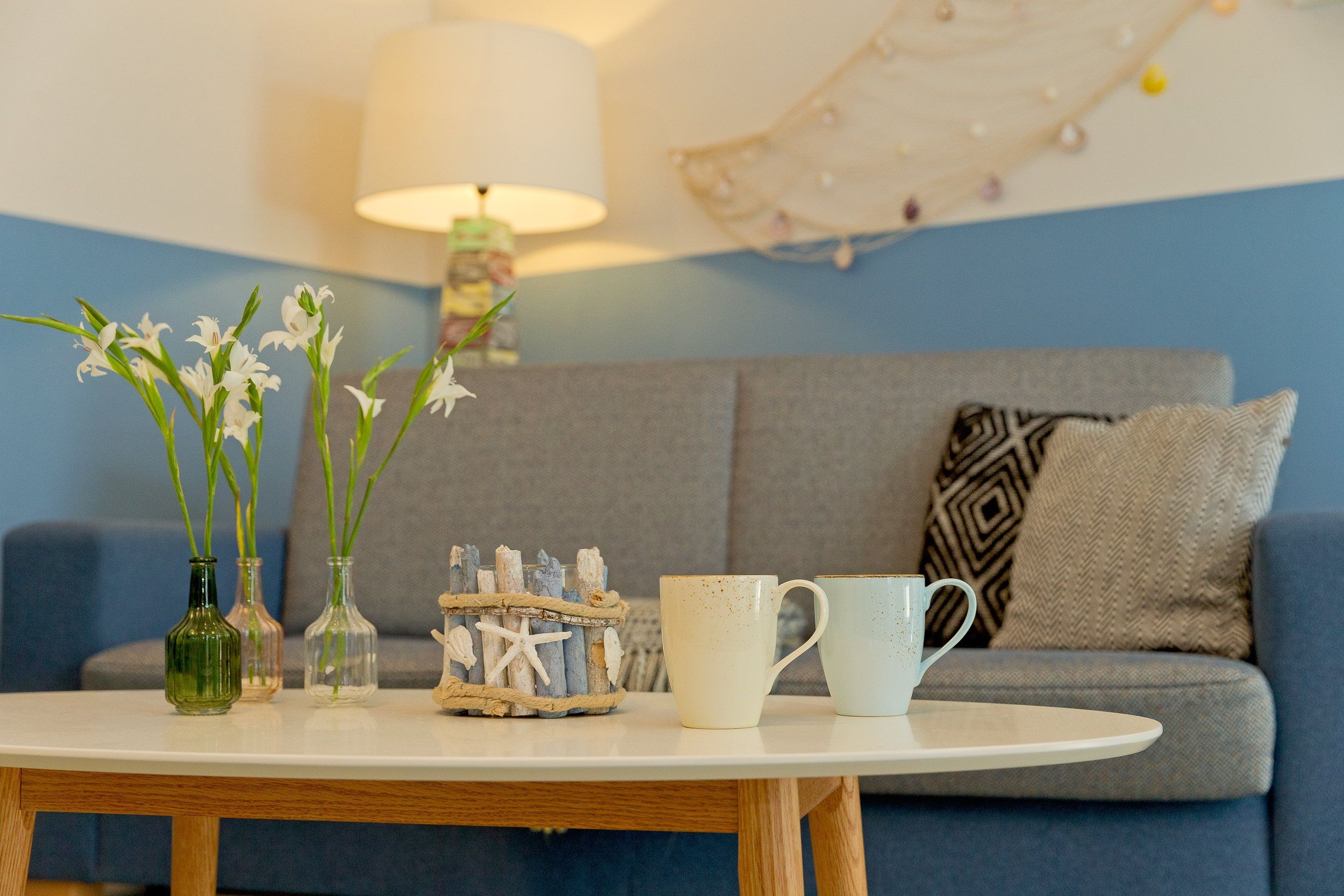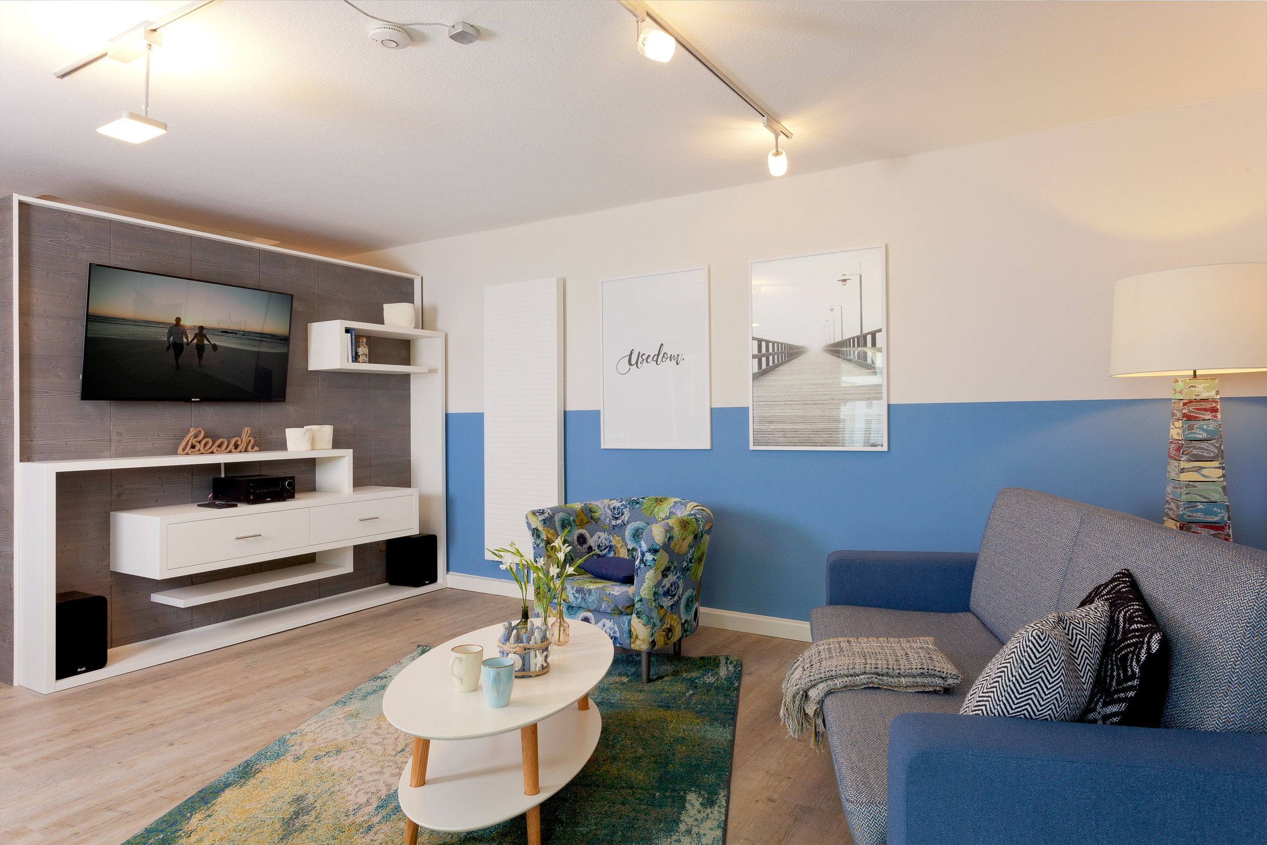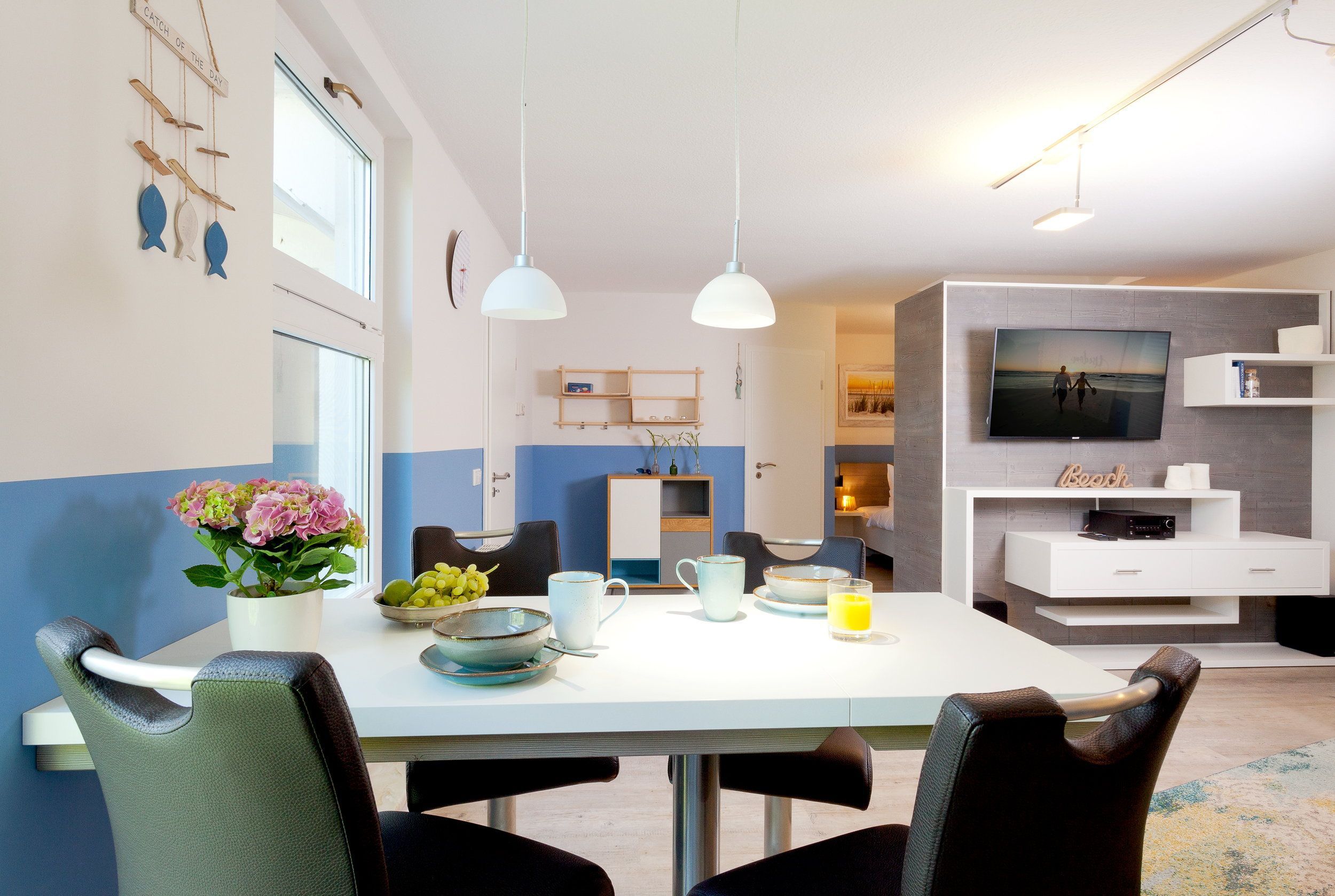 Der Wohnbereich verfügt über eine gemütliche Couch und Flachbild TV sowie einem Esstisch mit Sitzgelegenheit für bis zu vier Personen. Die bequeme Couch kann mit wenigen Handgriffen zu einem Schlafplatz für zwei Gäste umgewandelt werden.