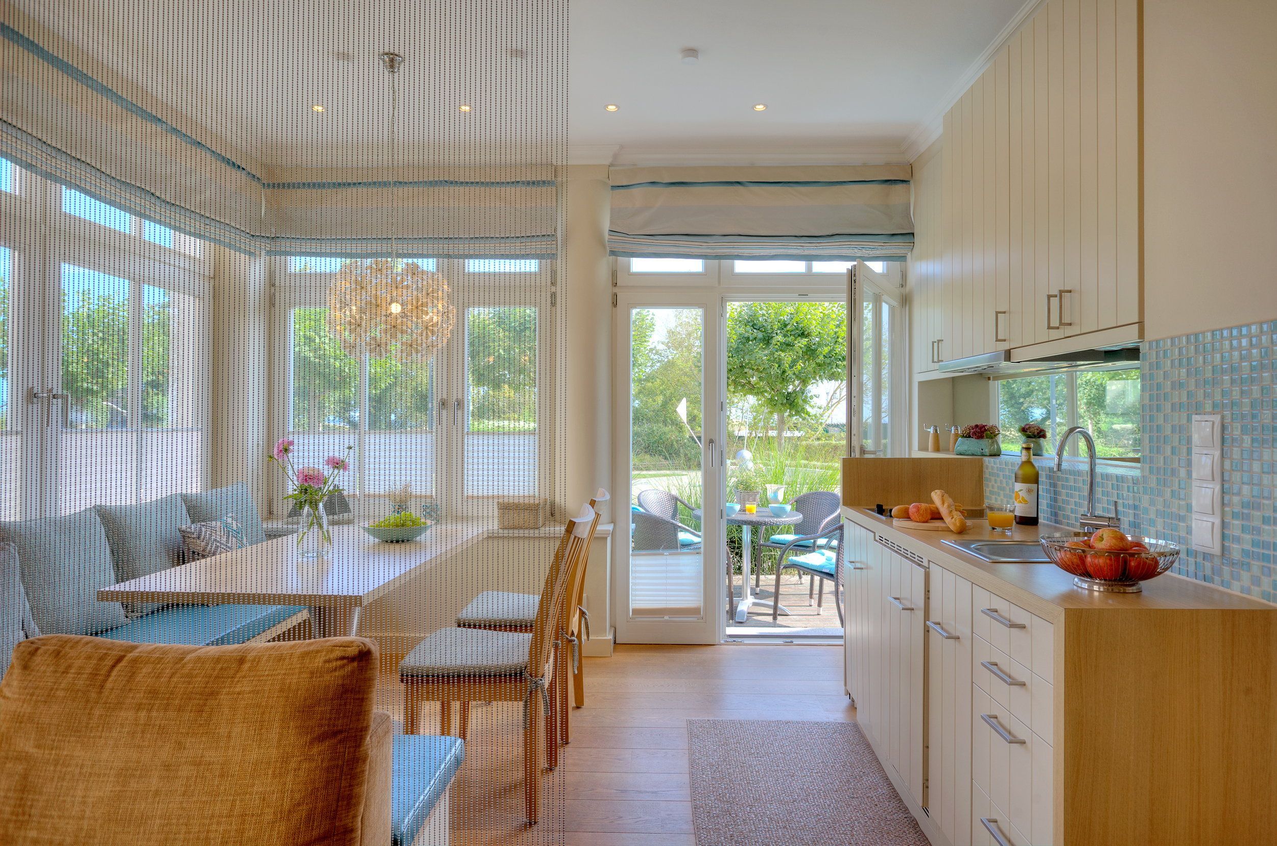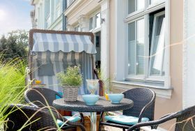 Vom Wohnbereich betreten Sie Ihre private Nordost-Terrasse mit eigenem Strandkorb, von der Sie eine wundervolle Sicht auf die Ostsee und die Ahlbecker Promenade haben. In der Loggia ist eine gut ausgestattete Küche mit Ceranfeld, Mikrowelle (mit Grillfunktion), Kühlschrank mit Gefrierfach und Geschirrspüler integriert. Der Wohnbereich und die Loggia können durch einen dekorativen Vorhang optisch voneinander getrennt werden.