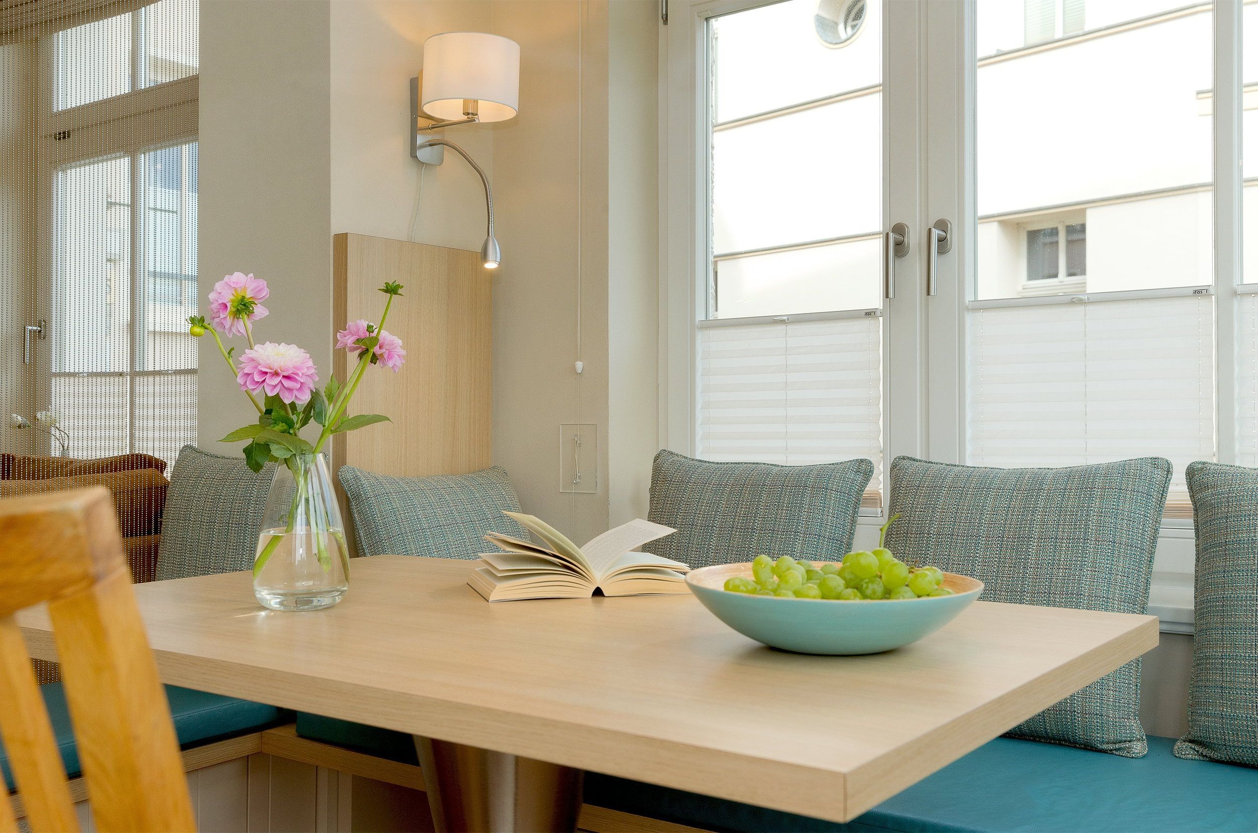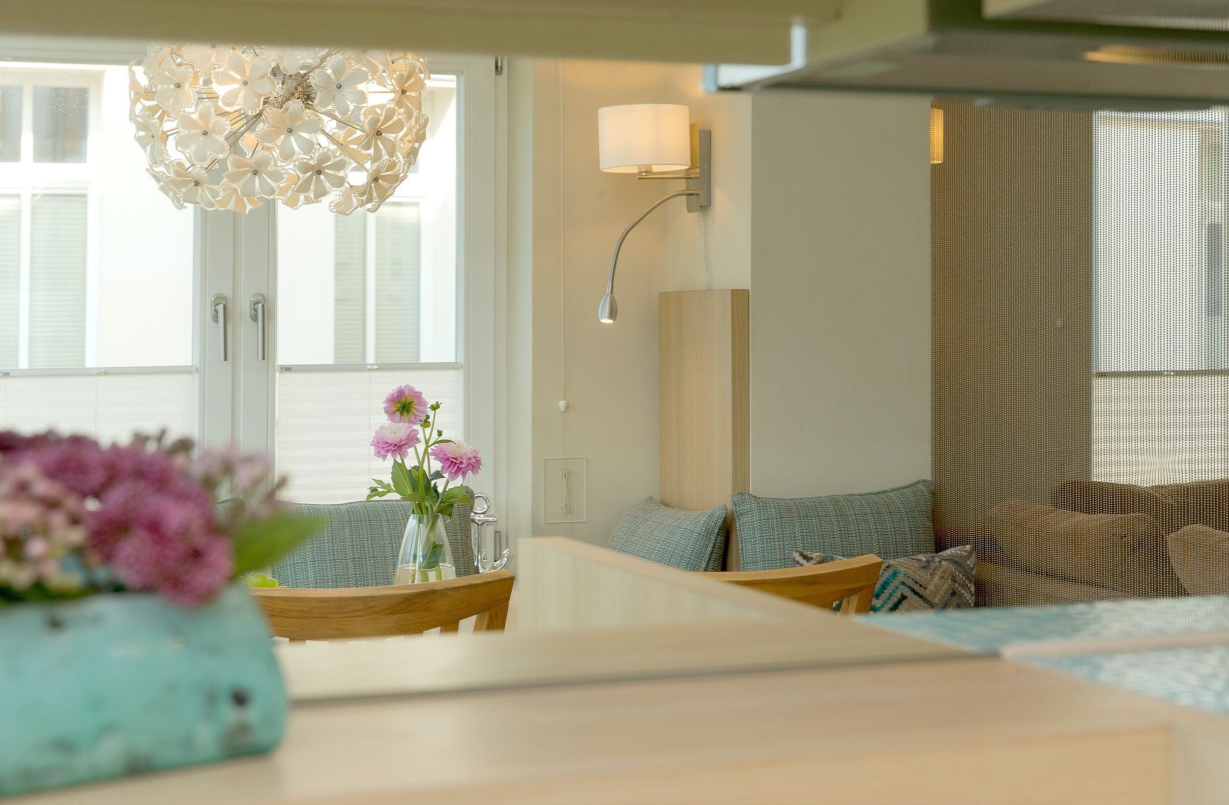 Das Appartement wurde von der professionellen Hand eines Innenarchitekten eingerichtet. Die farbliche Gestaltung in Pastell und Blau zaubert ein Ambiente von Strand und Meer in Ihre Ferienwohnung. Der Wohnbereich ist mit einem Flachbildfernseher, DVD-Player und einer gemütlichen Polstersitzecke ausgestattet, die zum Erholen einlädt.