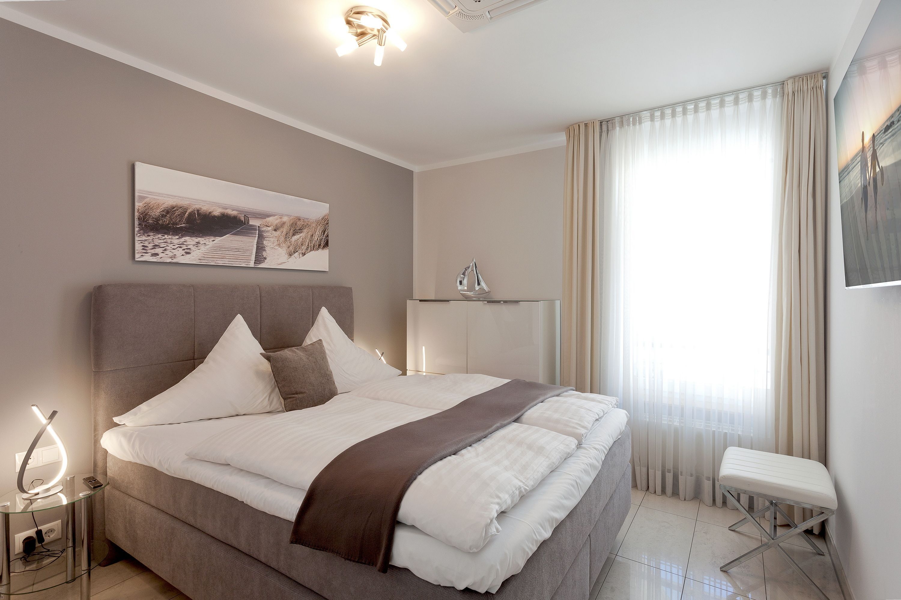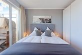 Vom Wohnbereich aus erreichen Sie den Nordostbalkon, der einen wundervollen Blick auf das glitzernde Meer und die Ahlbecker Seebrücke preisgibt. Der Strandkorb bietet den idealen Ruheort. Das Schlafzimmer ist mit einem Boxspringbett (160 x 200cm / durchgehende Matratze) und einem geräumigen Schrank für Ihr Hab und Gut ausgestattet. Auch vom Schlafzimmer haben Sie eine wundervolle Sicht auf die Ostsee und die Möglichkeit auf den Balkon zu gelangen. Das zweite Schlafzimmer ist ebenfalls mit einem hochwertigen Boxspringbett (160 x 200cm / zwei getrennte Matratzen) ausgestattet. Alle Wohn- und Schlafräume verfügen über einen Flat TV. Das exquisite Badezimmer besitzt eine bodengleiche Echtglasdusche, ein WC und ein Haartrockner sowie einen großen Waschtisch mit zwei Wasserhähnen und viele kleine Extras.