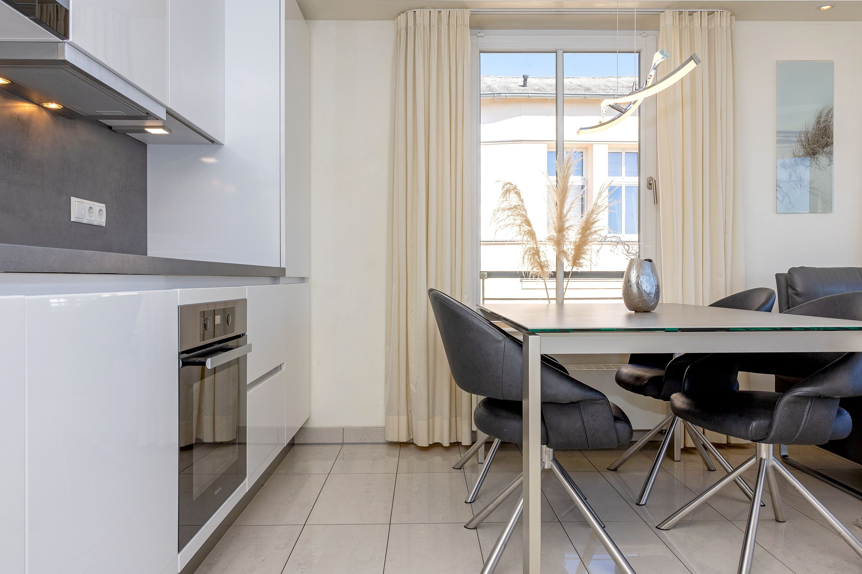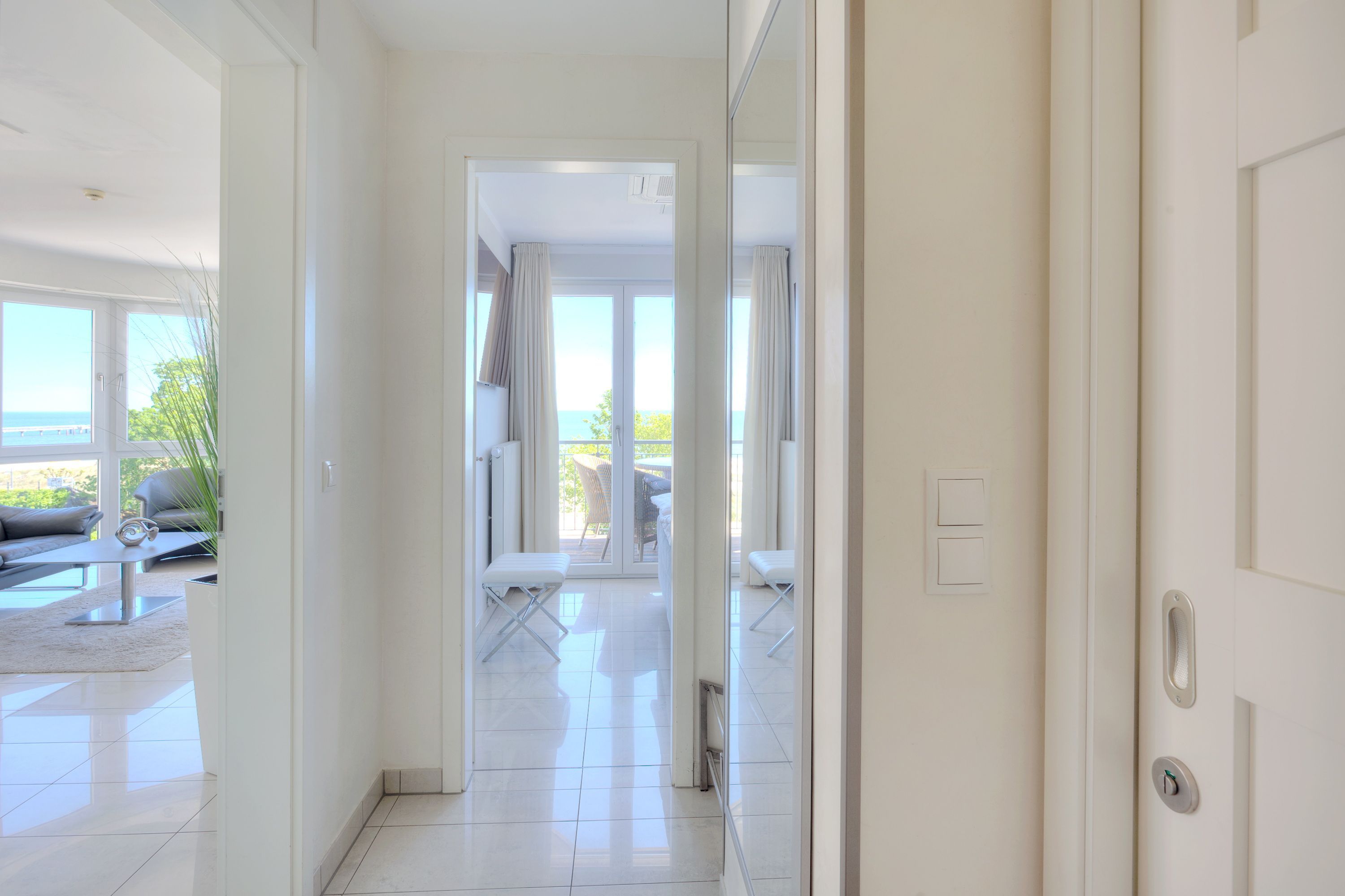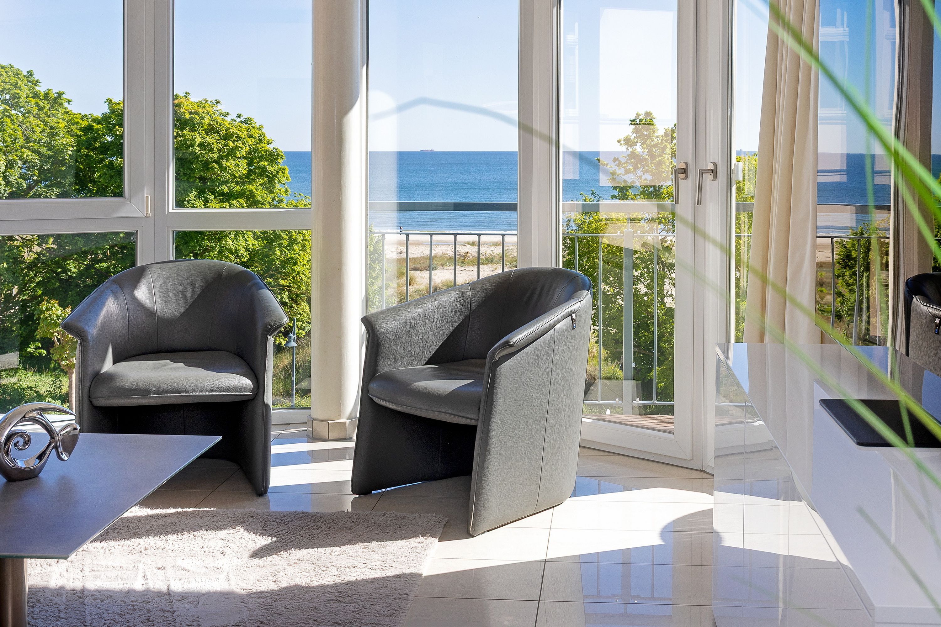 Das 55 Quadratmeter große 3-Zimmer-Appartement ist im 2. Obergeschoss der Villa Louise gelegen und das ideale Urlaubsdomizil für Familien. Bis zu vier Personen haben in dem luxuriösen Appartement Platz. Der kombinierte Wohn- und Kochbereich ist mit viel Liebe zum Detail eingerichtet und wartet mit jeglichen Raffinessen auf, die das Herz begehrt. Der Fußboden ist aus hochwertigem Feinsteinzeug gefertigt und mit einer Fußbodenheizung versehen. Die Klimaanlage sorgt stets für die richtige Wohlfühltemperatur. Die integrierte Küchenzeile verfügt über Induktionkochfeld, Mikrowelle, Backofen, Spülmaschine, Kühlschrank mit Gefrierfach, Wasserkocher, Toaster, Kaffeemaschine, so dass Sie für die Zubereitung Ihrer Lieblingsspeisen alle Utensilien zur Hand haben. Der Wohnbereich lockt mit einer edlen Ledersitzecke, in der Sie sich entspannen können und von der Sie einen einzigartigen Panoramablick auf die Ostsee genießen.