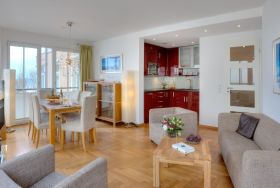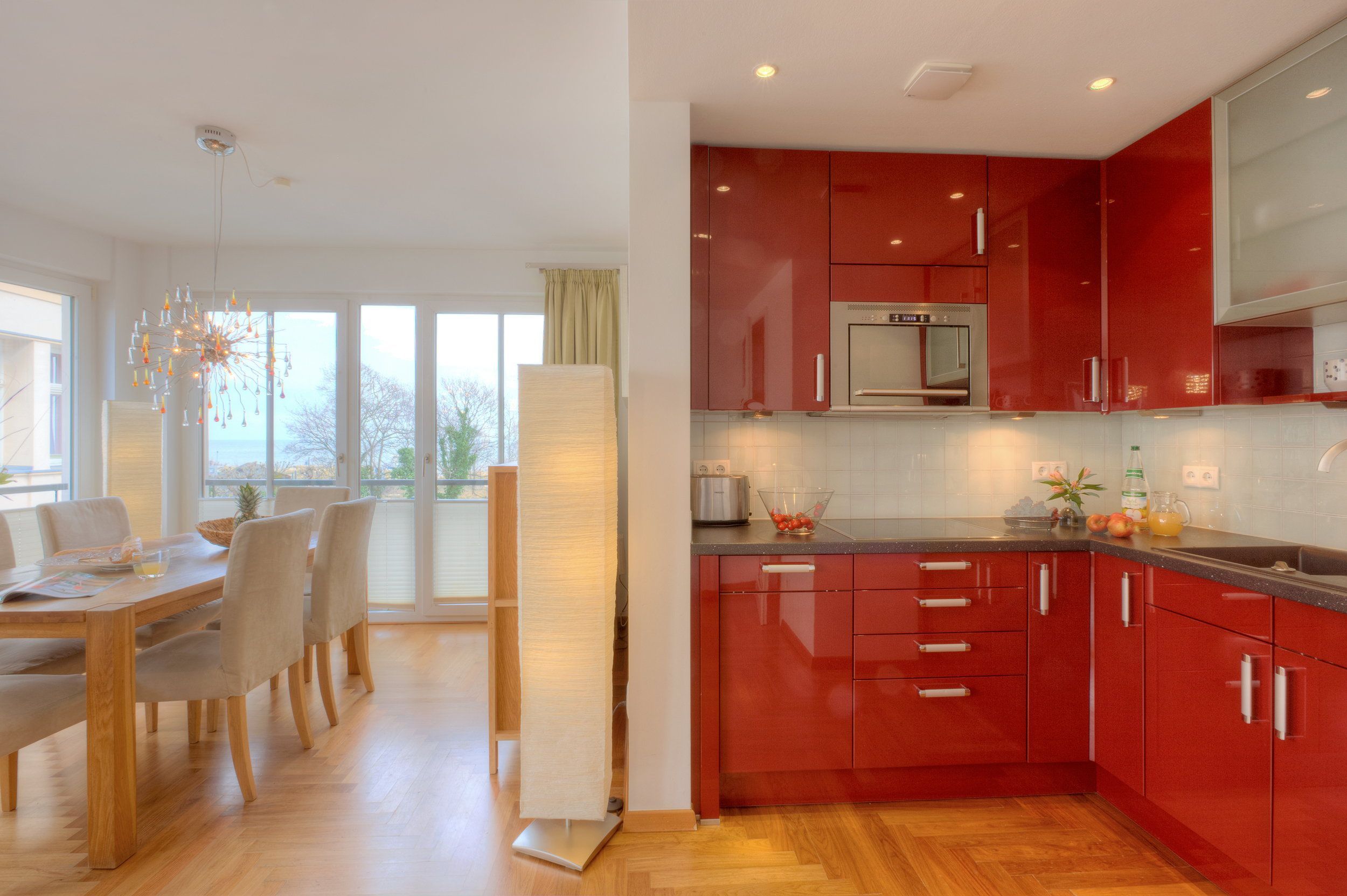 Der Wohn- und Essbereich besticht mit einer großen Fensterfront, die Ihnen den Blick auf die glitzernde Ostsee preisgibt. Auf der Couch können Sie es sich nach einem erlebnisreichen Tag auf der Insel Usedom so richtig gemütlich machen. Und dank des Flachbildfernsehers müssen Sie im Urlaub nicht auf Ihre Lieblingssendung verzichten. Die luxuriöse Küche bietet jeglichen Komfort (Kühlschrank mit Gefrierfach, Geschirrspüler, Mikrowelle mit Backfunktion, Wasserkocher, Toaster, Kaffeemaschine), den Sie für die Zubereitung Ihrer Lieblingsspeisen benötigen. Für die Nachtruhe steht ein komfortables Boxspringbett (160 x 200cm / durchgehende Matratze) für Sie bereit. Vom Schlafzimmer erreichen Sie den Balkon, der durch seine Südwestausrichtung ideal zum Sonnenbaden ist. Im zweiten Schlafzimmer befinden sich zwei Einzelbetten (je 90 x 200cm). Beide Schlafzimmer sind zusätzlich mit einem Flat TV ausgestattet.